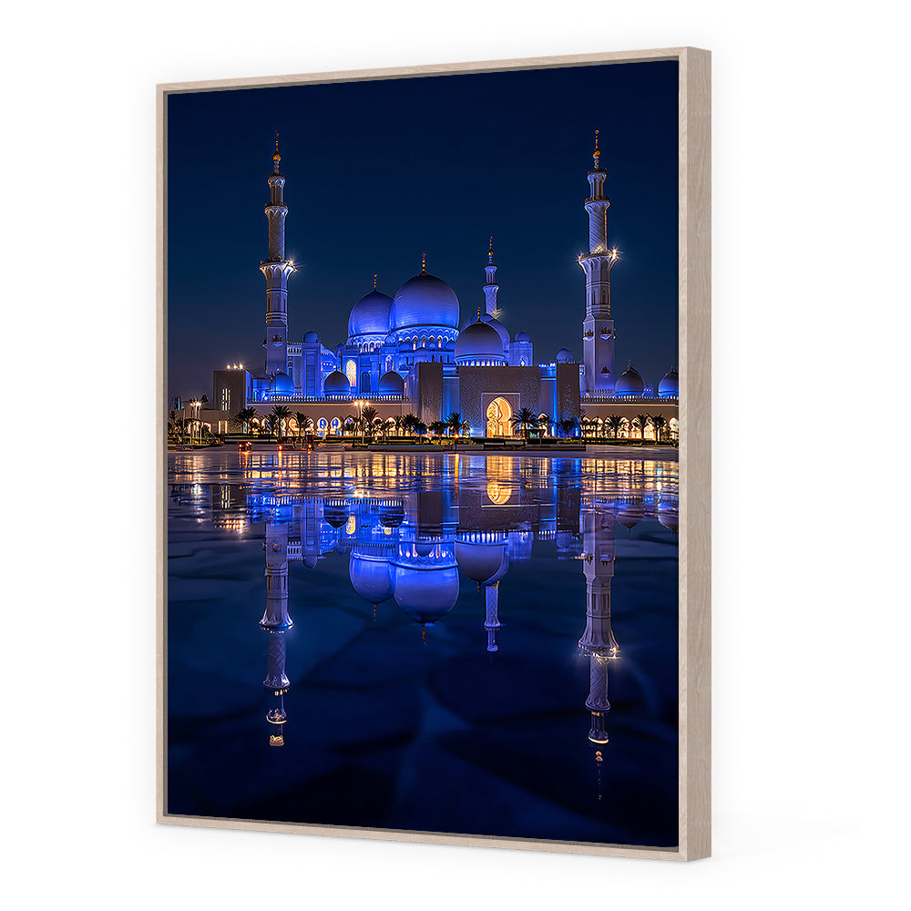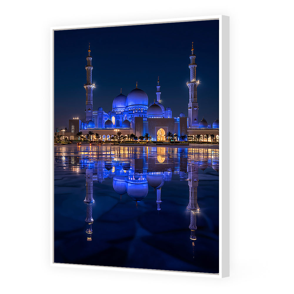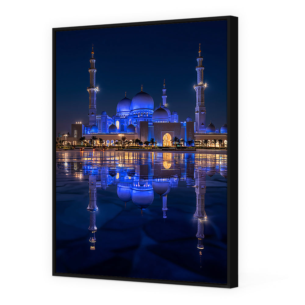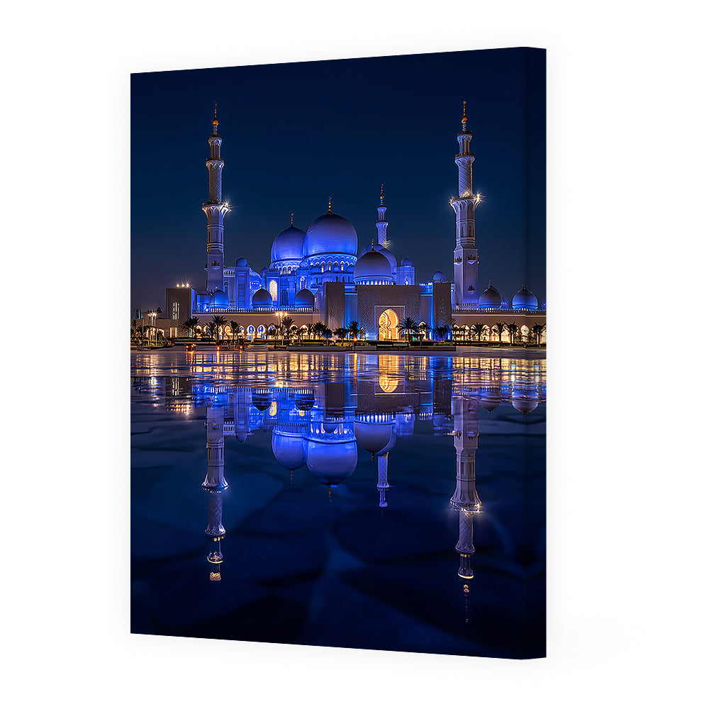 Elegant nocturnal reflection of an illuminated mosque, capturing architectural and spiritual beauty.