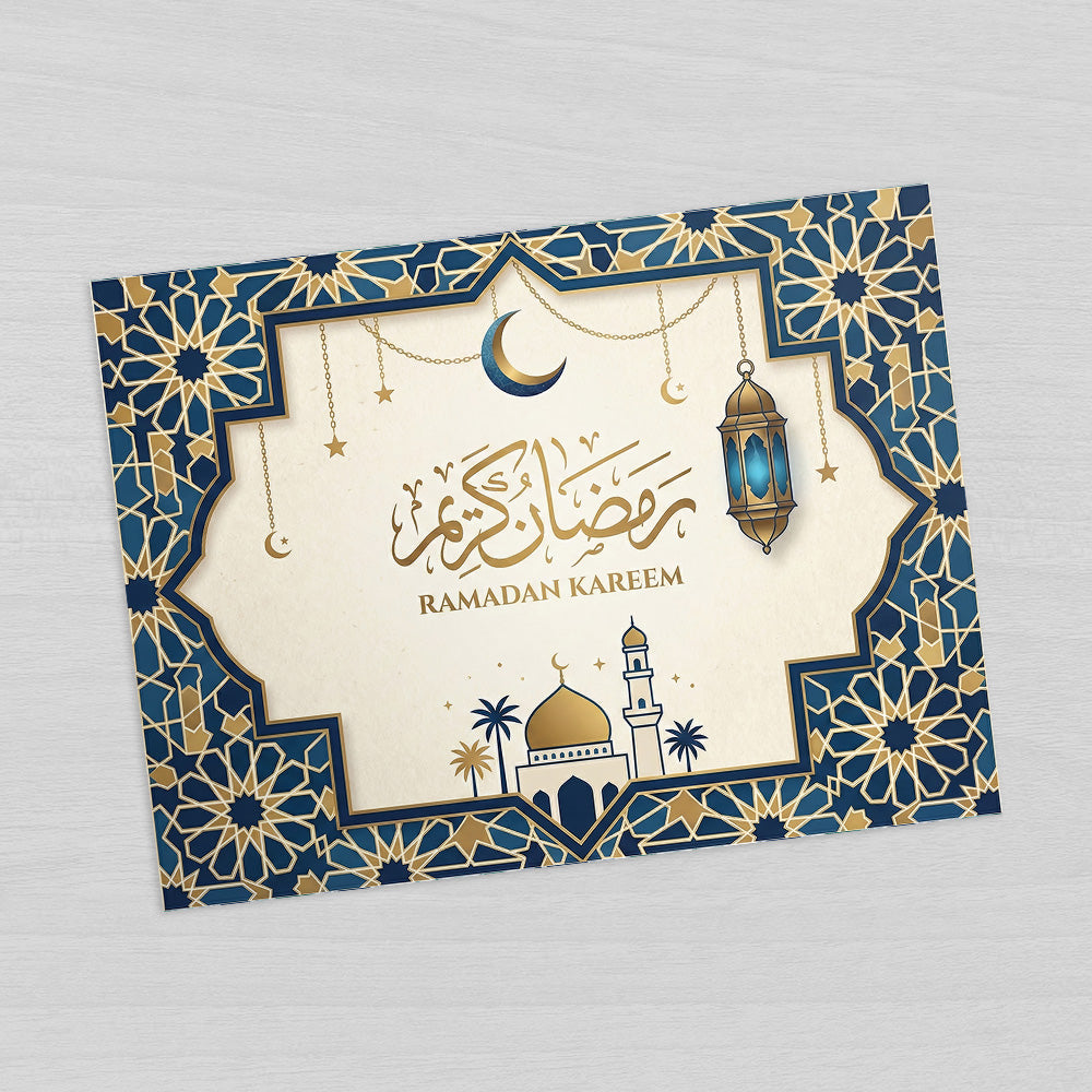 Mosquée dorée sous un croissant de lune avec lanterne suspendue, encadrée d'un somptueux motif géométrique bleu et or.