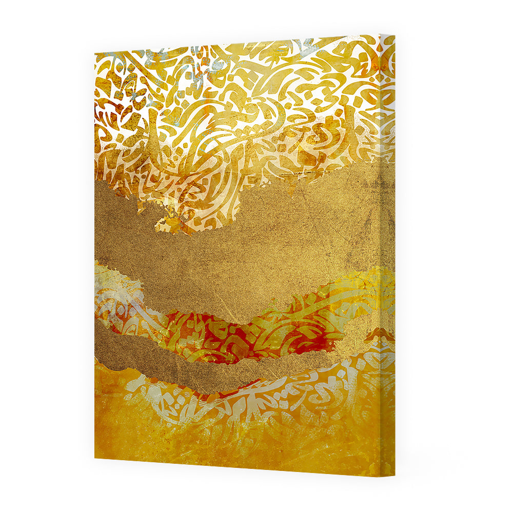 Œuvre abstraite aux motifs dorés et rouges, évoquant des vagues et des arabesques modernes.