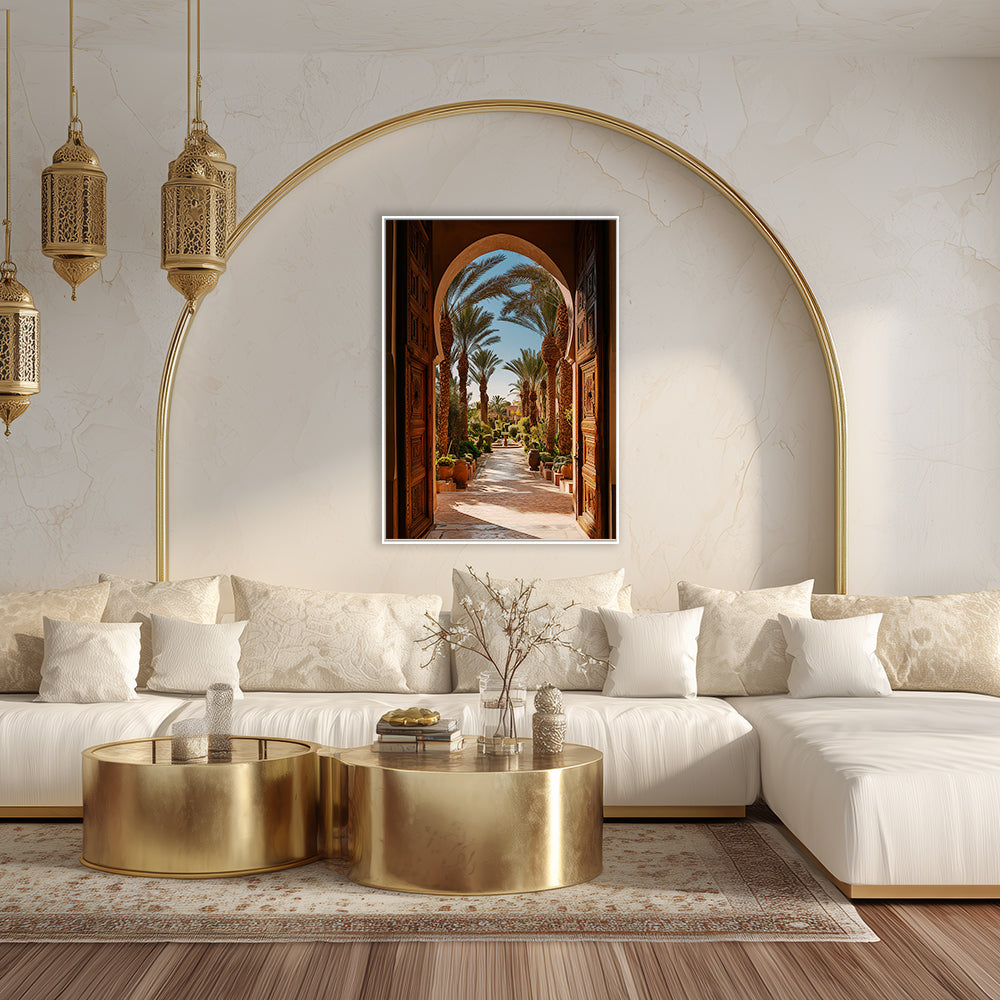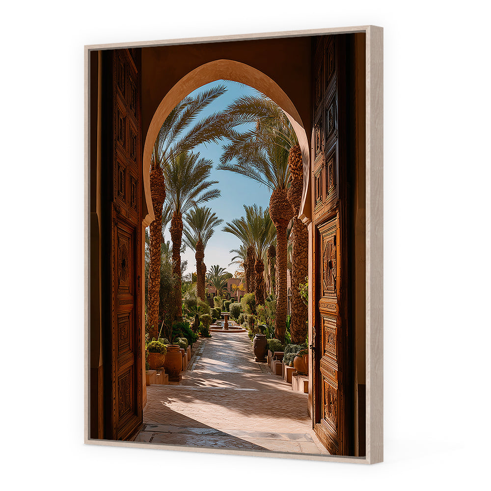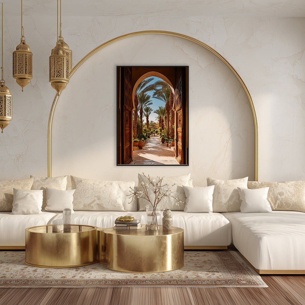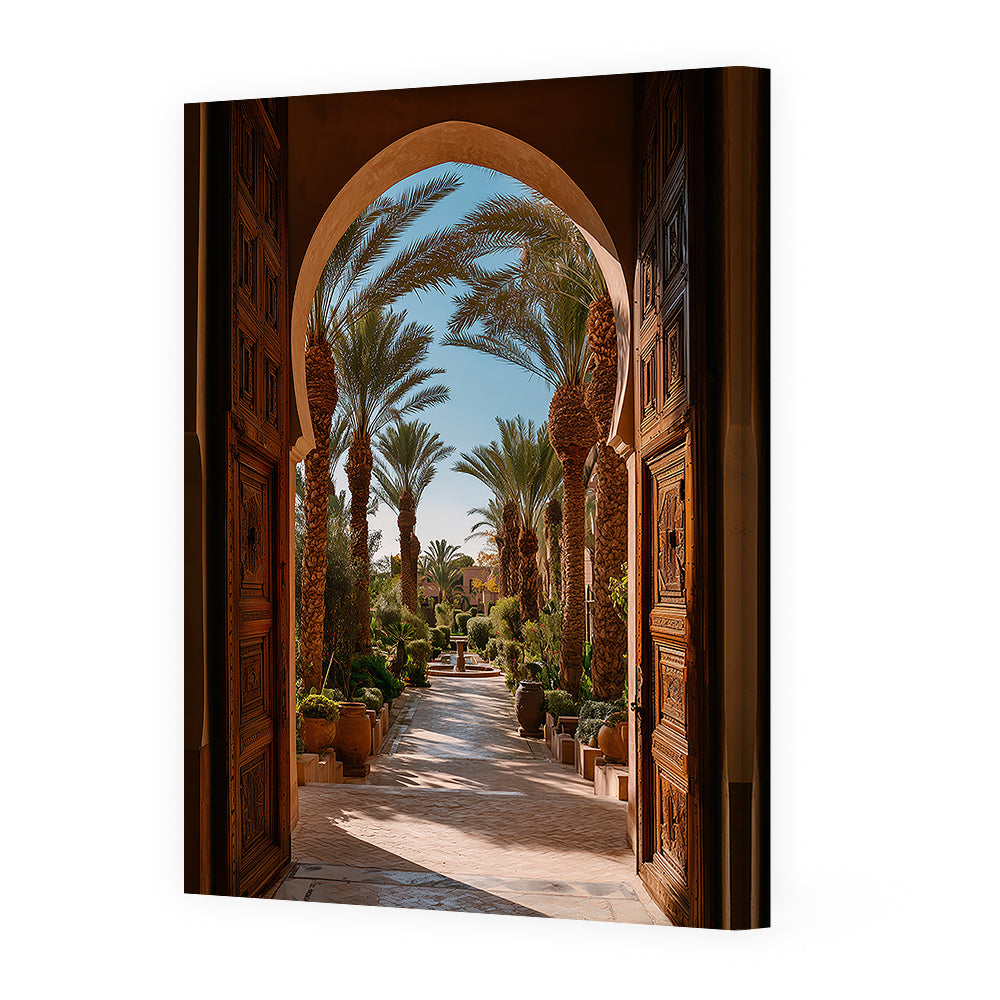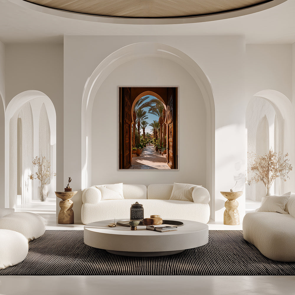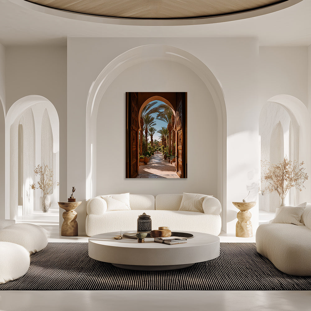 Explorez un jardin exotique à travers une arche majestueuse, baignée de lumière naturelle.