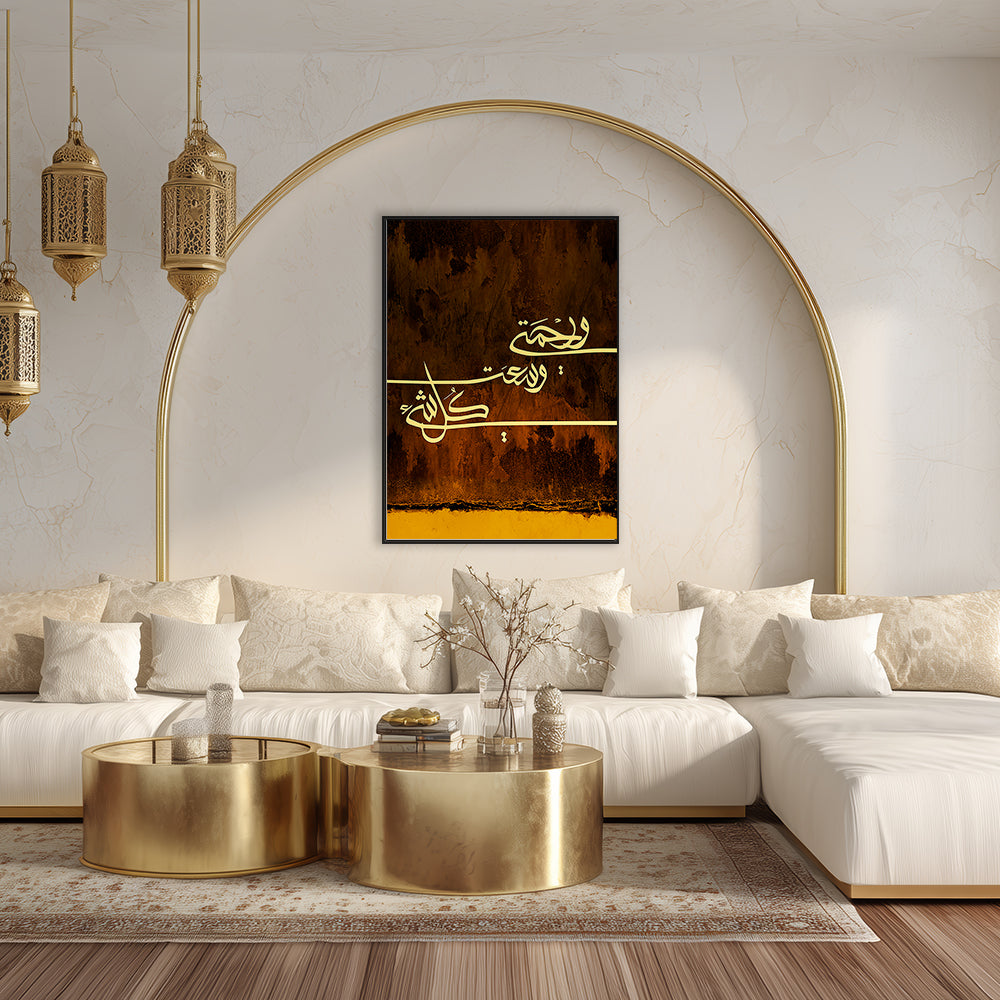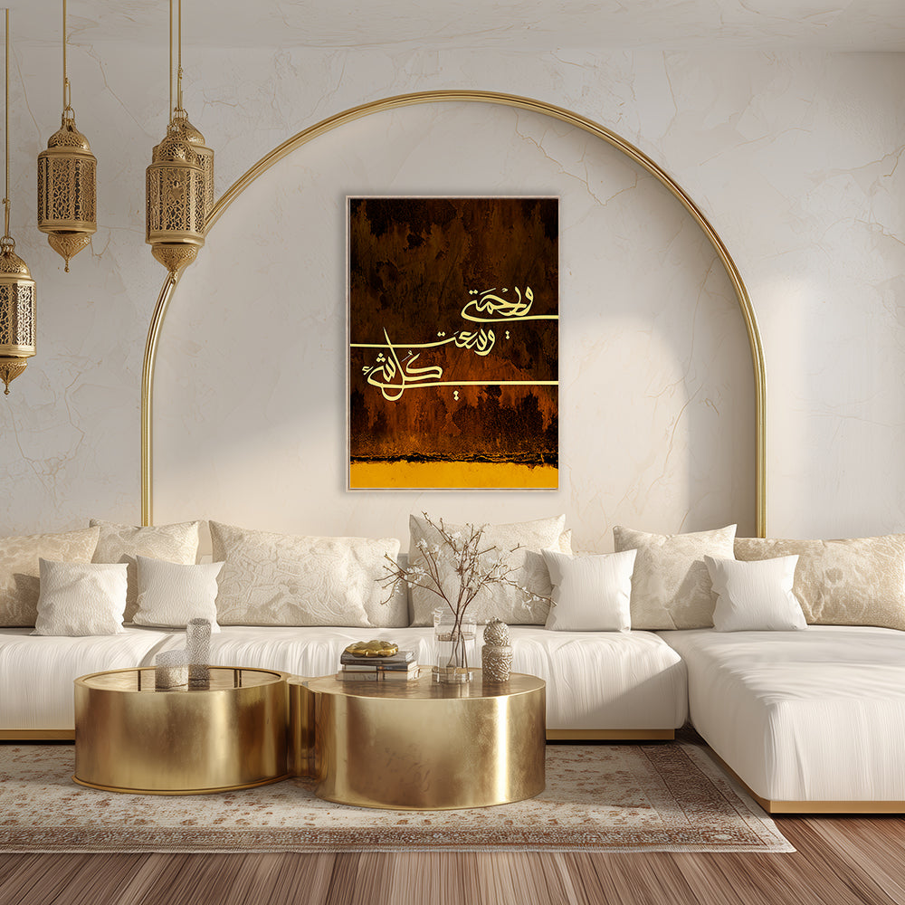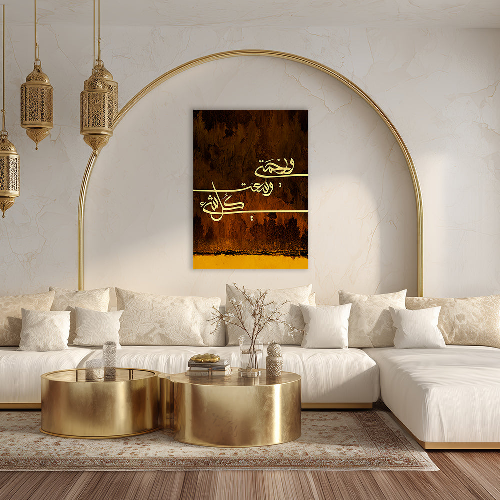 Calligraphie élégante dorée sur fond texturé marron, évoquant tradition et spiritualité.