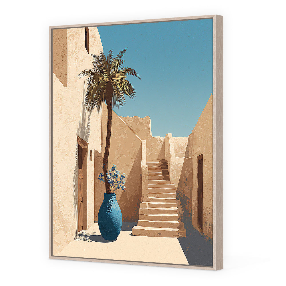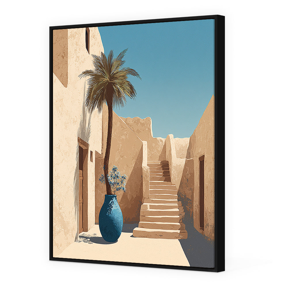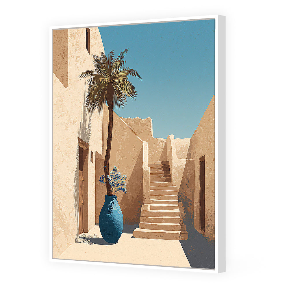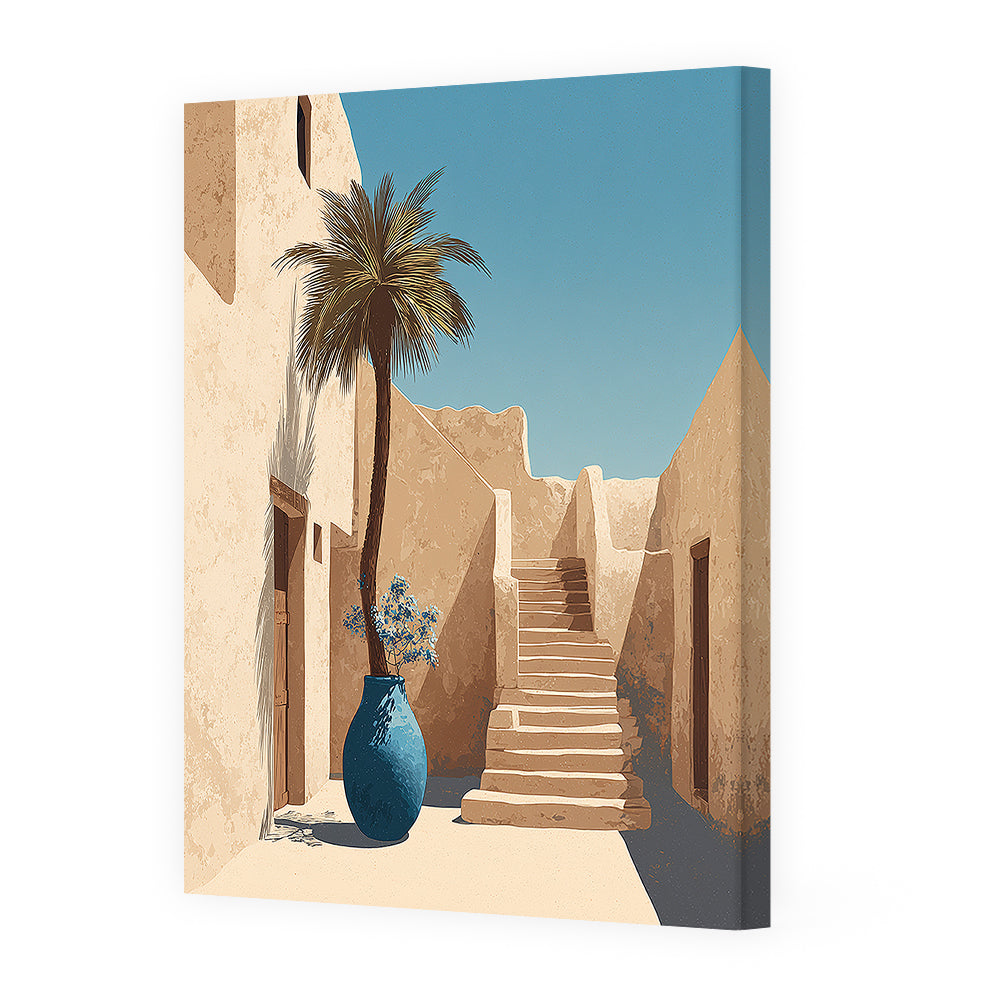 Scène sereine d'une oasis désertique avec un palmier et un escalier ensoleillé.
