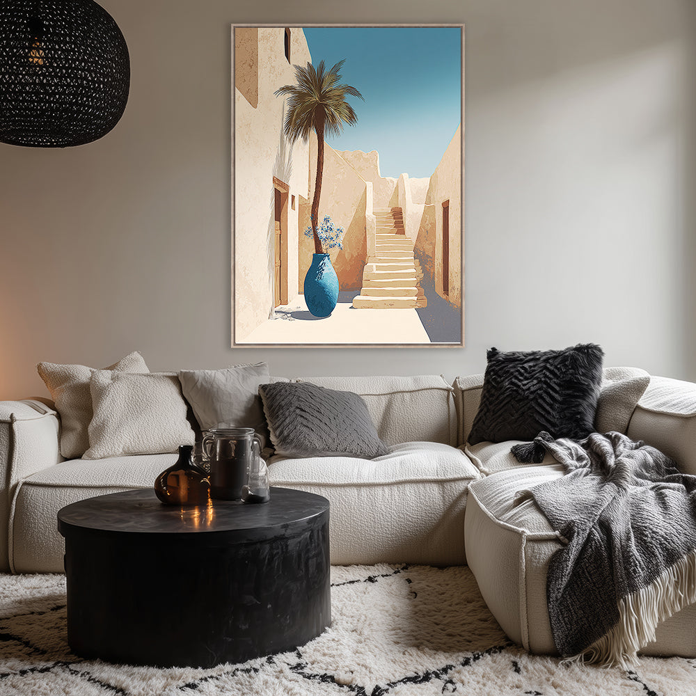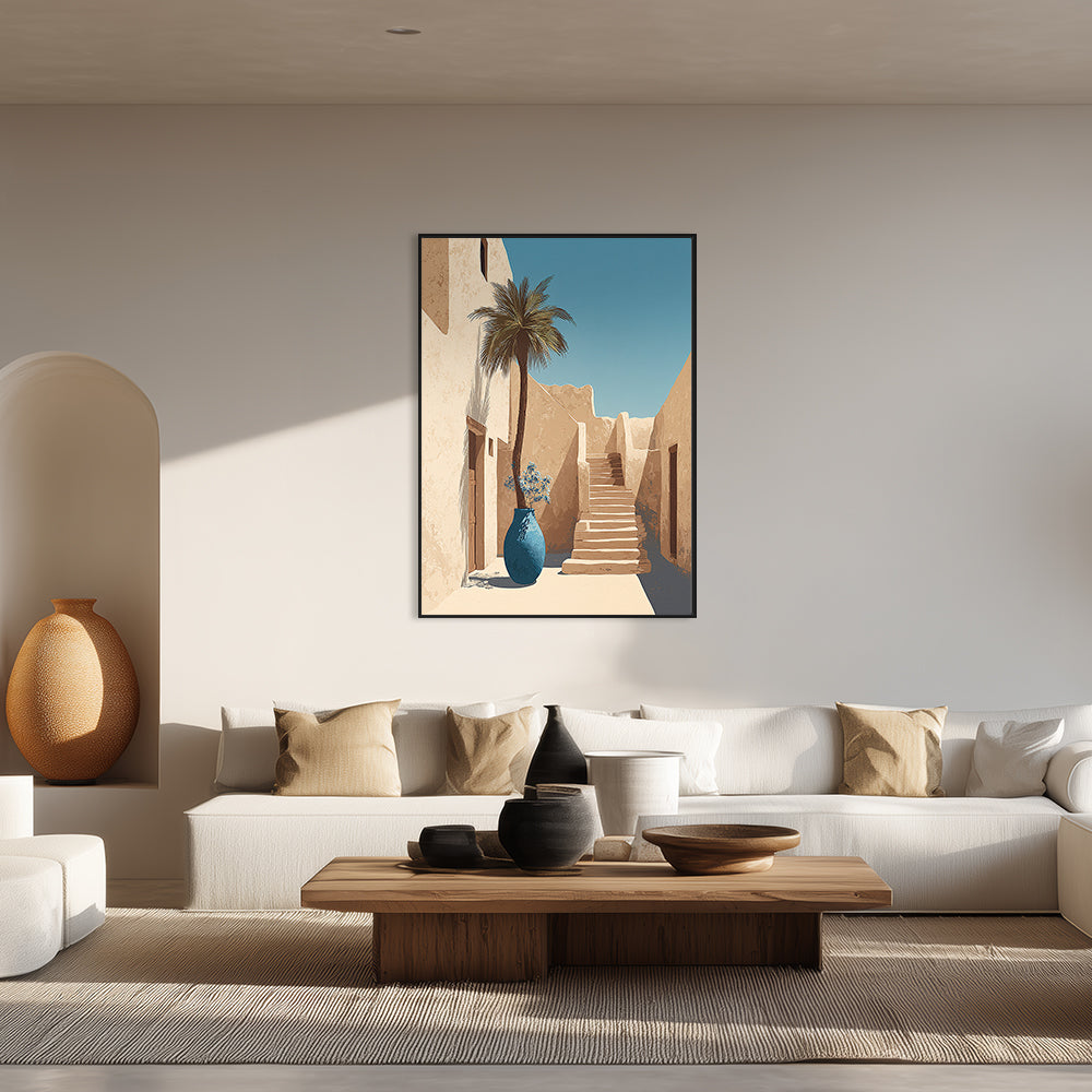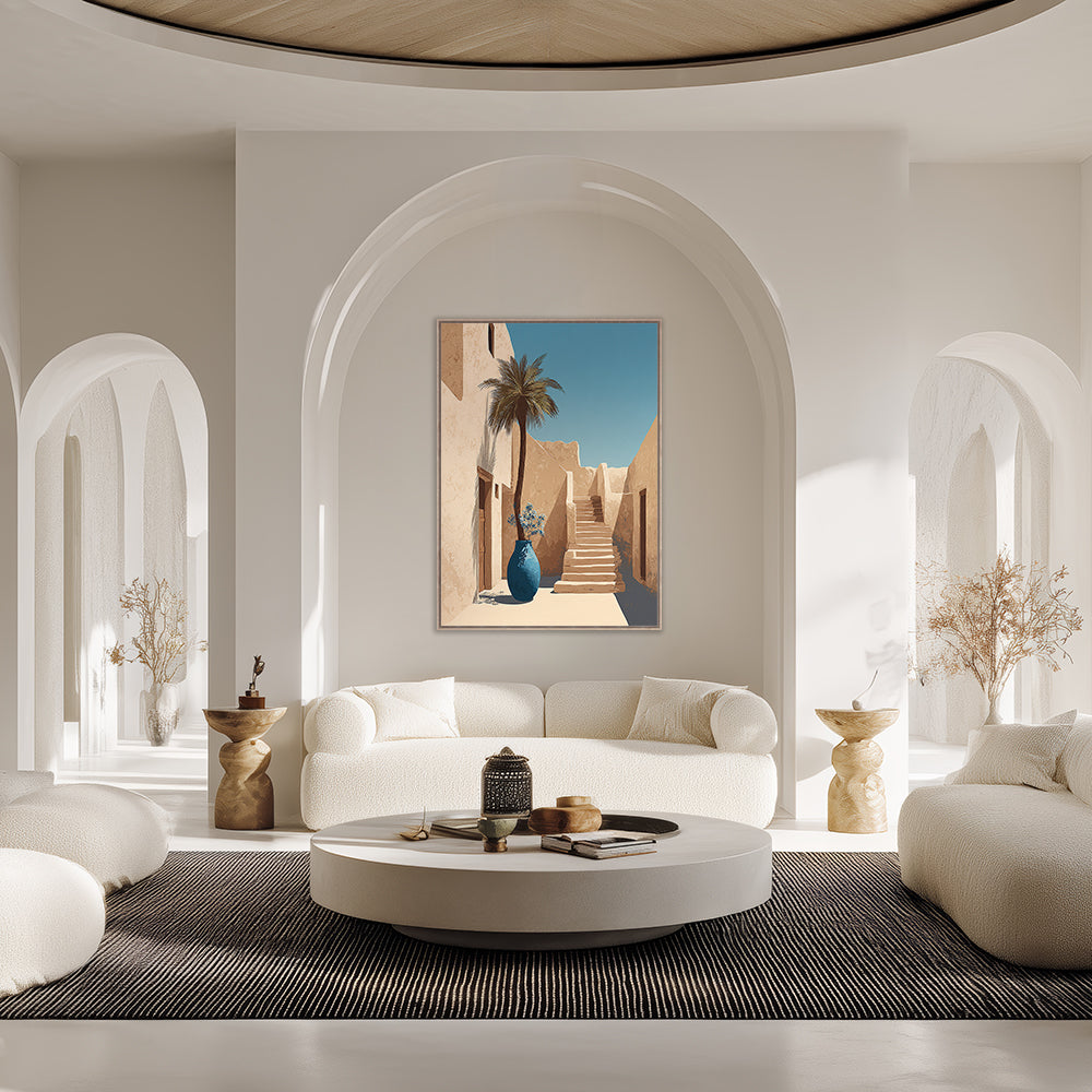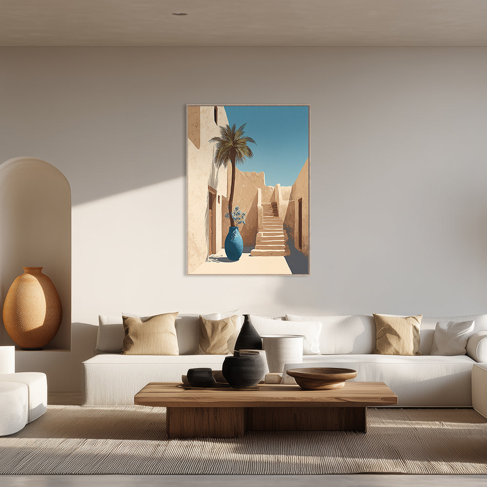 Scène sereine d'une oasis désertique avec un palmier et un escalier ensoleillé.