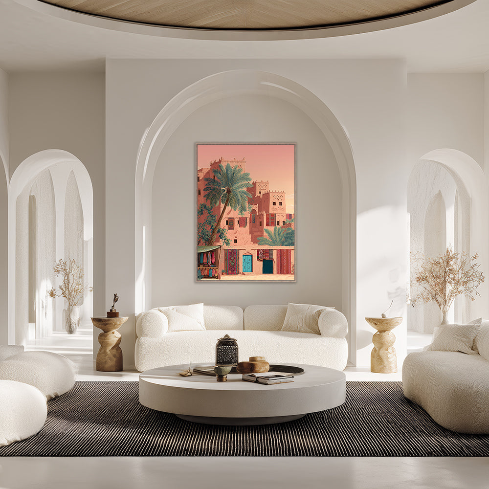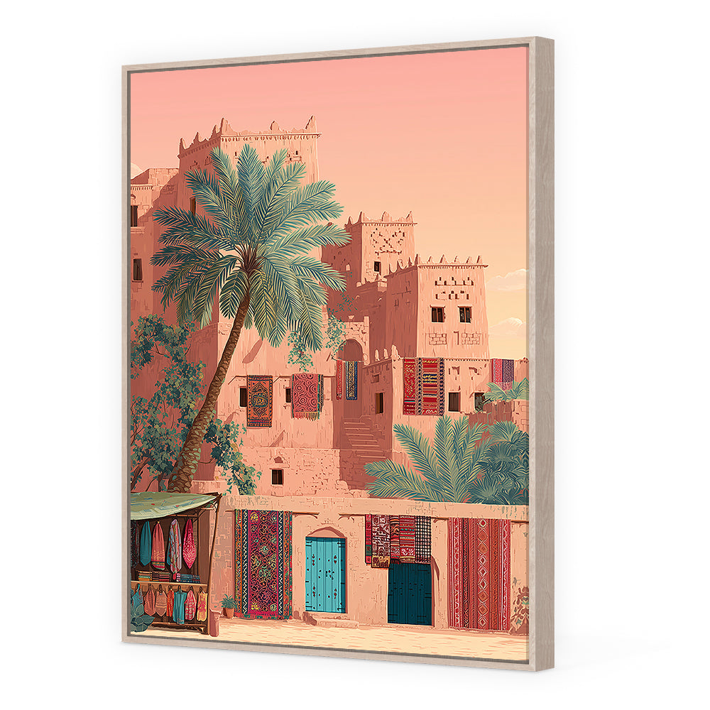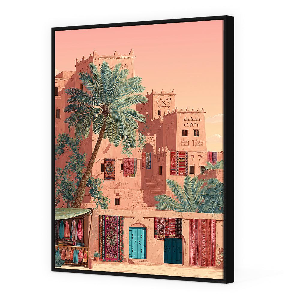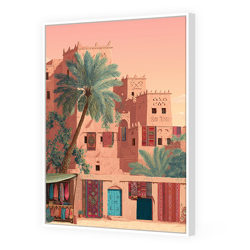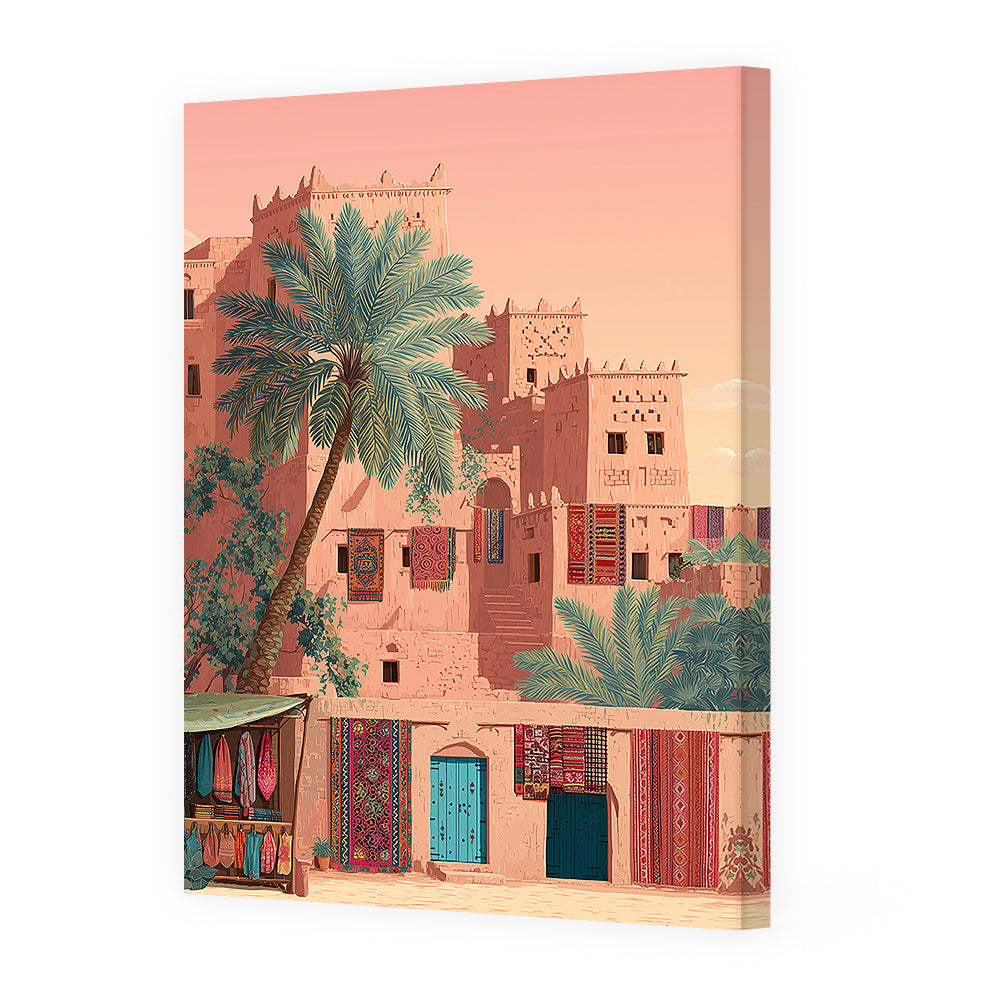 Un village désertique vibrant de couleurs et de textures, évoquant la sérénité et la tradition.