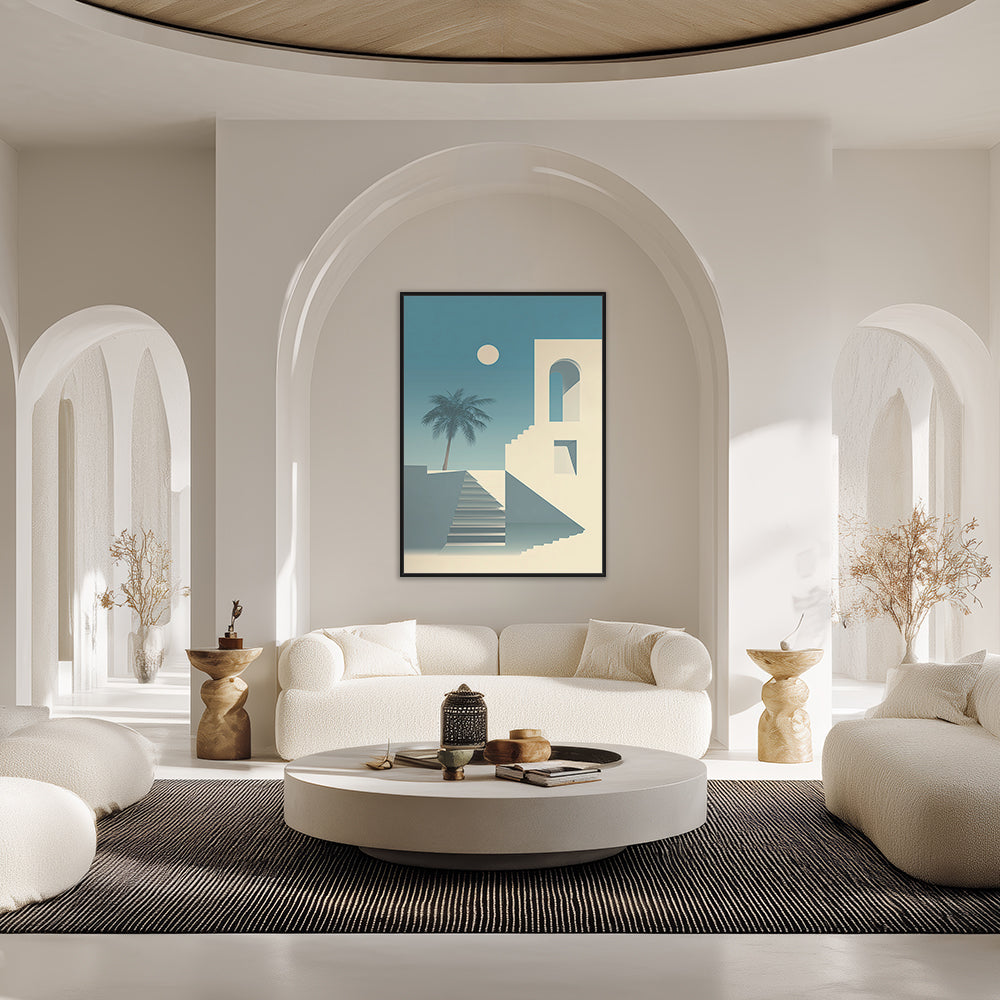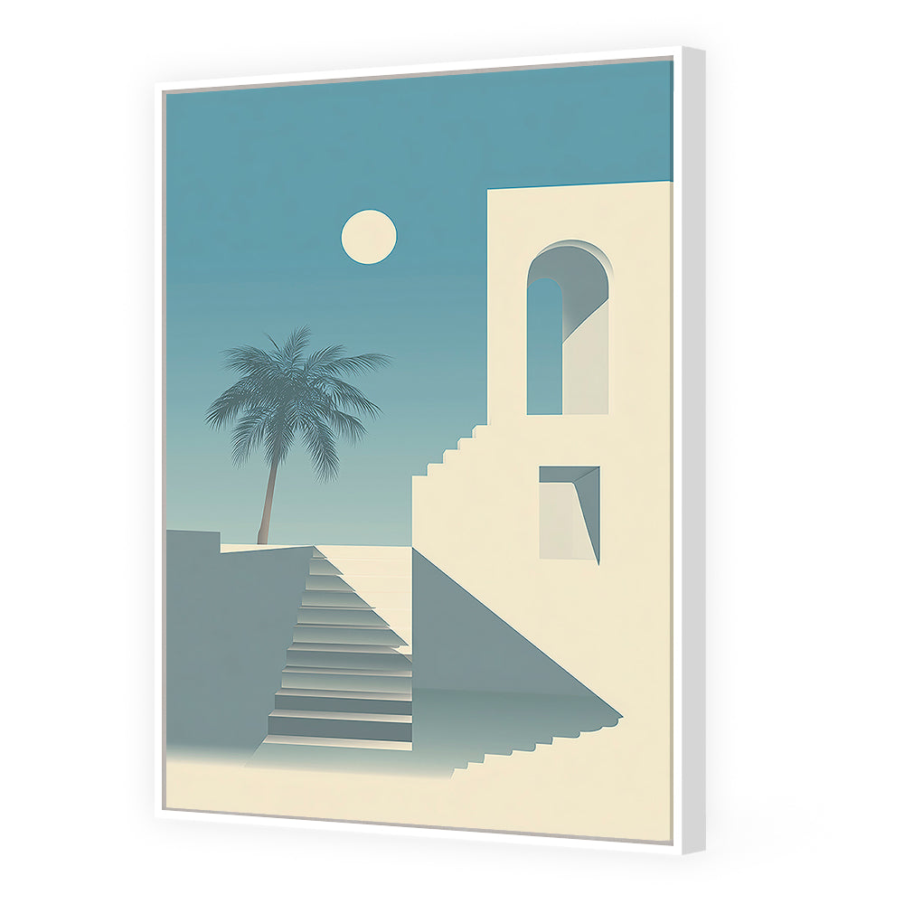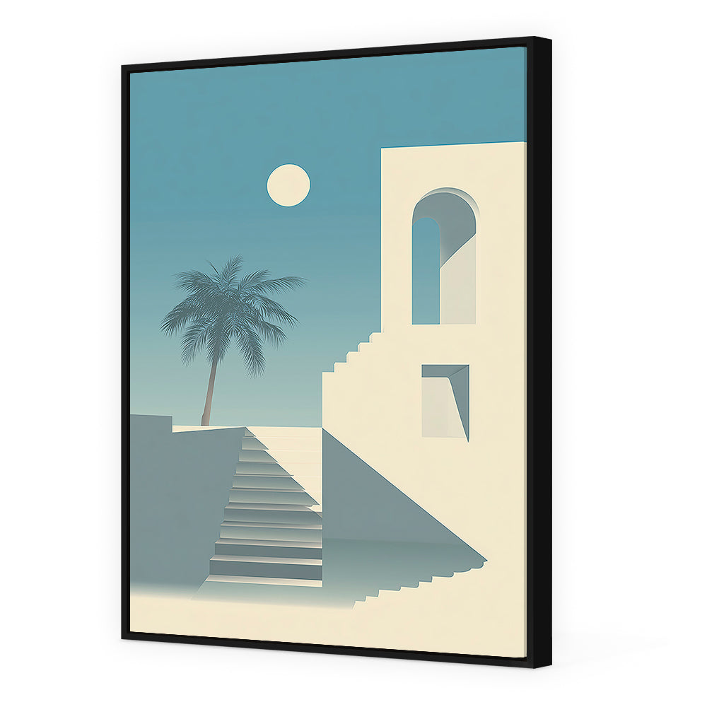 Un paysage moderne et minimaliste avec un escalier et un palmier sous un ciel bleu serein.