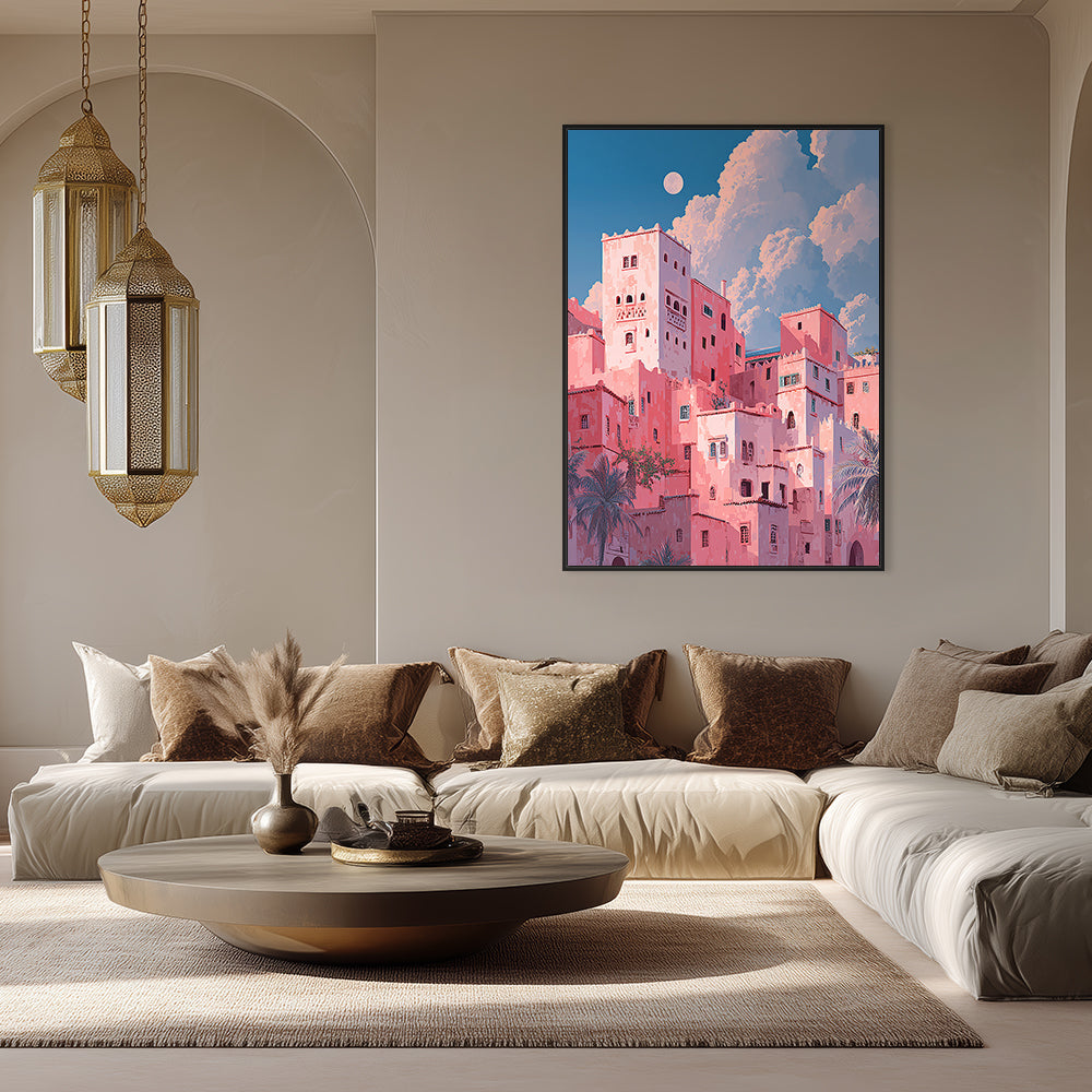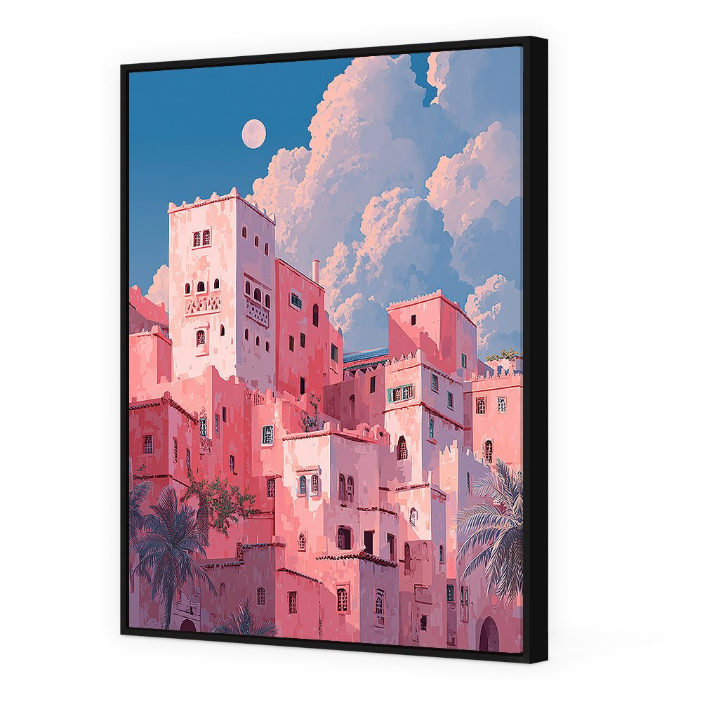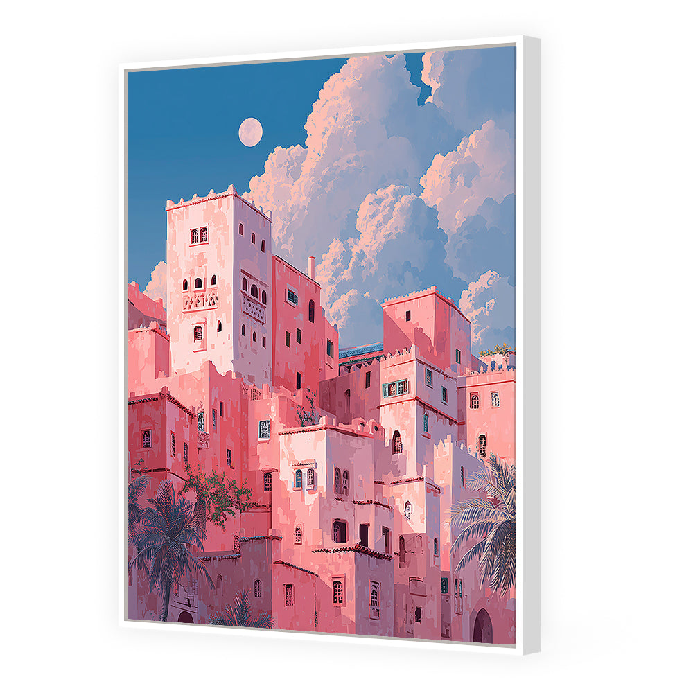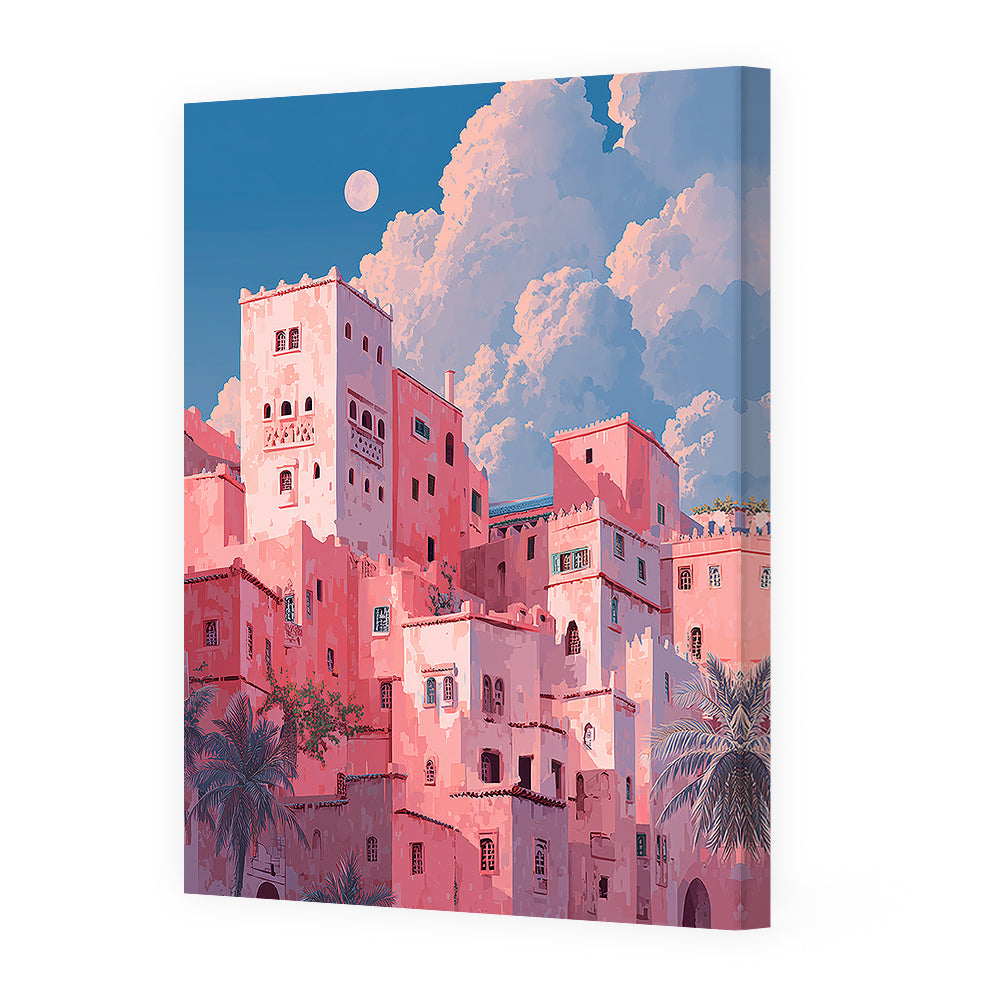 Scène pittoresque d'une ville rose sous un ciel bleu avec des nuages majestueux.