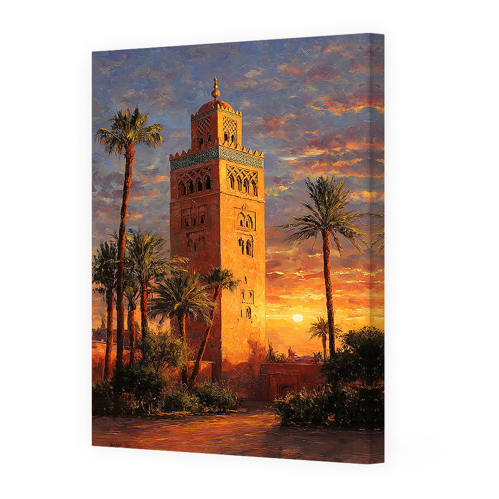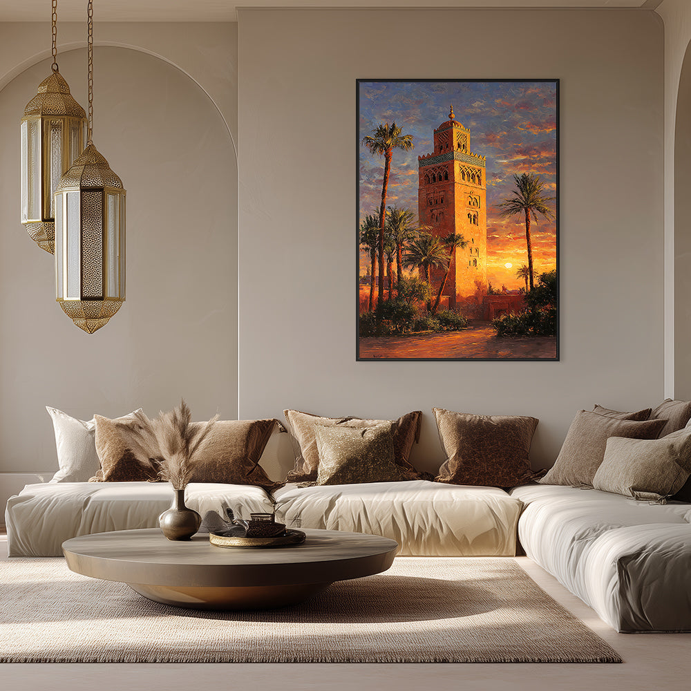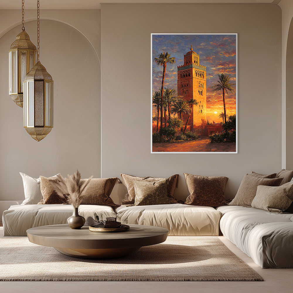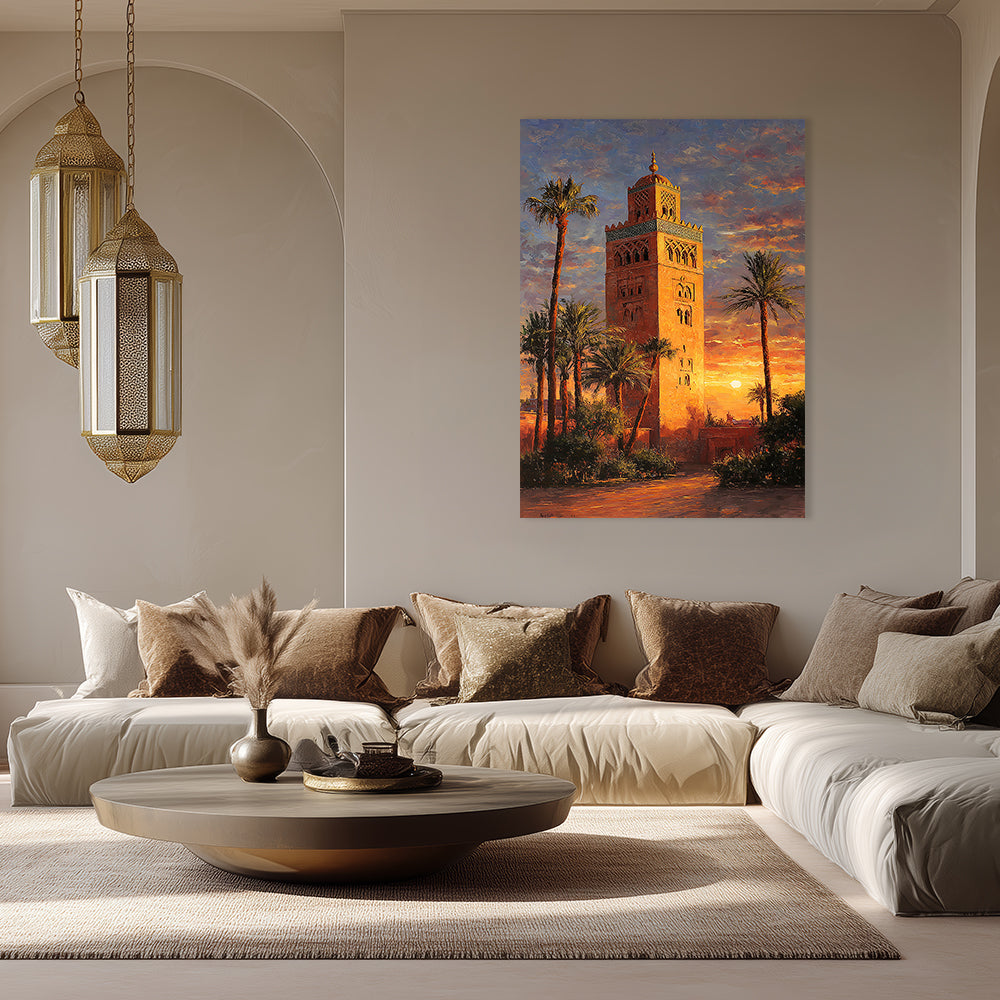 Admirez la majesté d'un minaret au coucher du soleil, entouré de palmiers luxuriants.