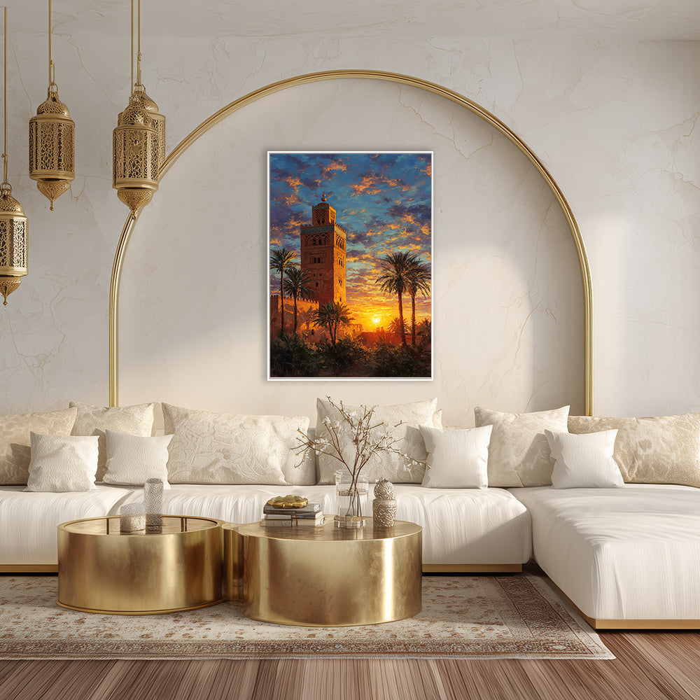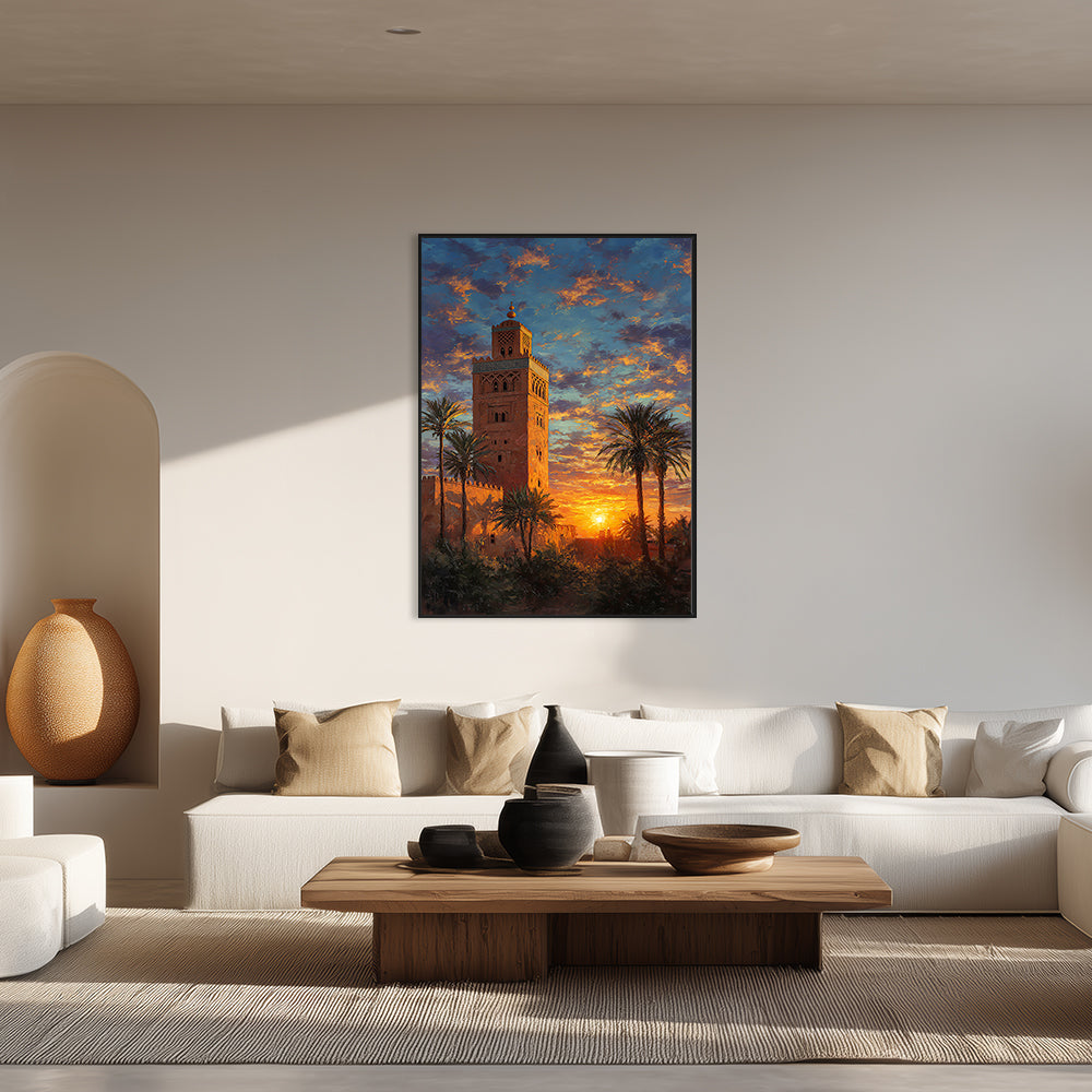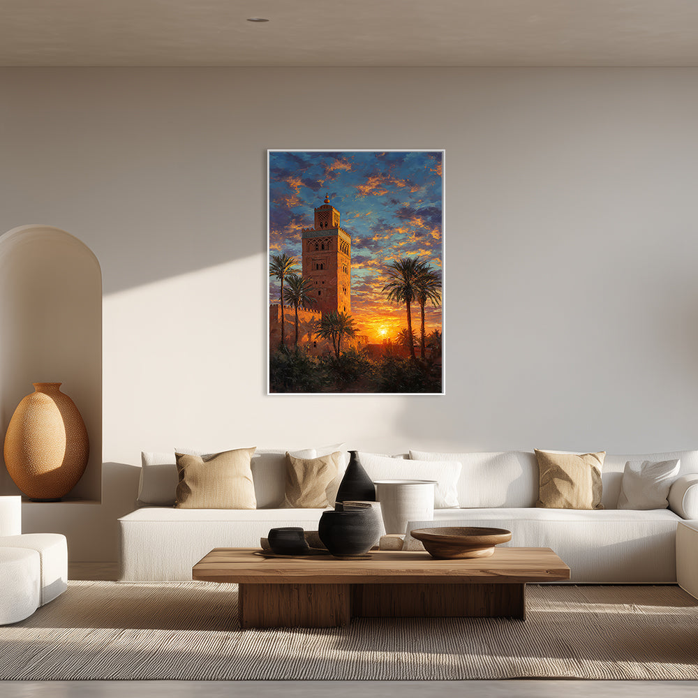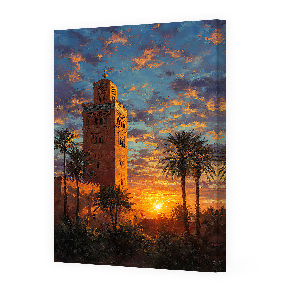 Un coucher de soleil vibrant illumine une tour majestueuse et des palmiers, capturant l'essence du Maroc.