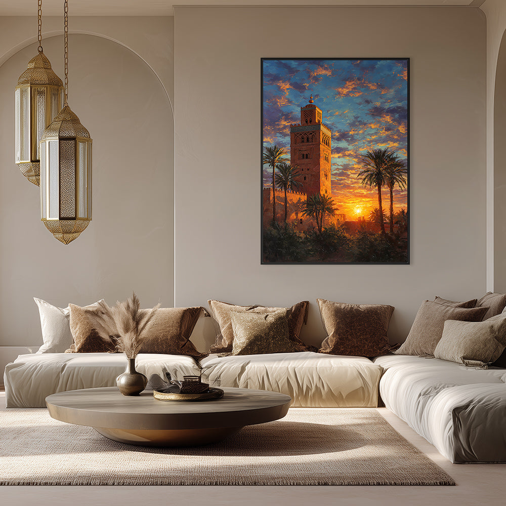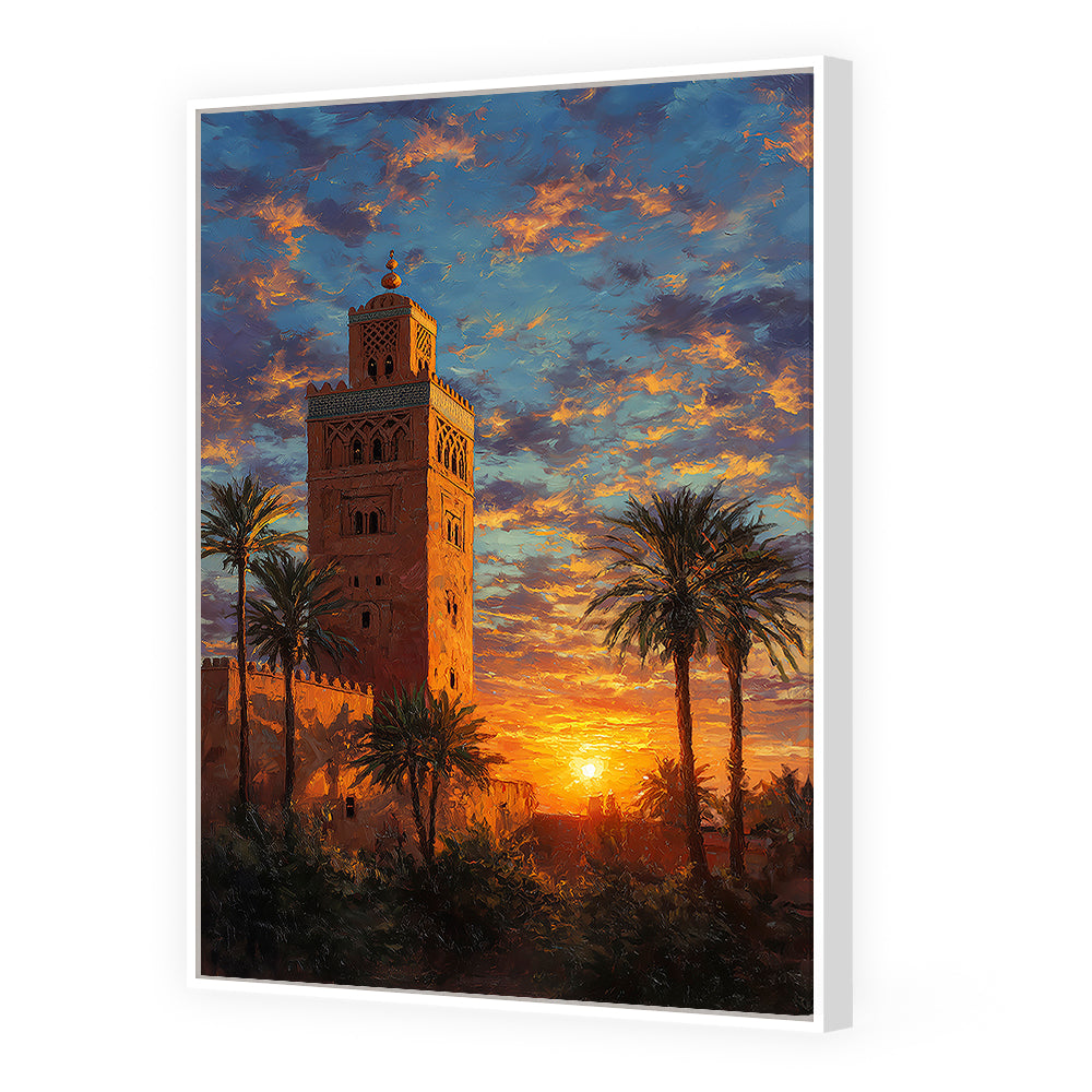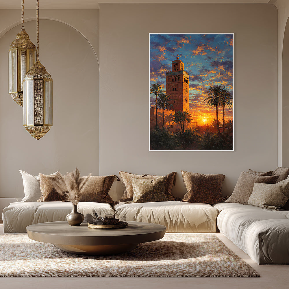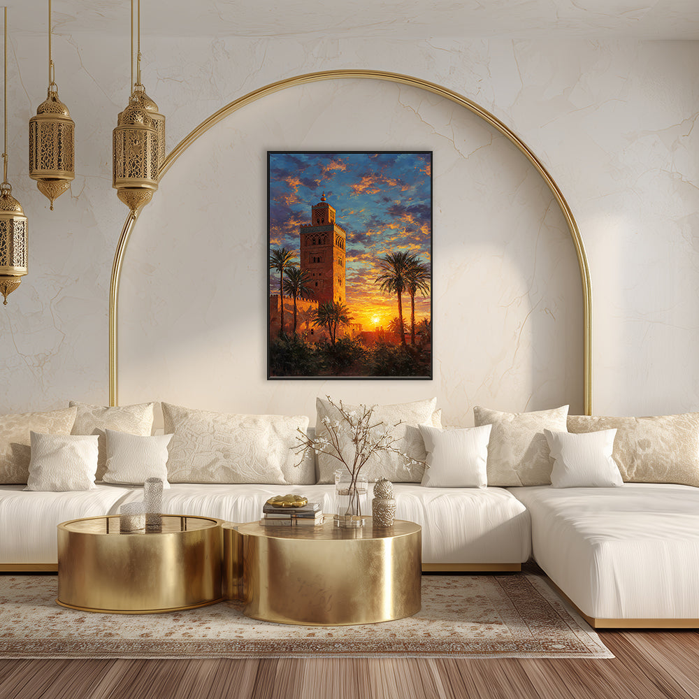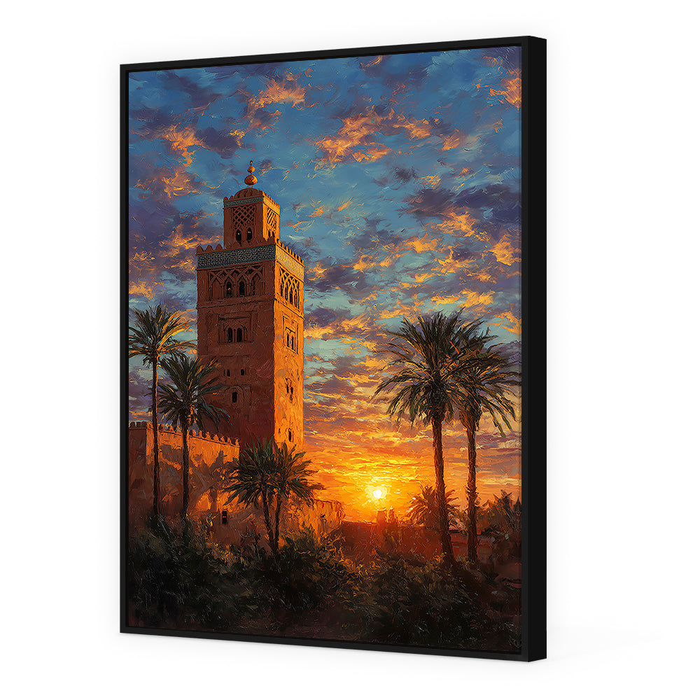 Un coucher de soleil vibrant illumine une tour majestueuse et des palmiers, capturant l'essence du Maroc.
