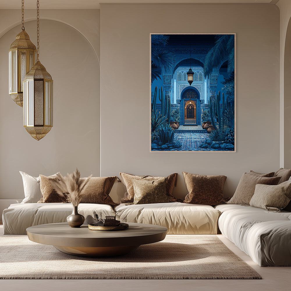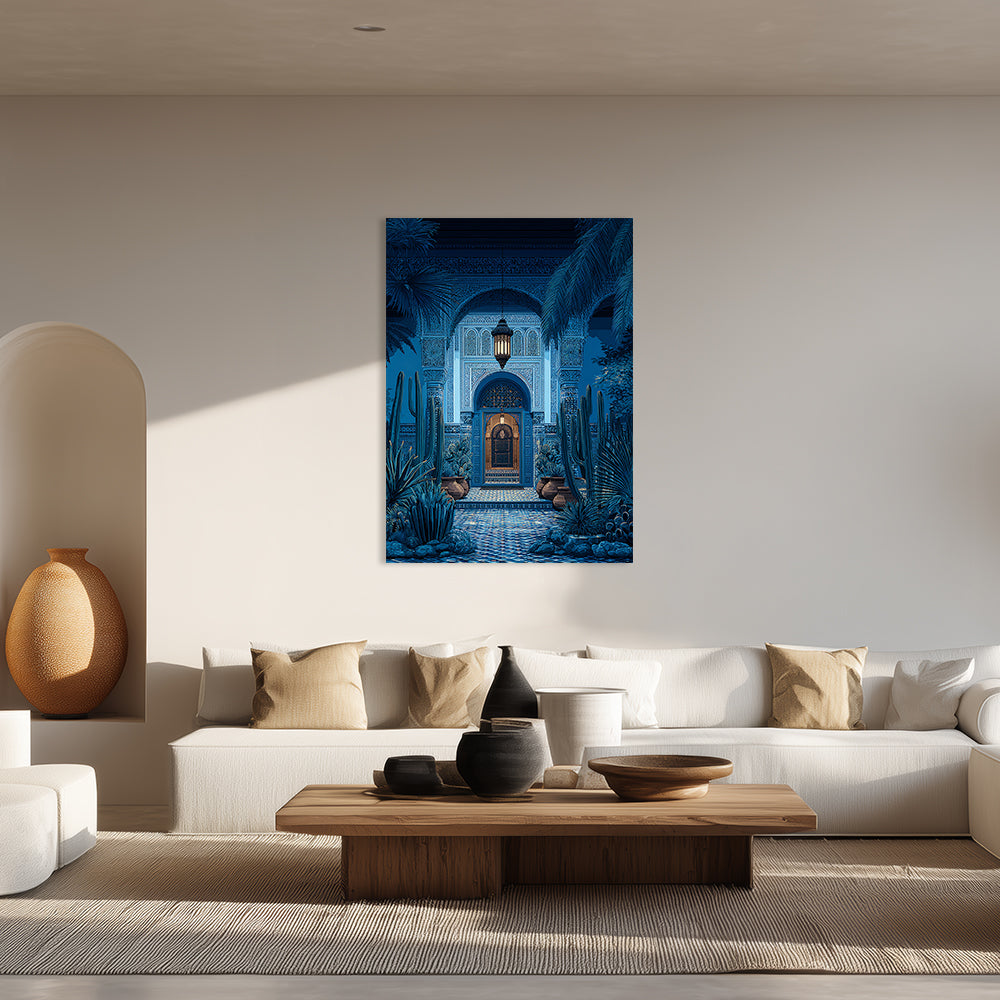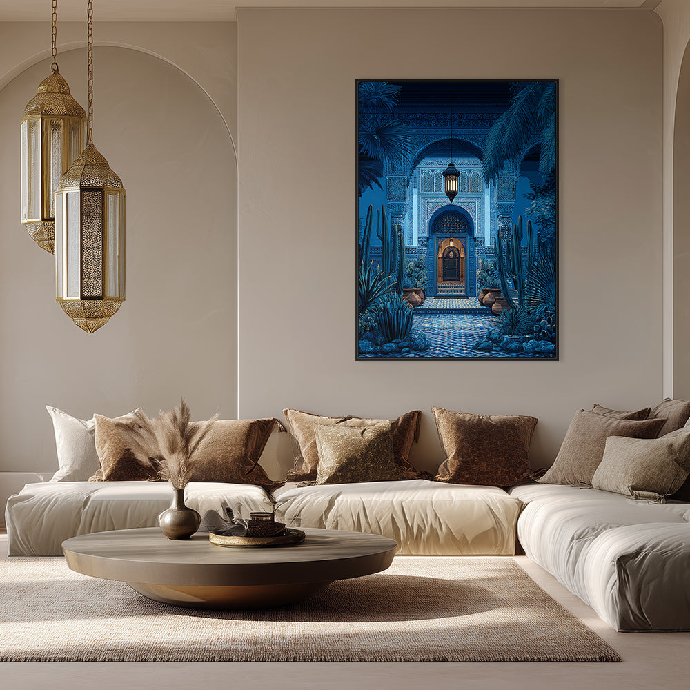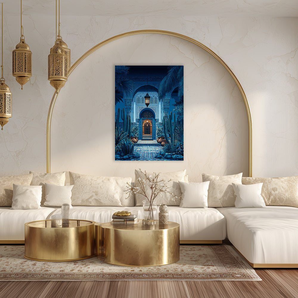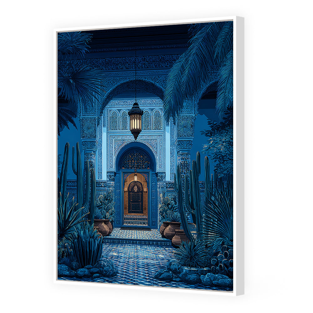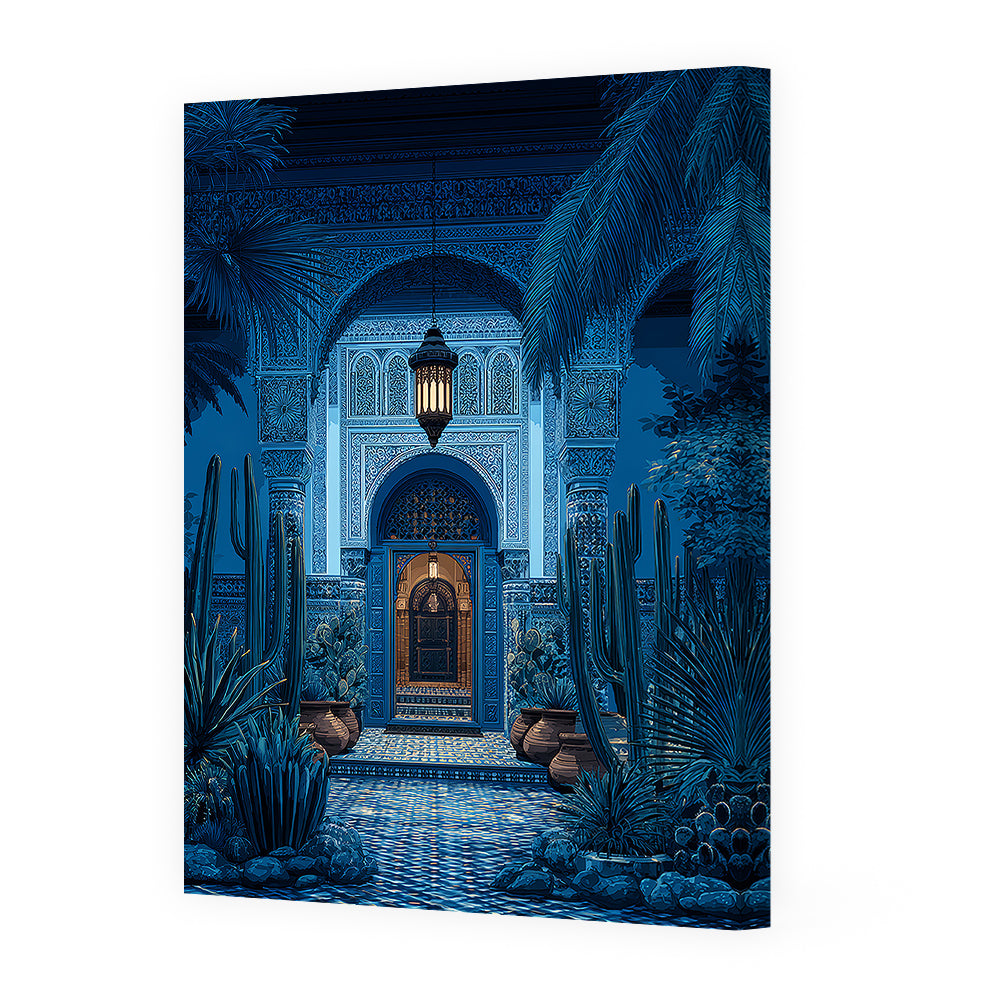 Explorez un portail enchanteur aux motifs orientaux et végétation luxuriante, baigné de lumière douce.