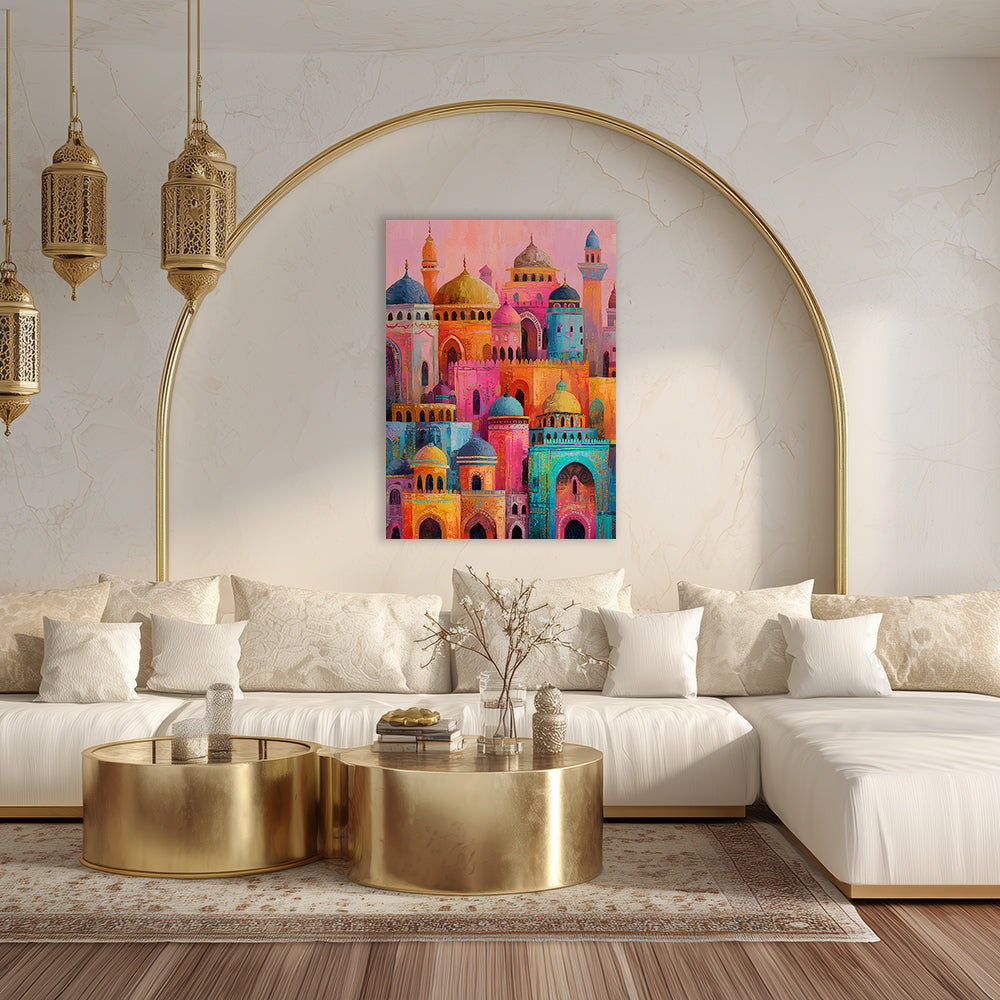 Un paysage architectural vibrant aux couleurs éclatantes, évoquant une ambiance orientale mystique.