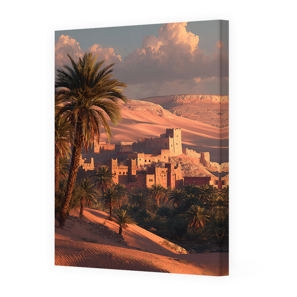 Découvrez la sérénité d'une oasis au crépuscule, où la nature rencontre l'architecture ancienne.
