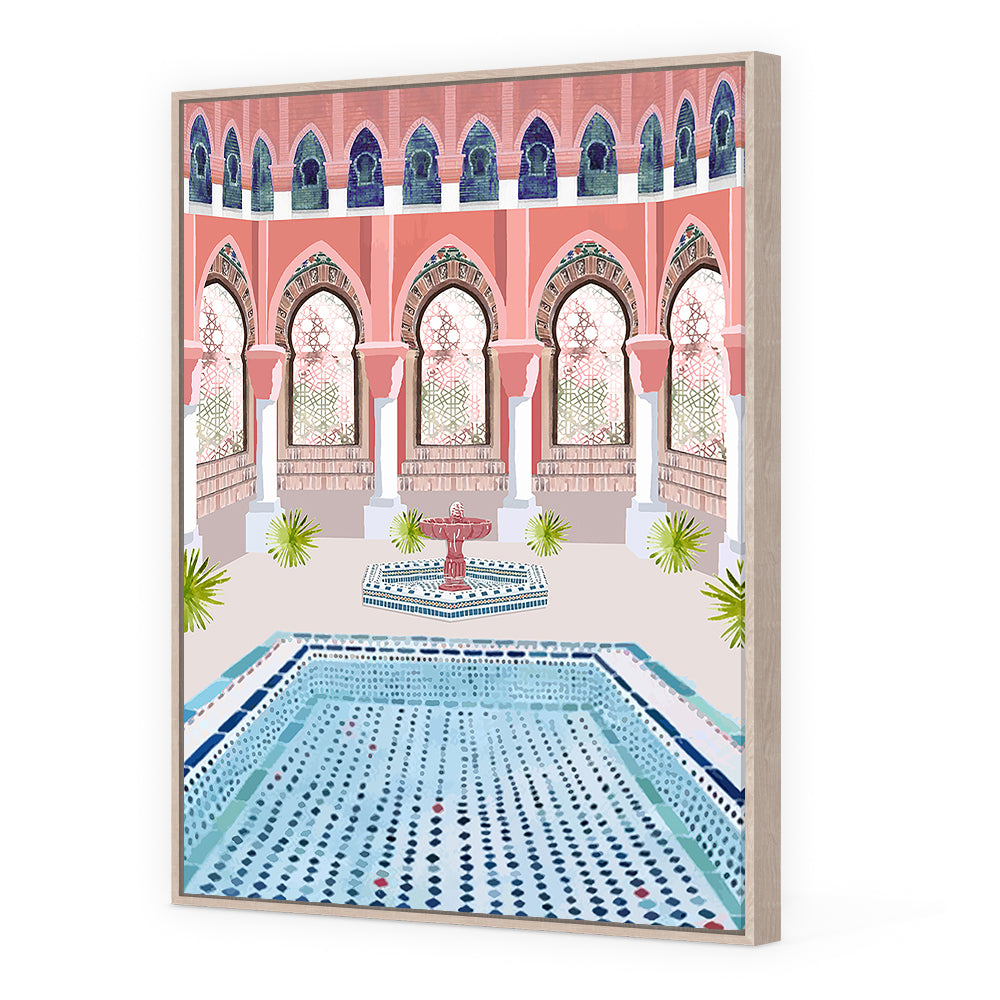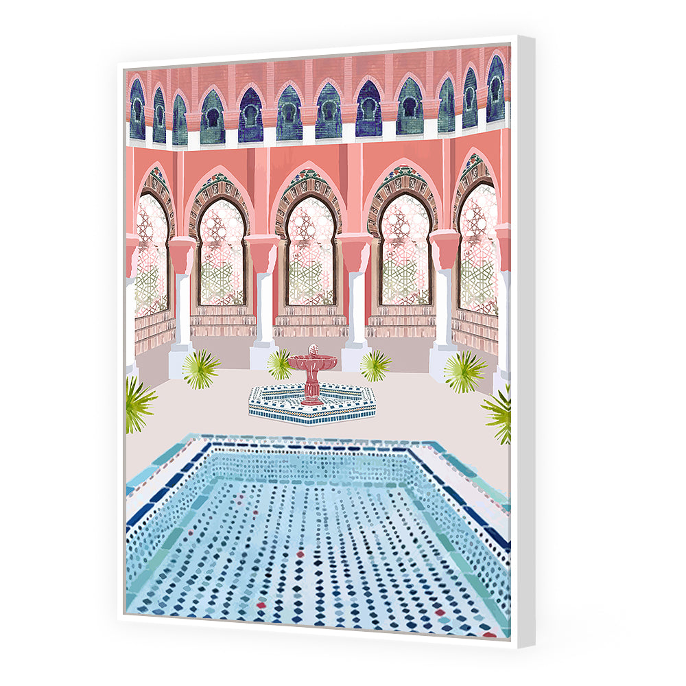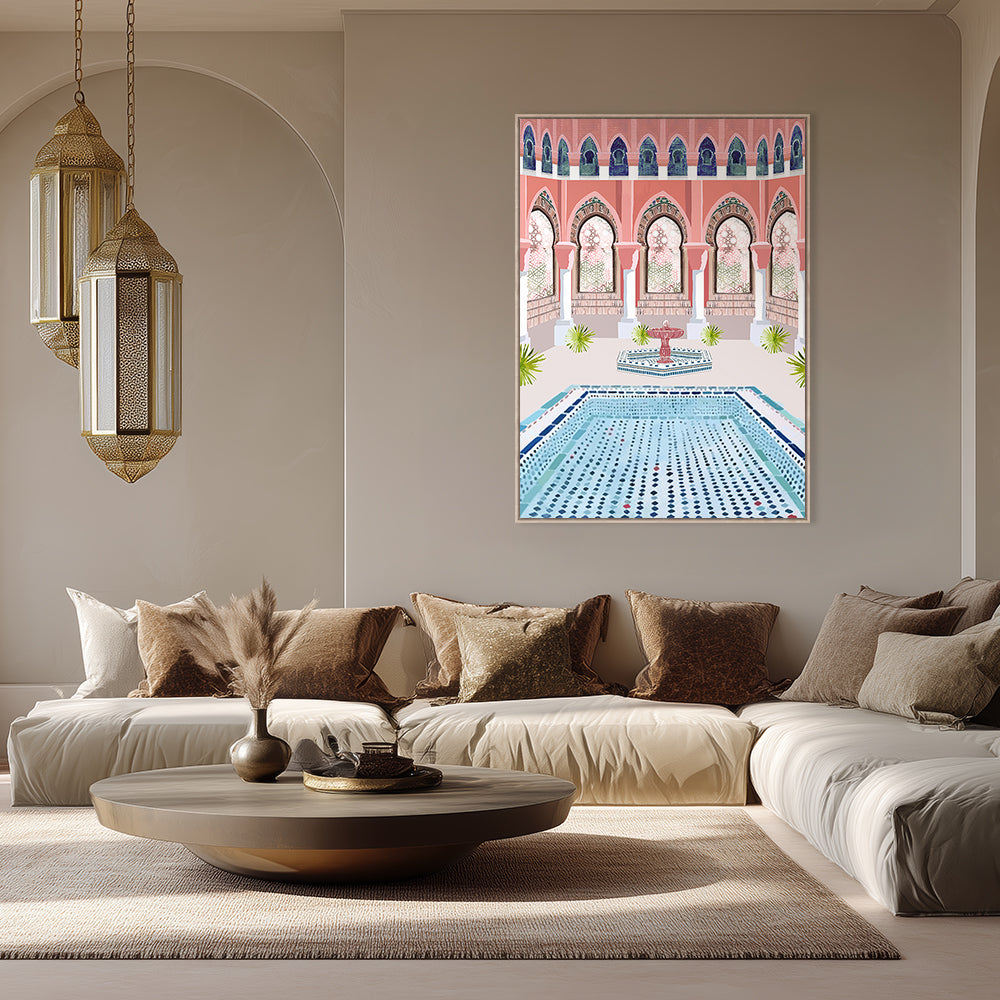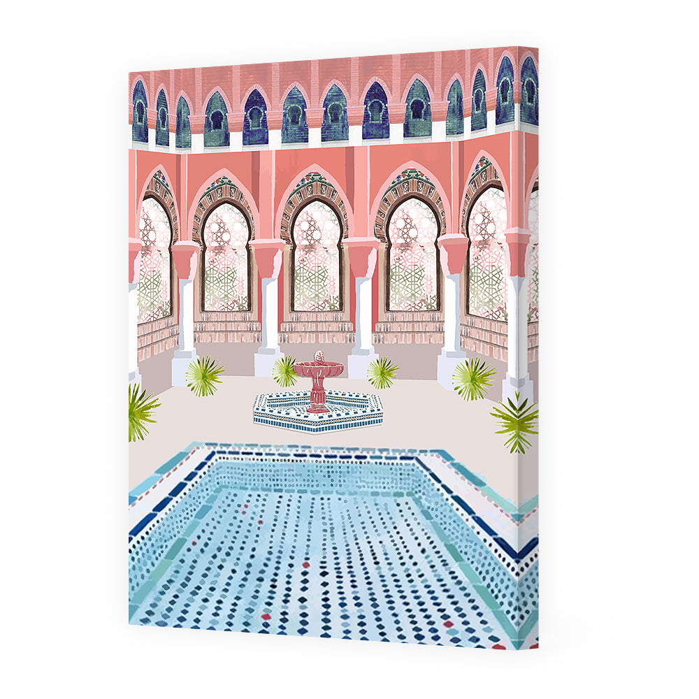 Élégante cour intérieure avec fontaine et mosaïques, évoquant une architecture traditionnelle raffinée.