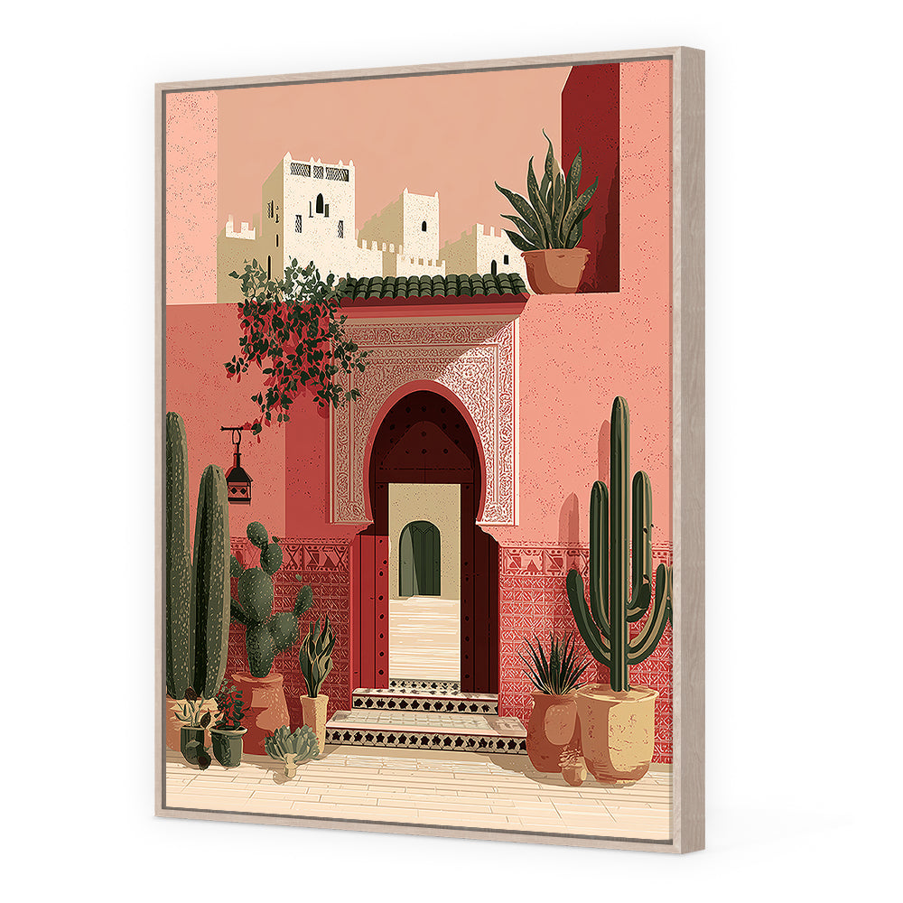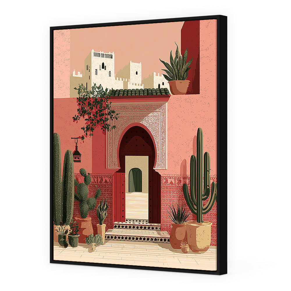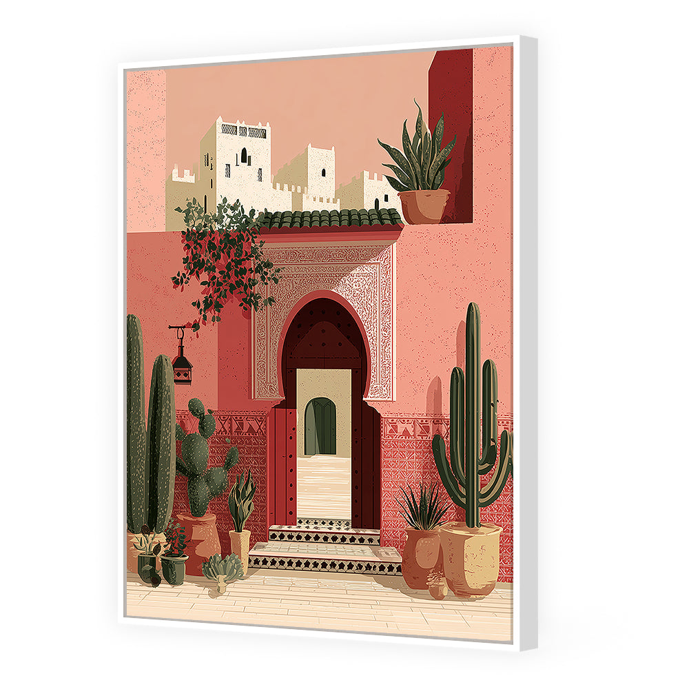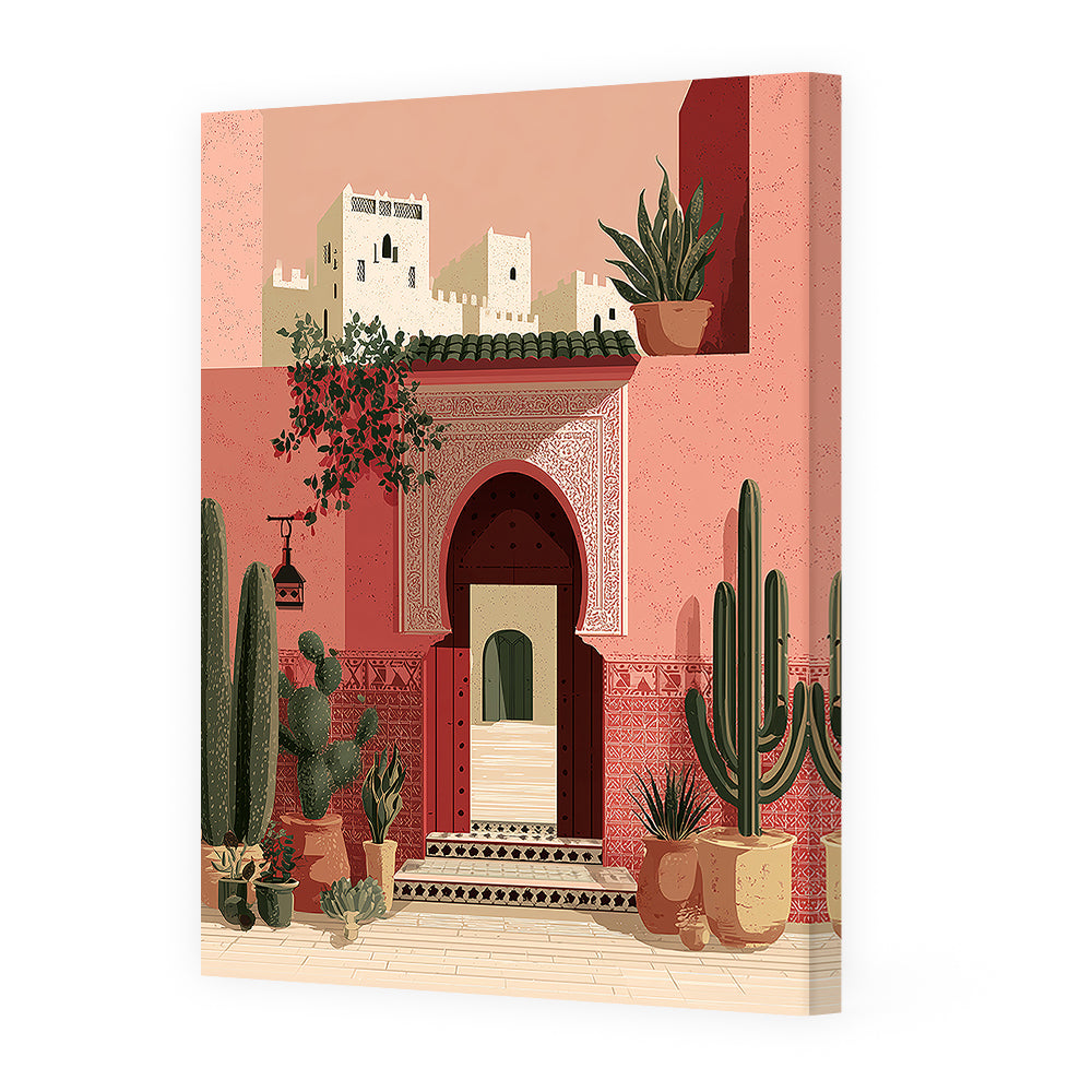 Scène marocaine captivante avec cactus et architecture traditionnelle, évoquant chaleur et exotisme.