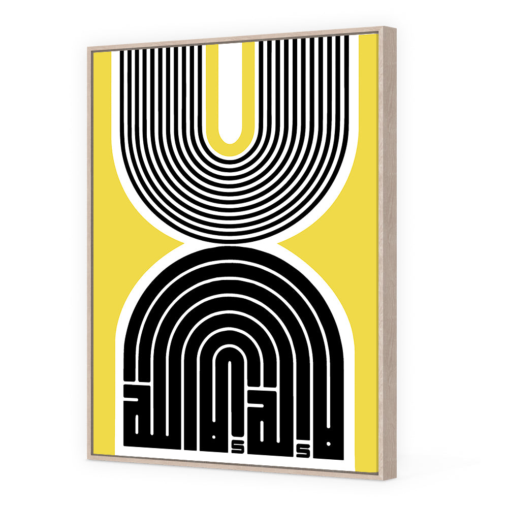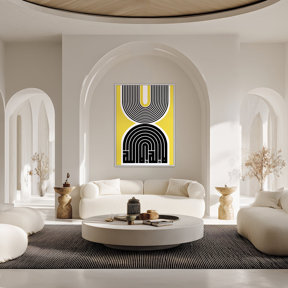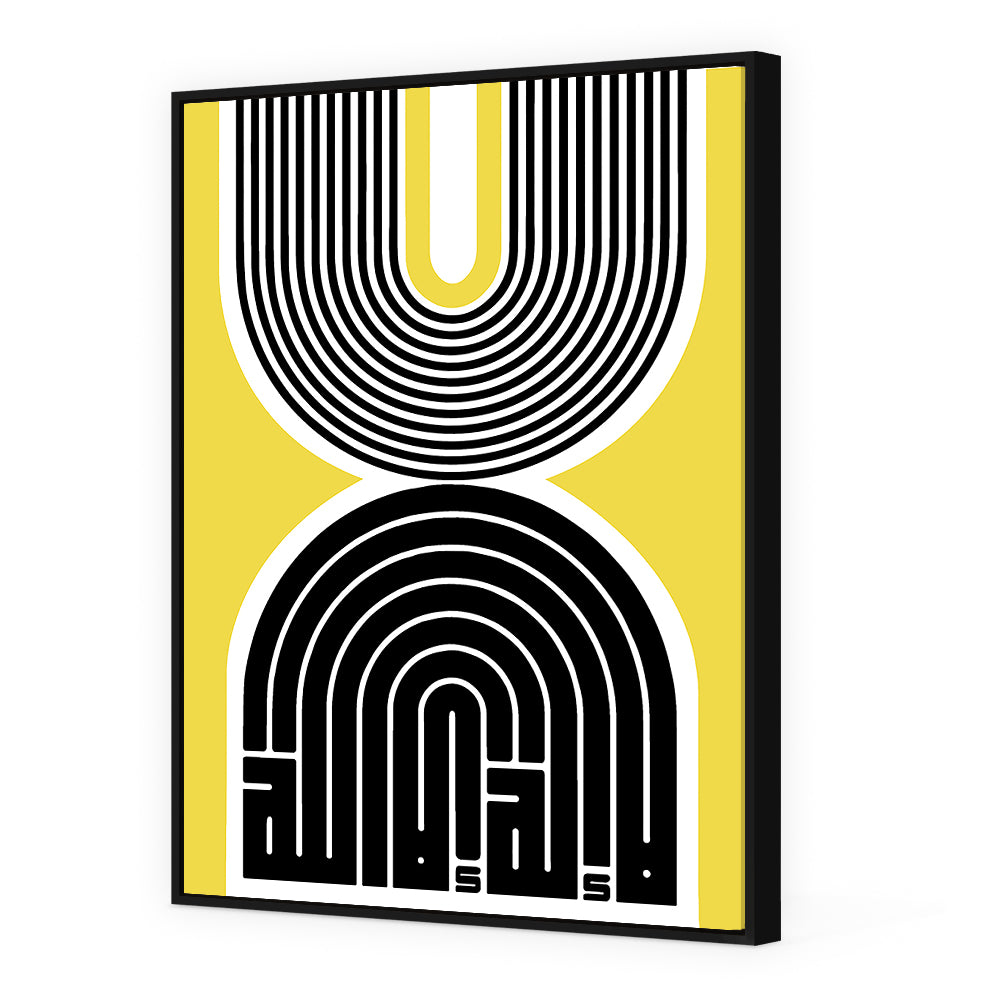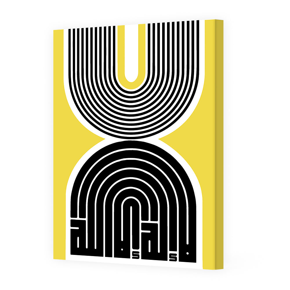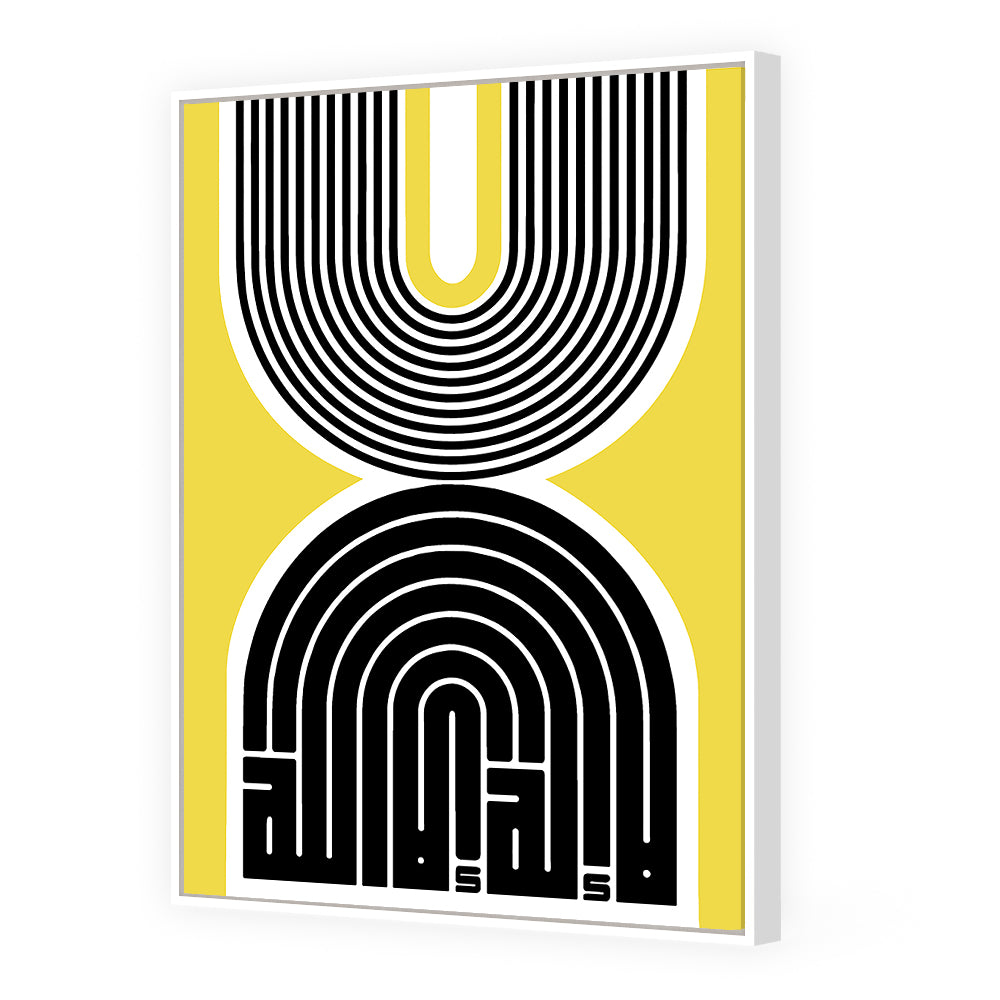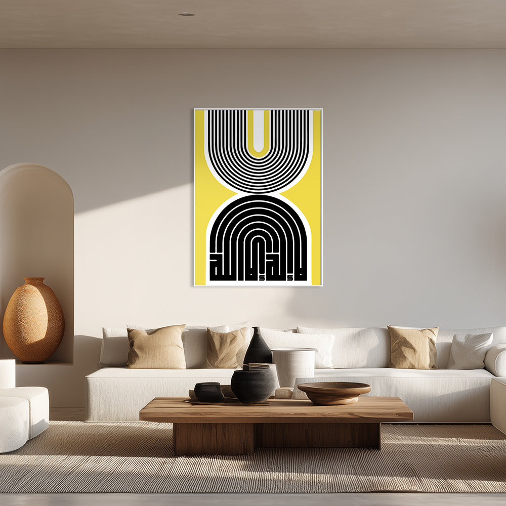 Design moderne avec des lignes noires et blanches sur fond jaune vibrant.