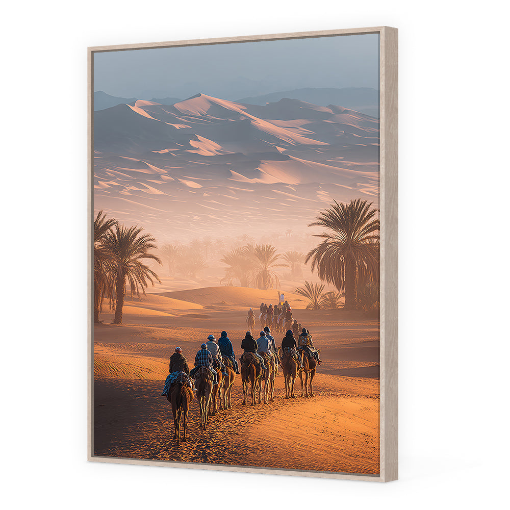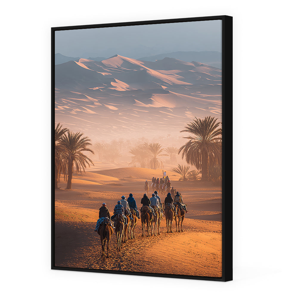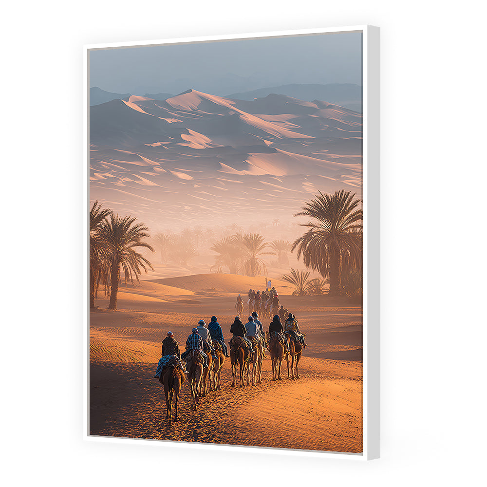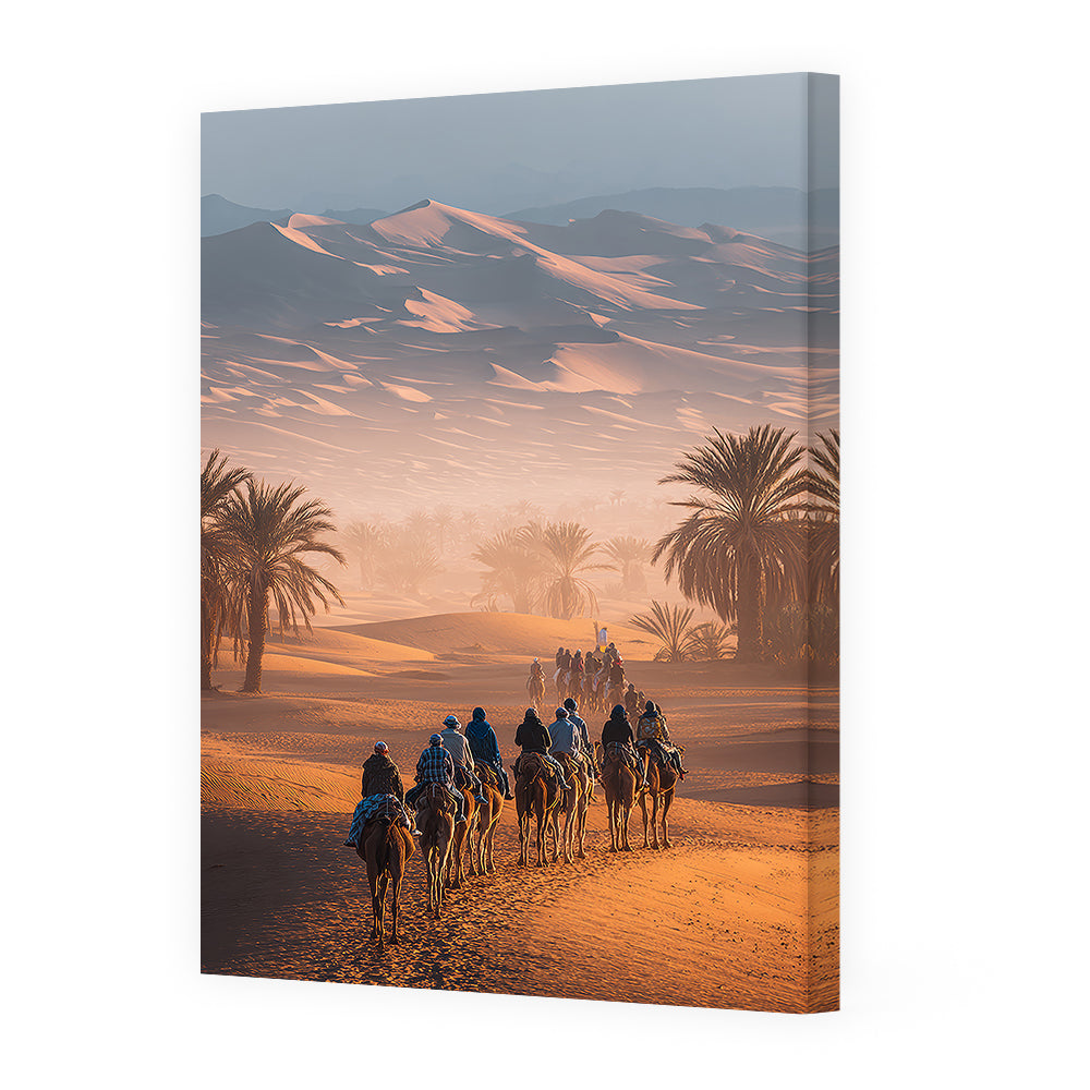 Une caravane traverse majestueusement les dunes dorées sous un ciel bleu serein.