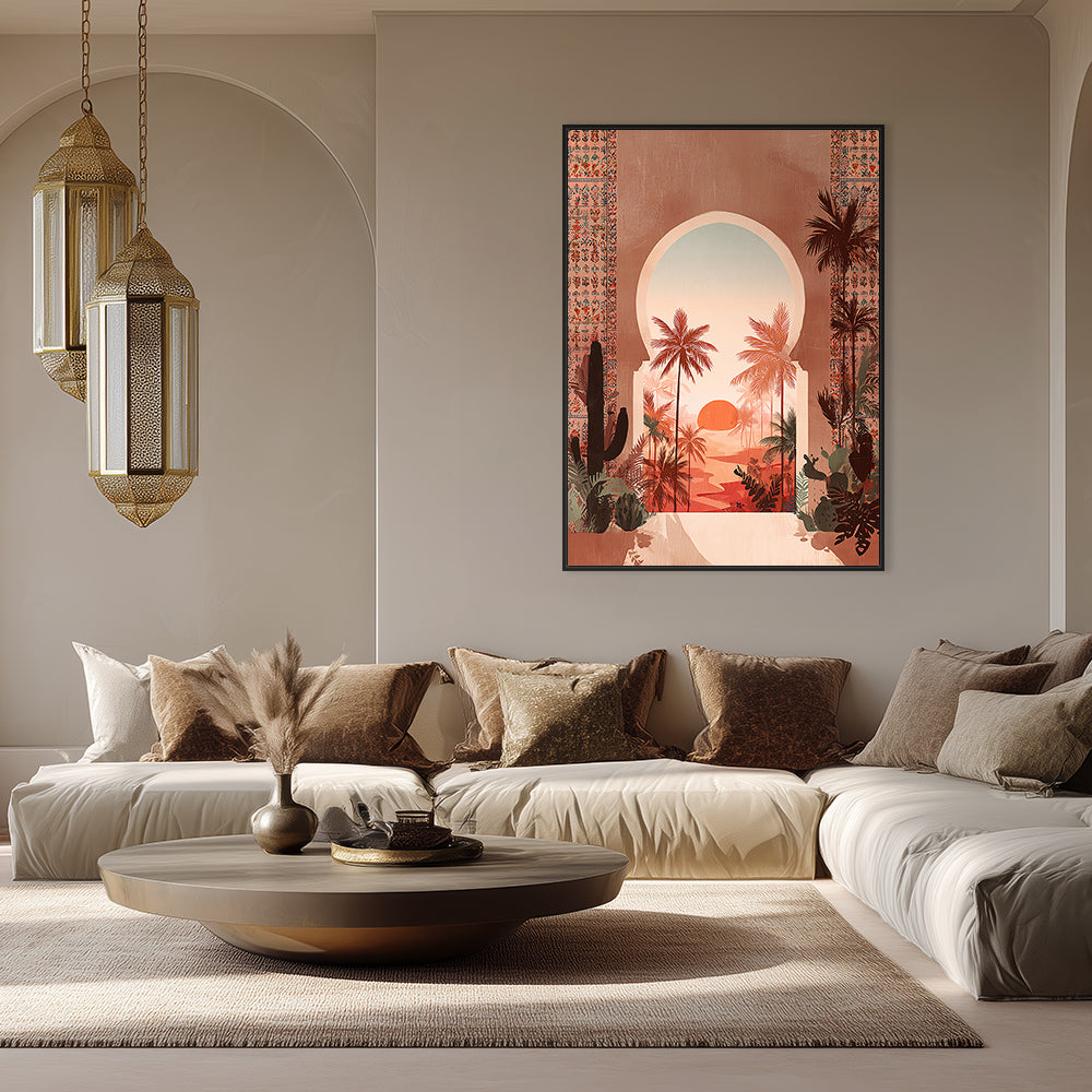 Évadez-vous dans un paysage exotique aux teintes chaudes et motifs orientaux.