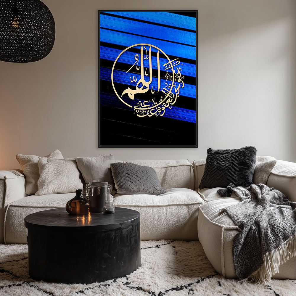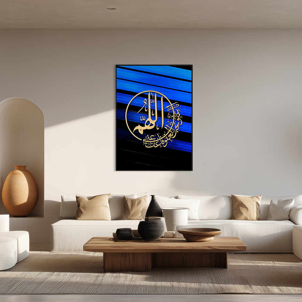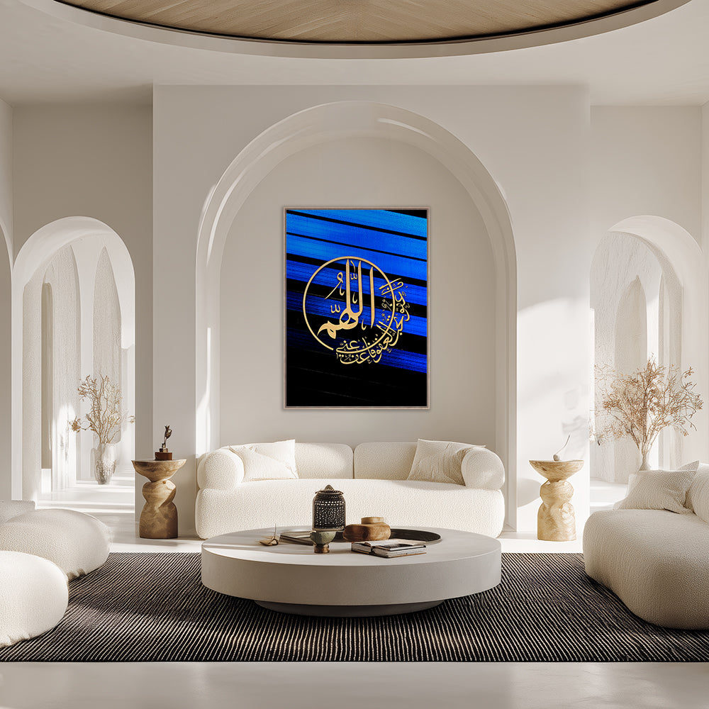 Calligraphie dorée sur fond bleu et noir, évoquant une élégance mystique.