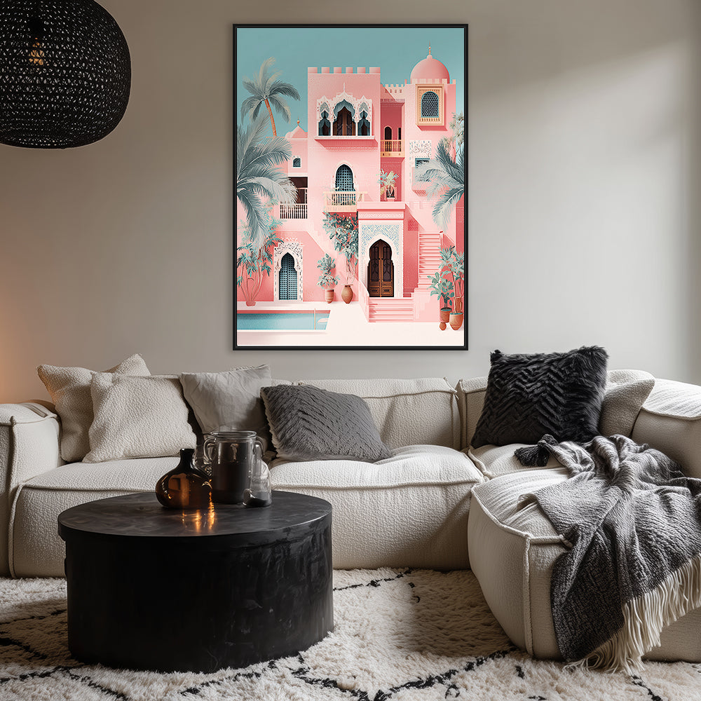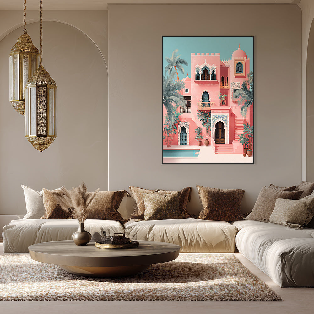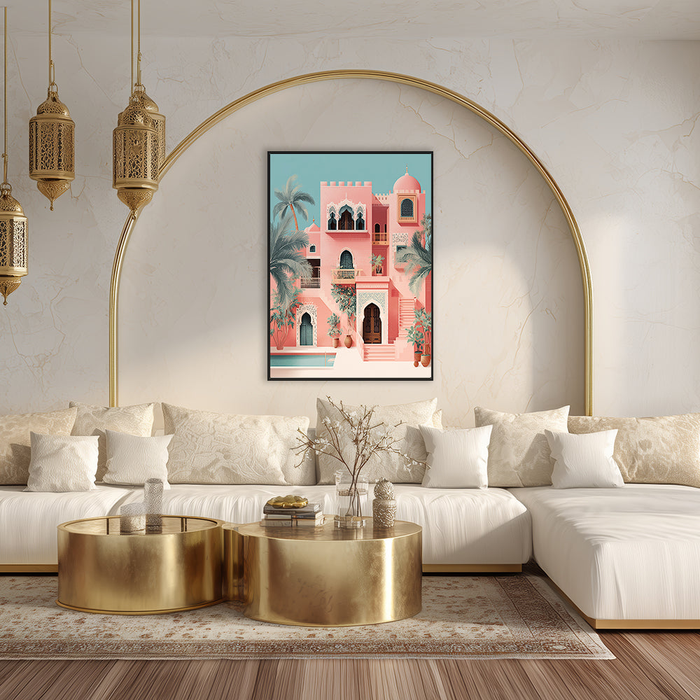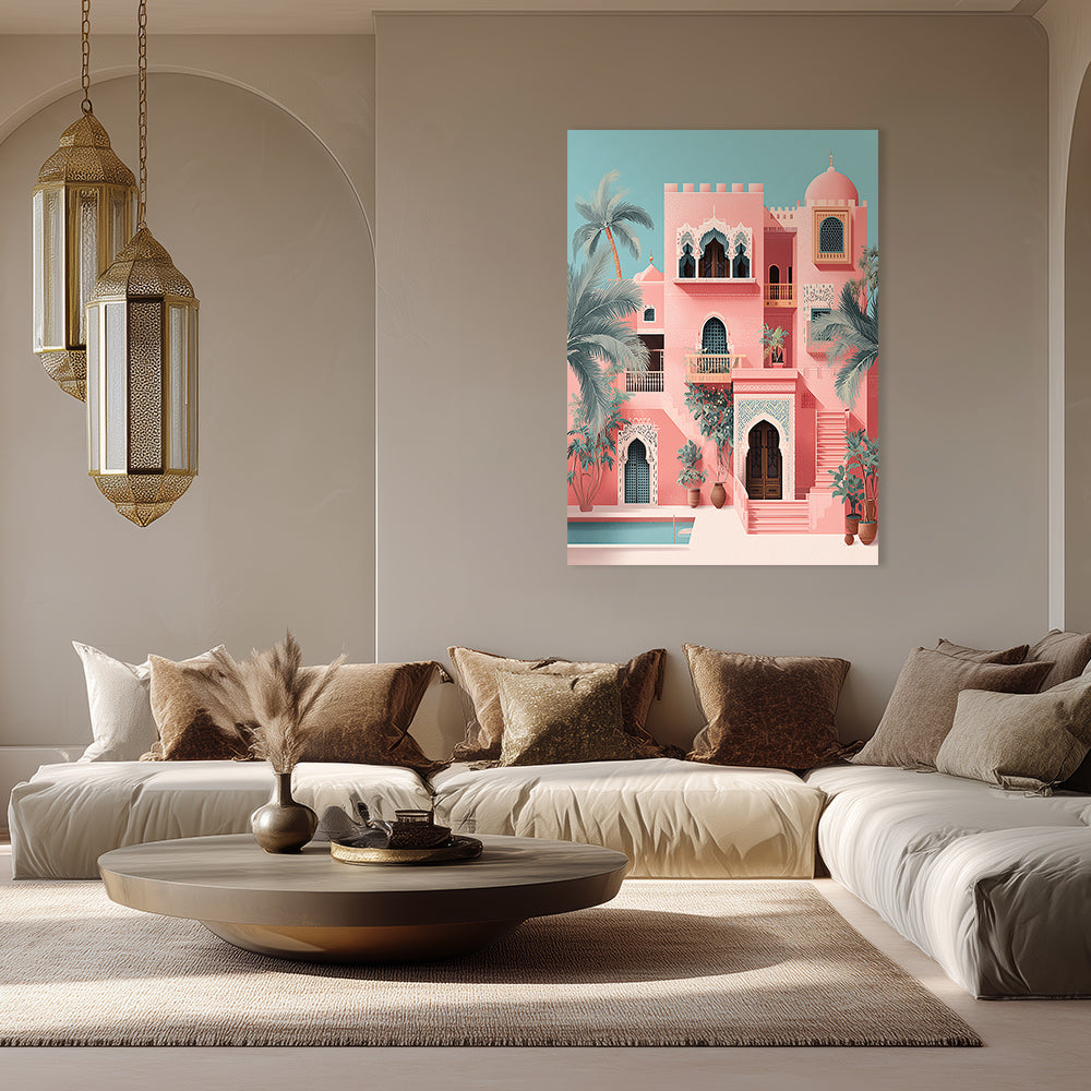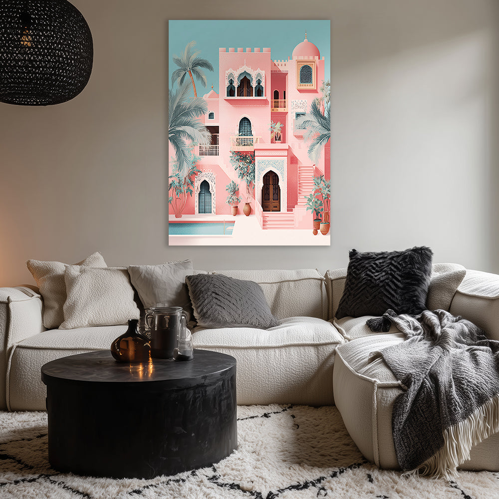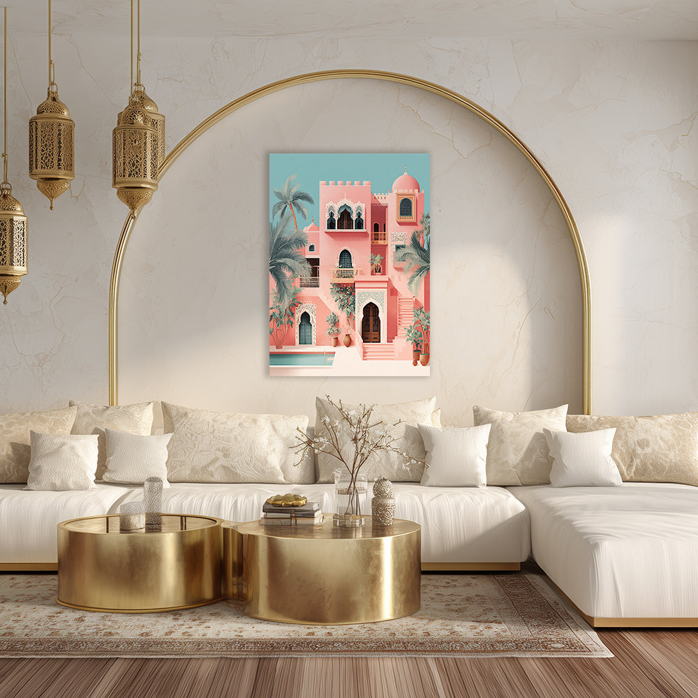 Évadez-vous dans un palais exotique aux teintes pastel et détails architecturaux enchanteurs.