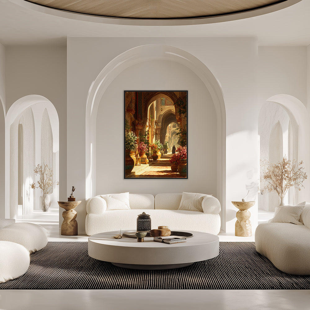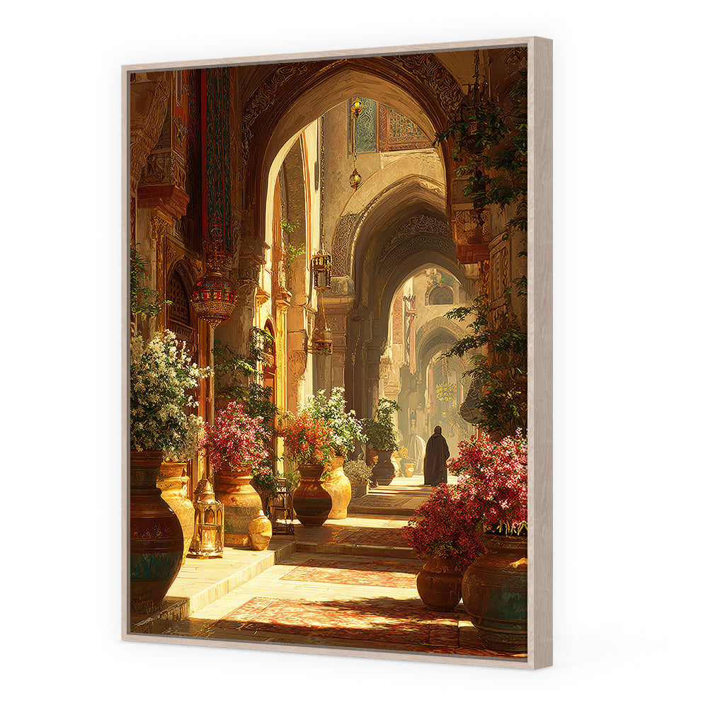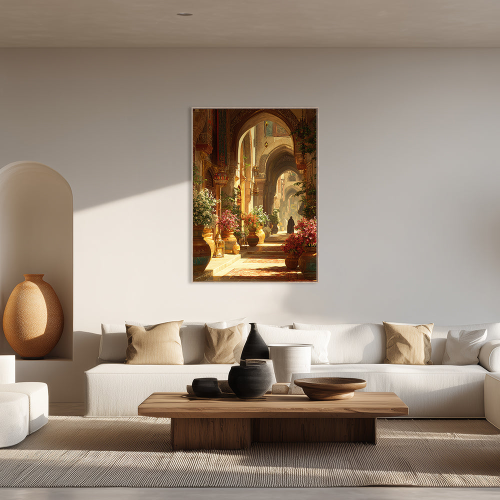 Explorez un passage mystique baigné de lumière dorée, orné de plantes luxuriantes et d'arcs majestueux.