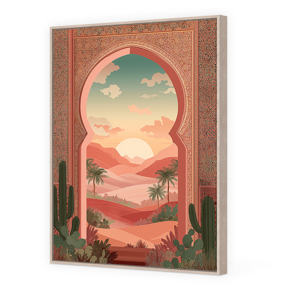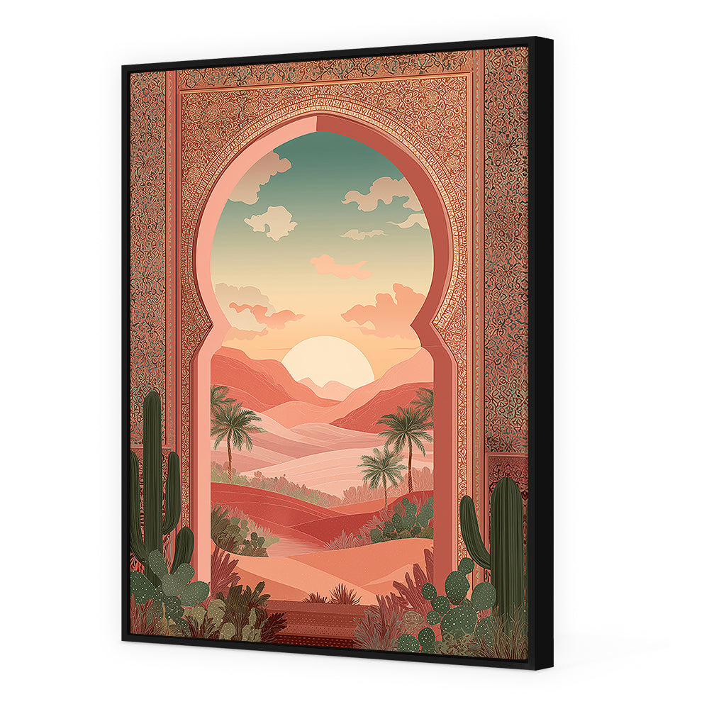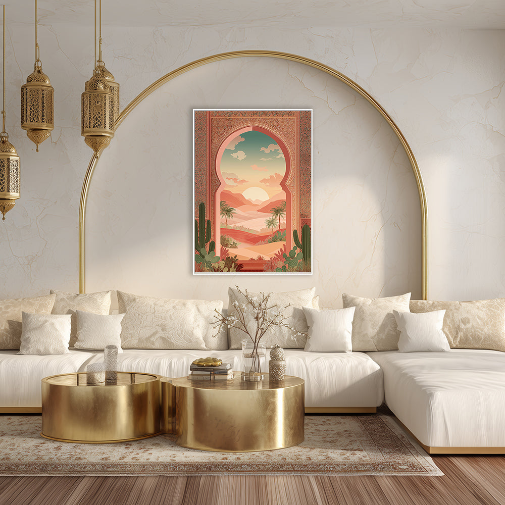 Évadez-vous vers un paysage oriental enchanteur, encadré par des motifs arabesques raffinés.