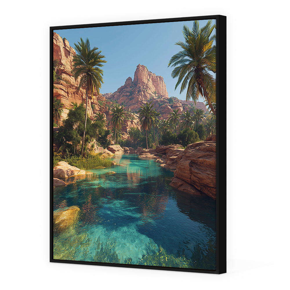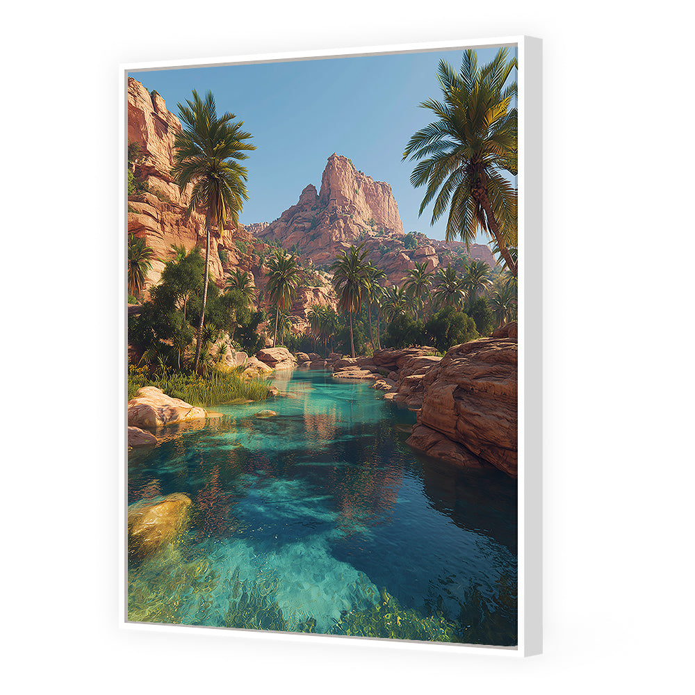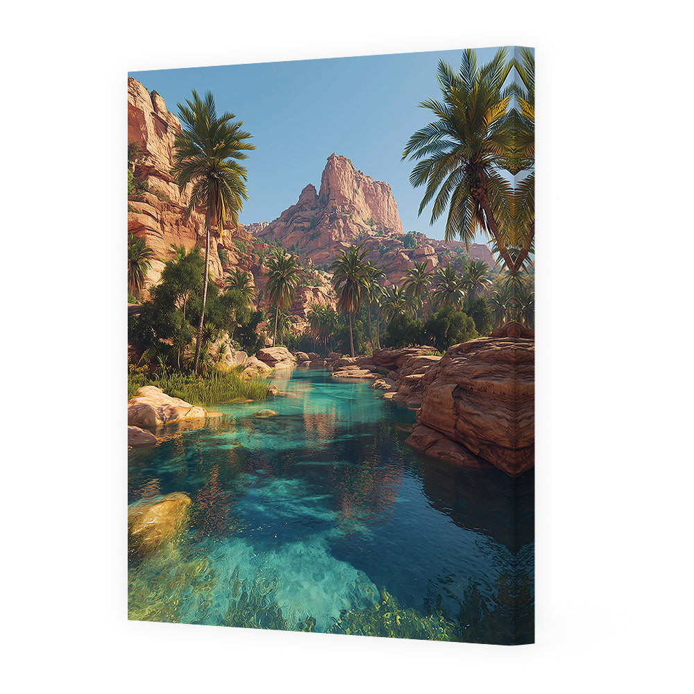 Découvrez une oasis paisible entourée de palmiers et montagnes sous un ciel bleu éclatant.