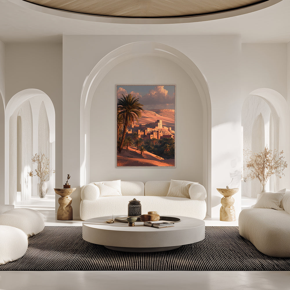 Découvrez la sérénité d'une oasis désertique, où palmiers et dunes s'harmonisent sous un ciel paisible.