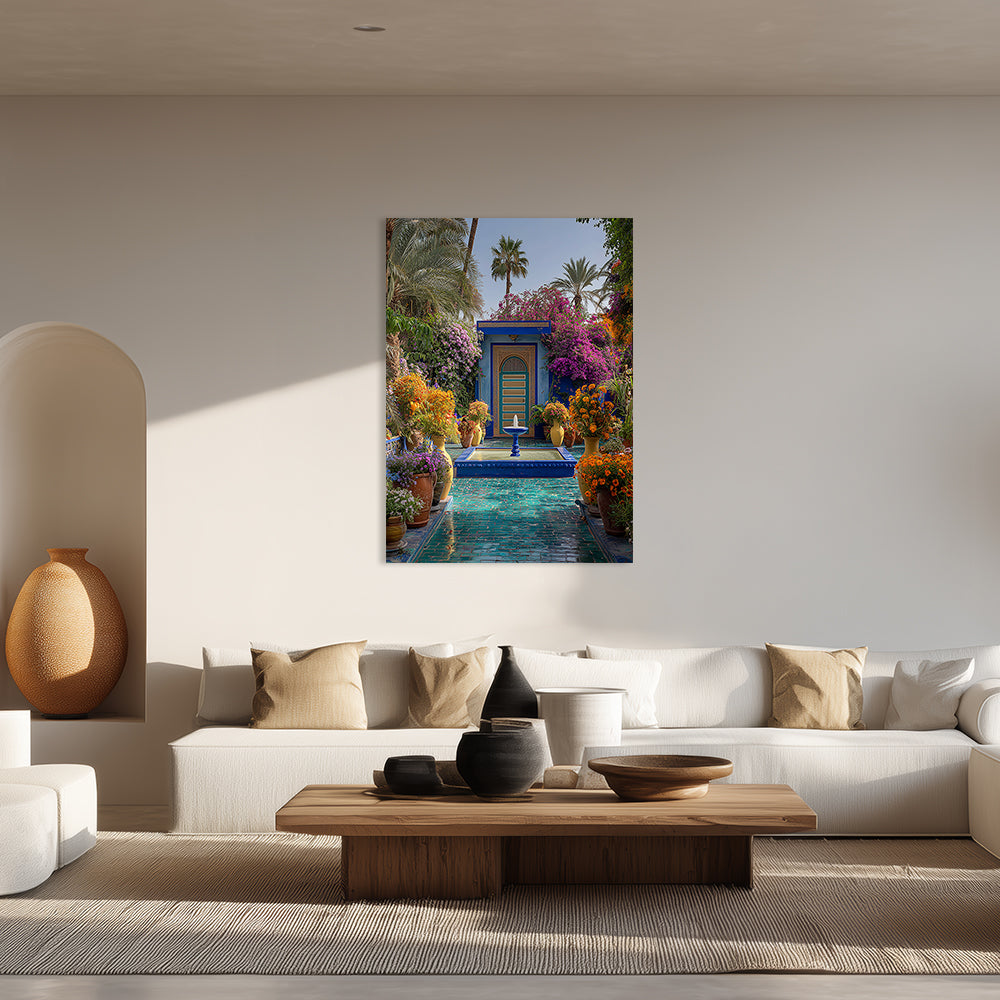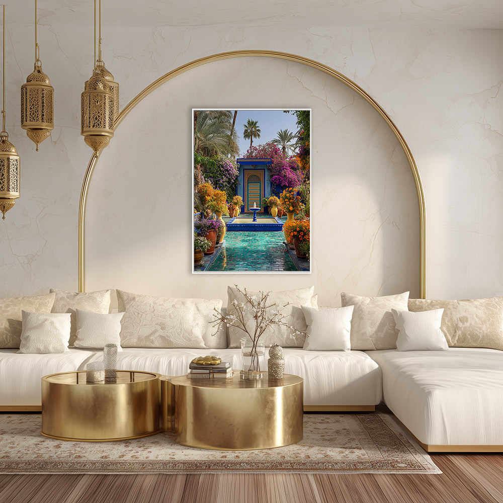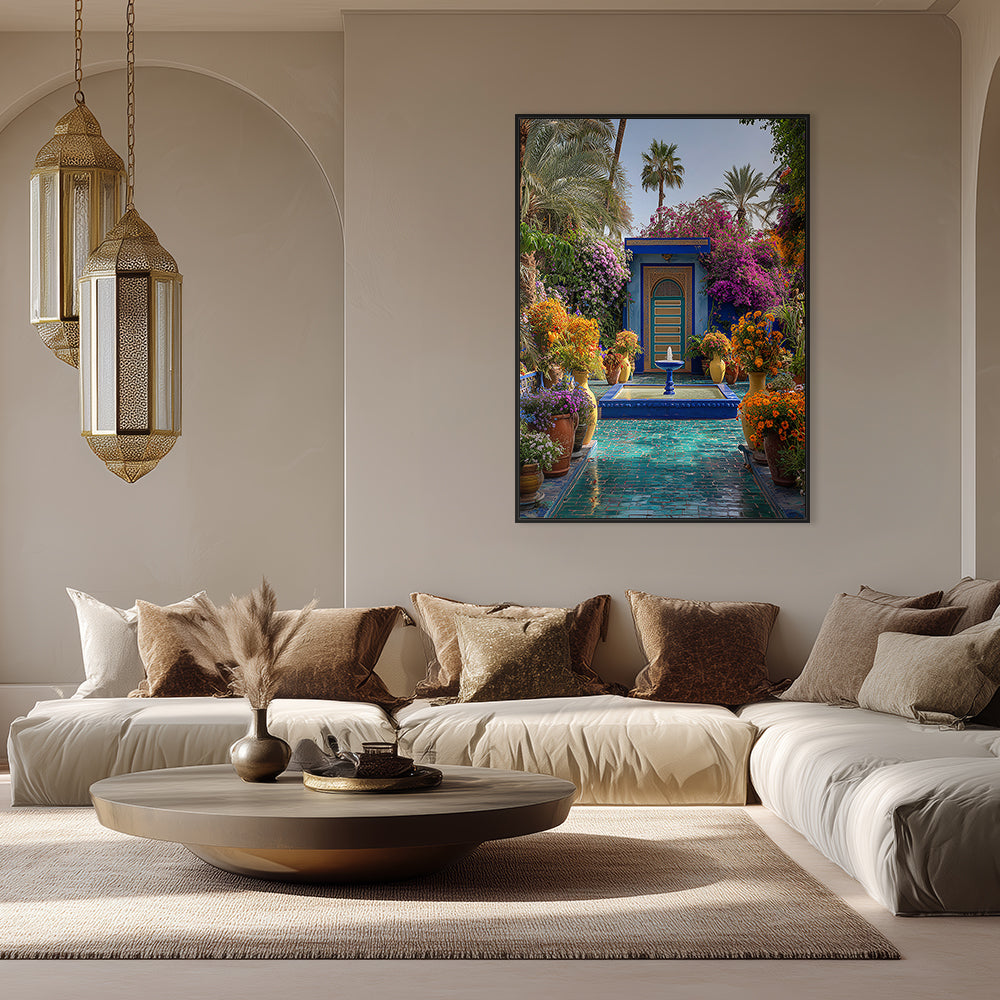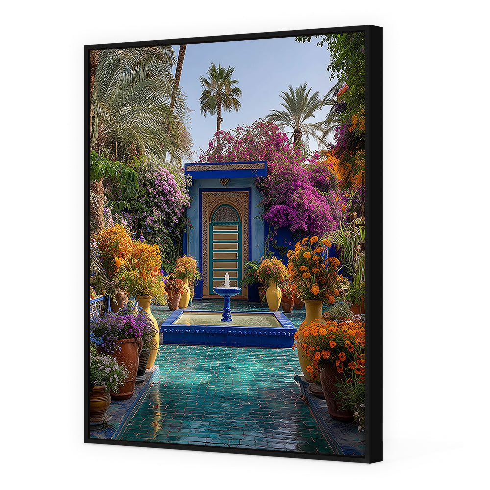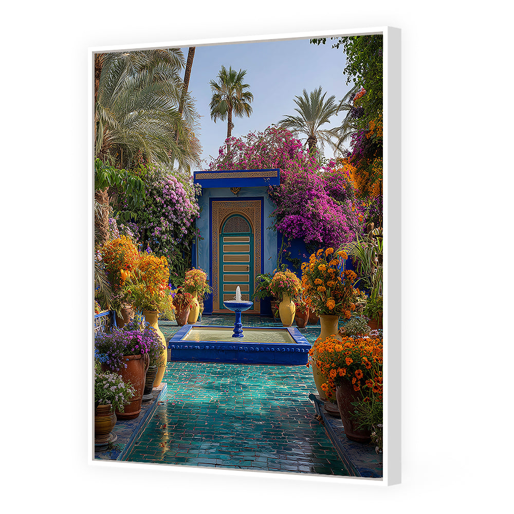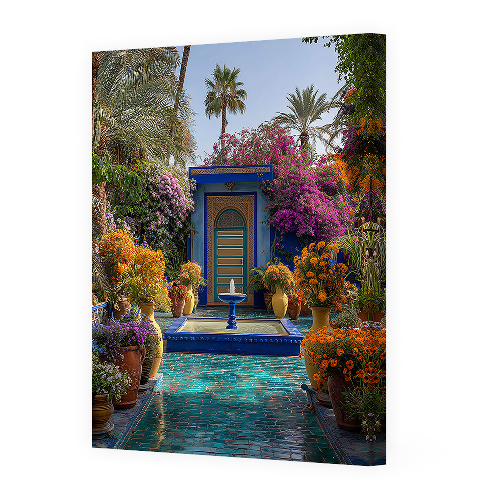Un jardin luxuriant aux couleurs vibrantes, mêlant nature et architecture orientale.