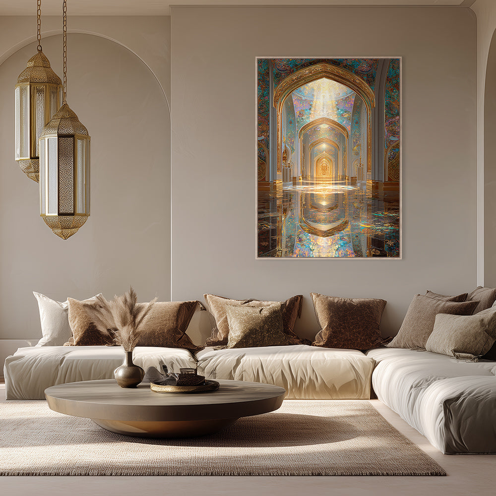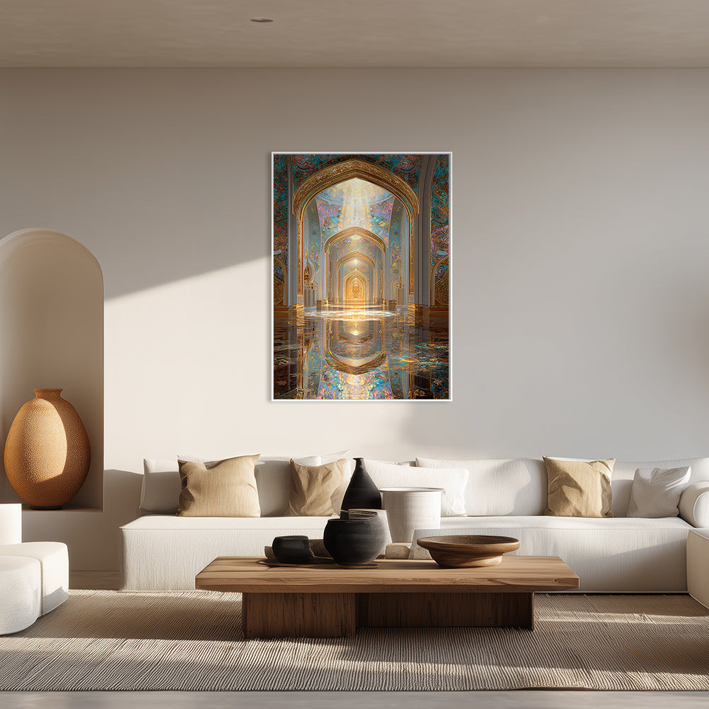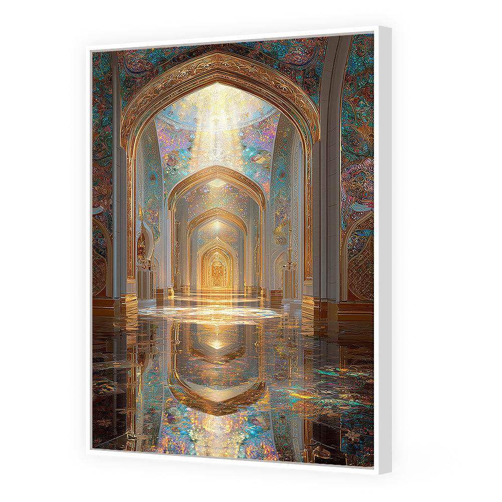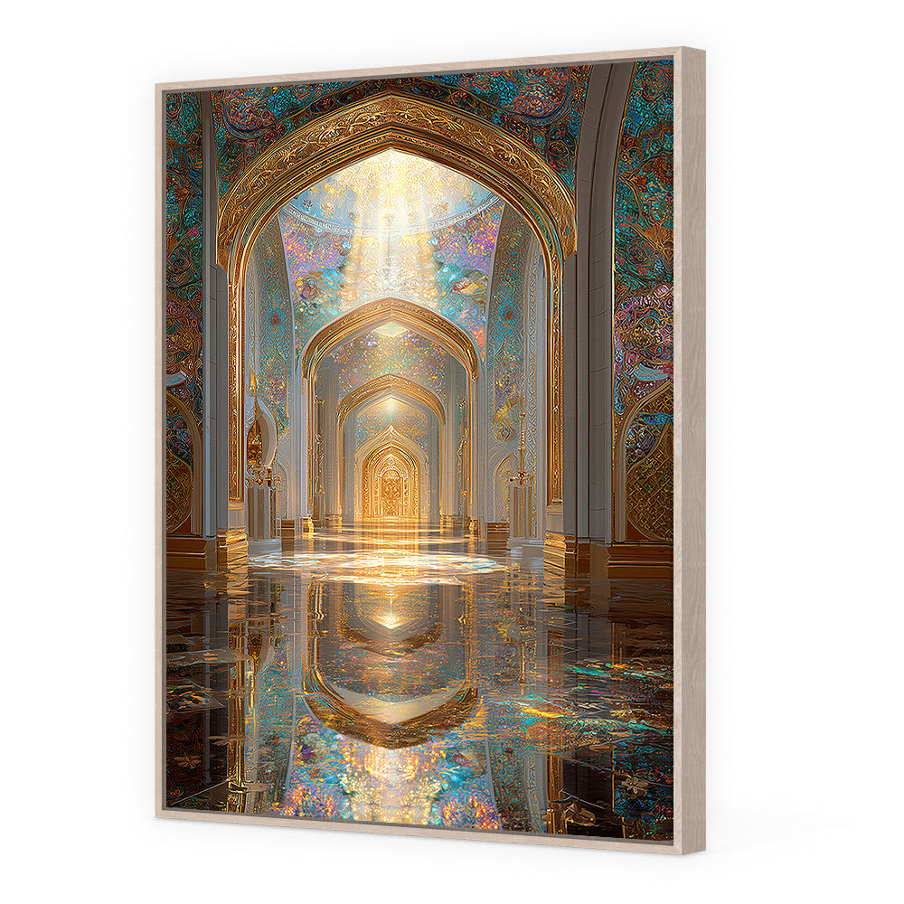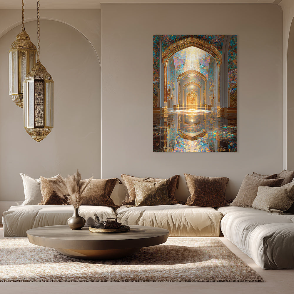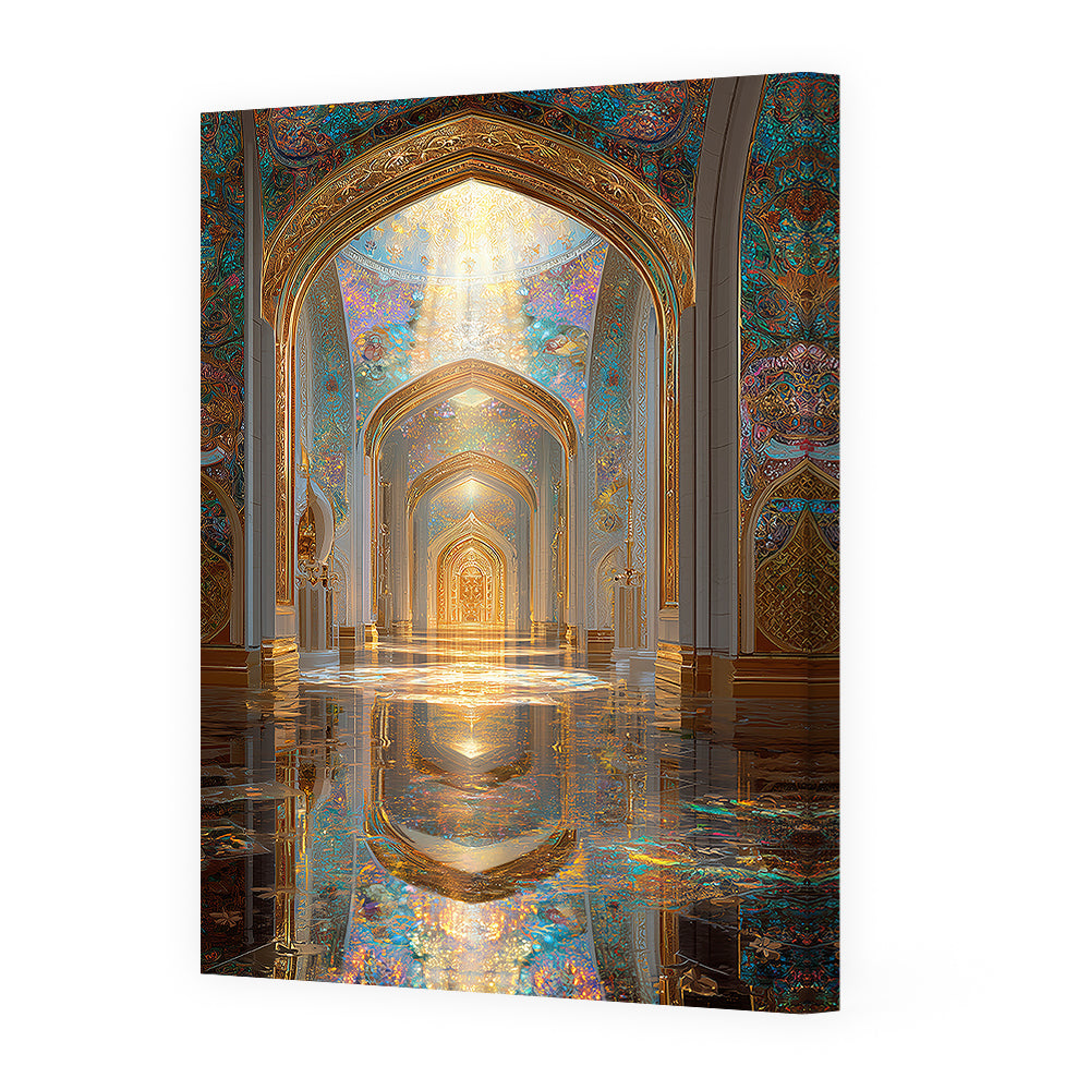 Un somptueux jeu de lumières dorées illumine des arches ornées, créant une ambiance mystique et sacrée.