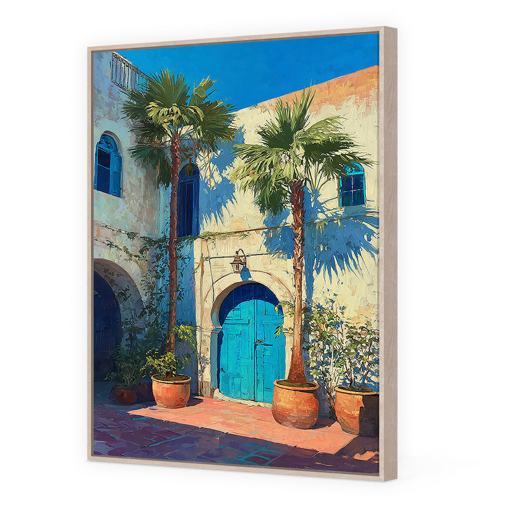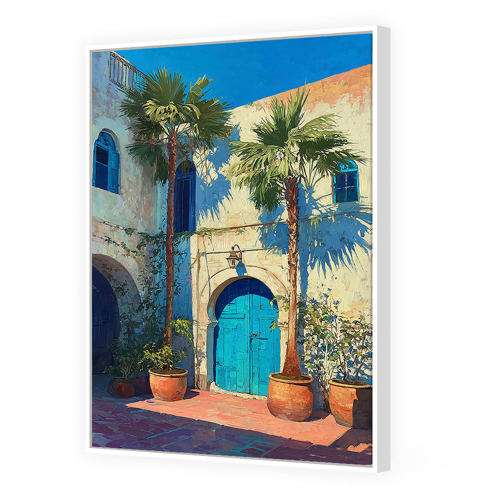 Scène méditerranéenne ensoleillée avec palmiers et porte bleue, évoquant chaleur et tradition.