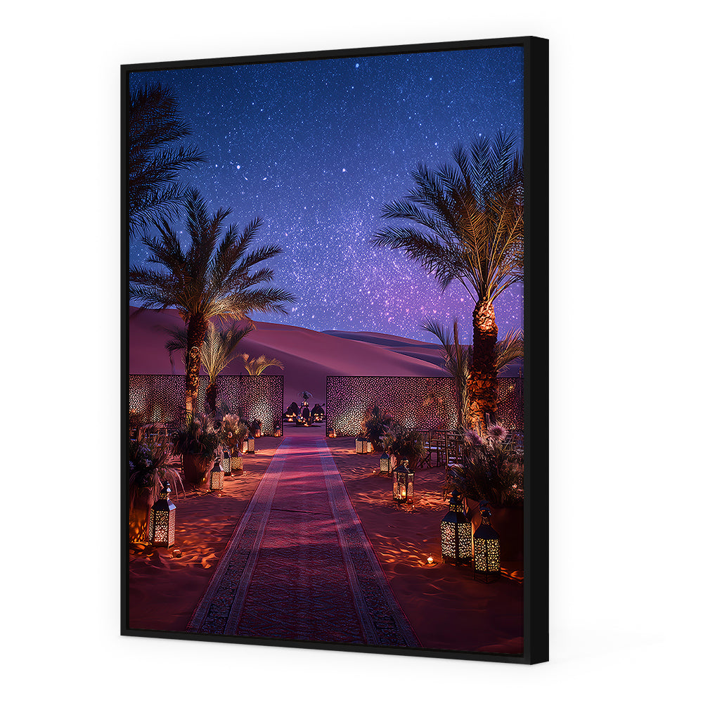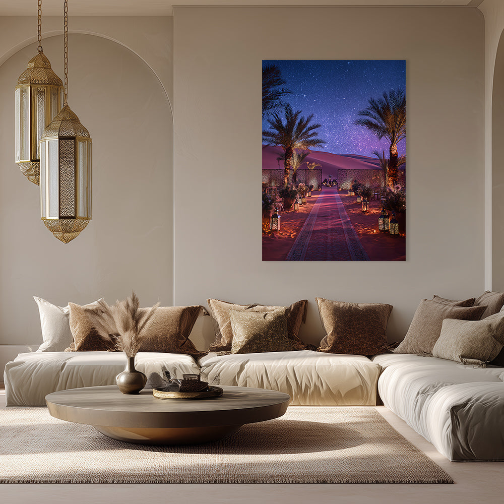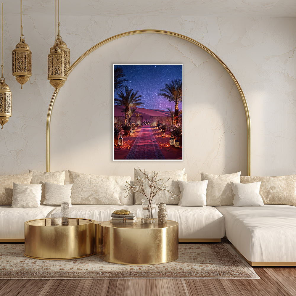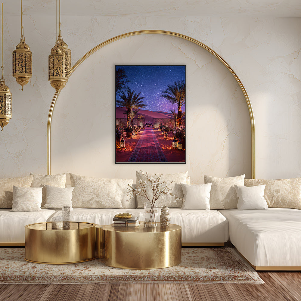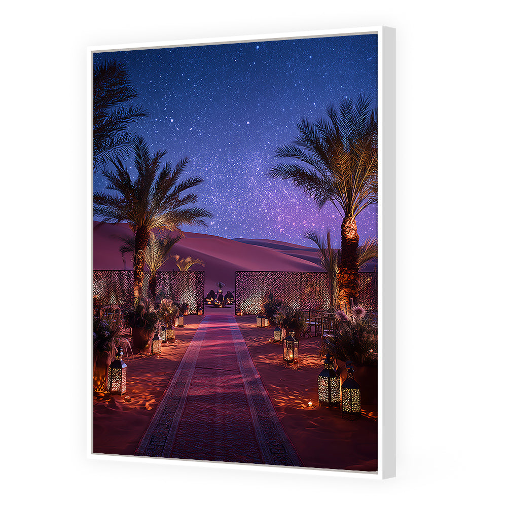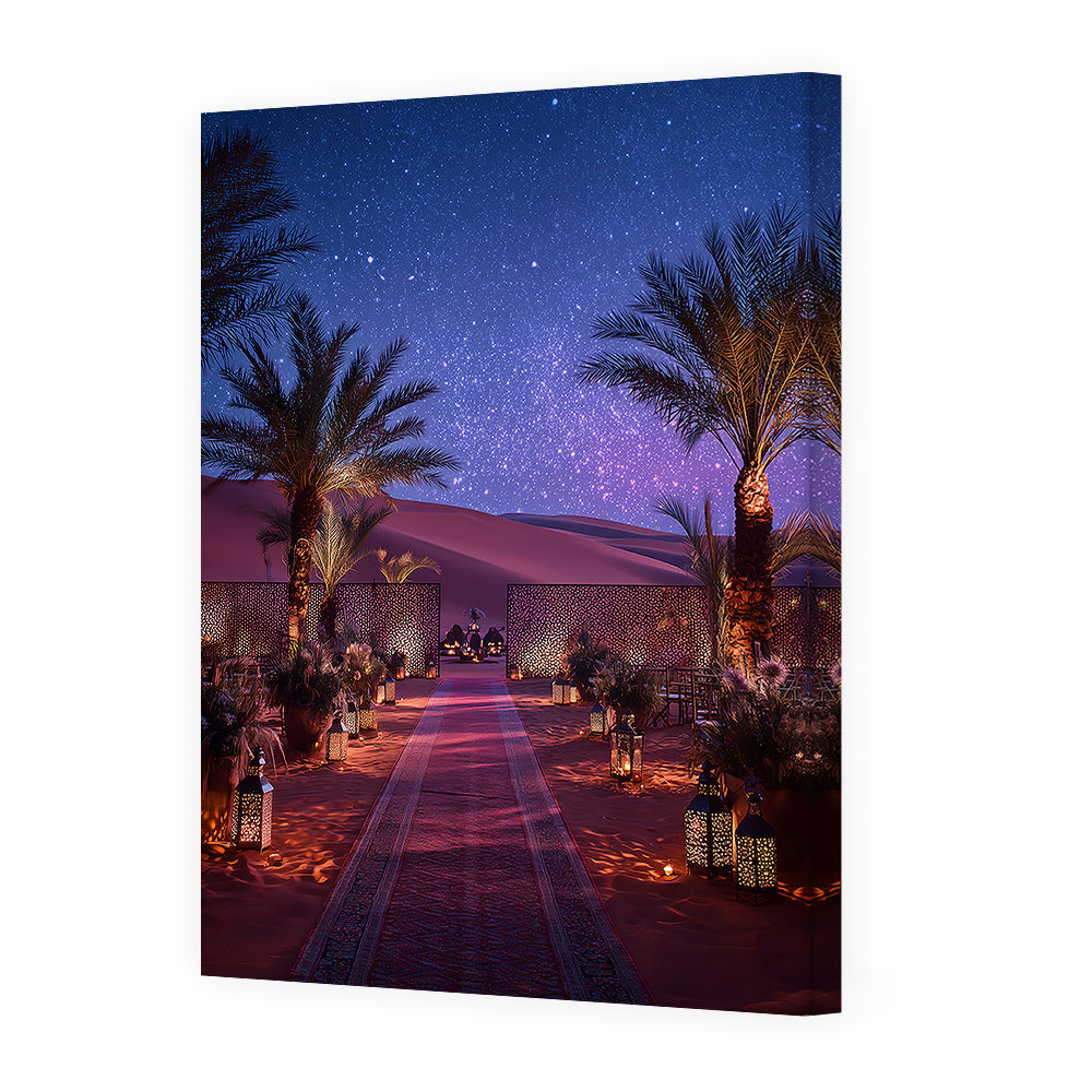 Une scène magique du désert sous un ciel étoilé, illuminée par des lanternes.