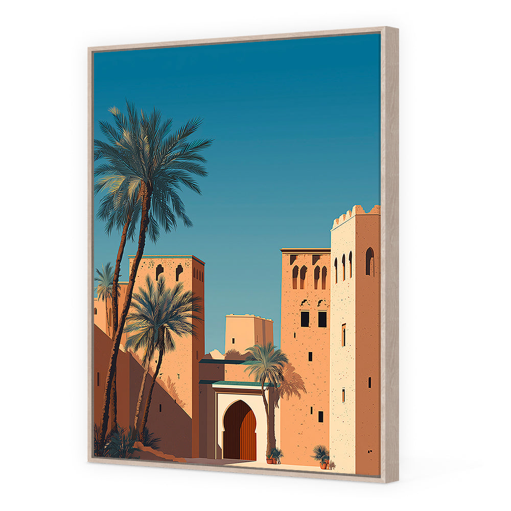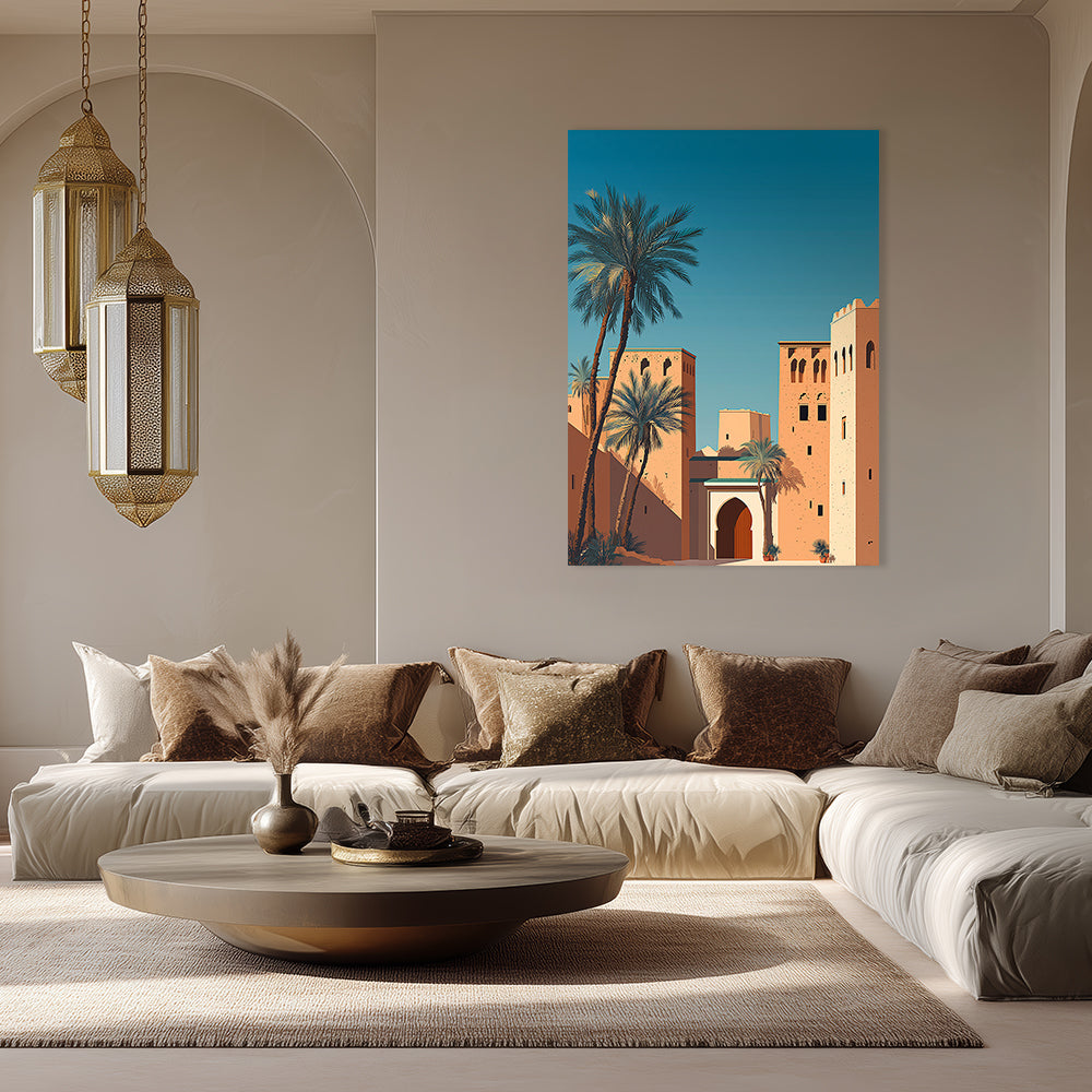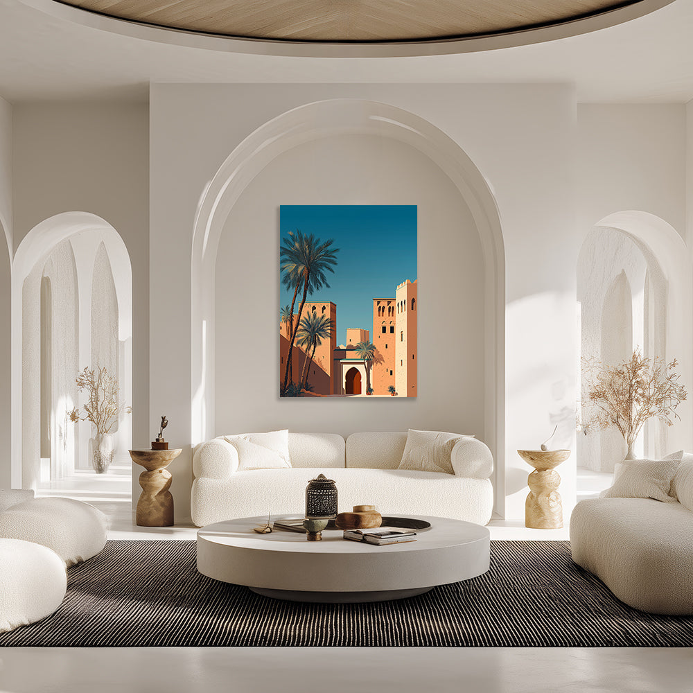 Évadez-vous dans un paysage ensoleillé, mêlant architecture traditionnelle et palmiers majestueux.