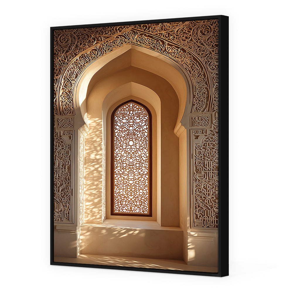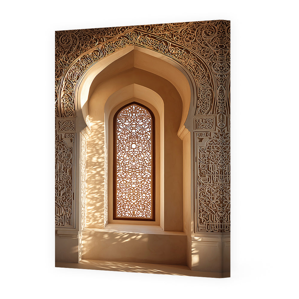 Élégante fenêtre ornée de motifs arabesques, baignée de lumière dorée, évoque une ambiance mystique.