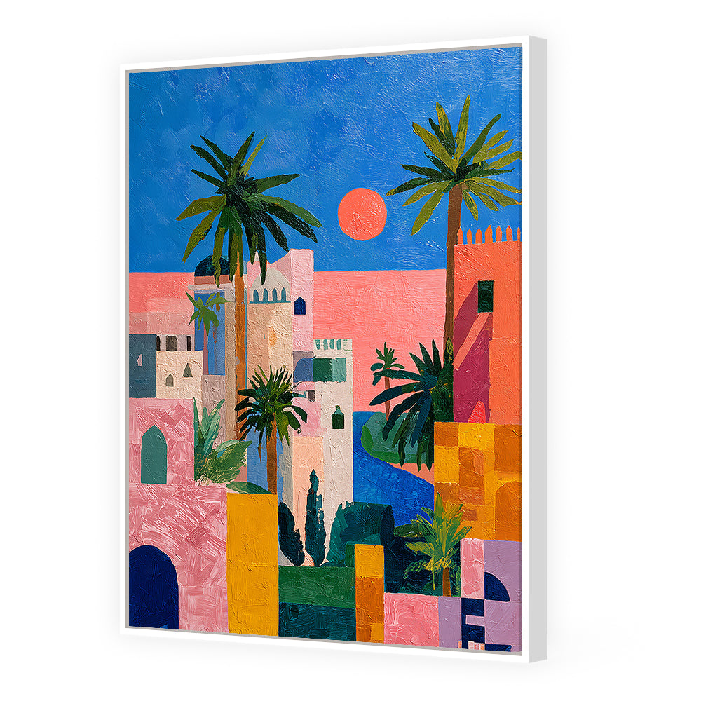 Évadez-vous dans un paysage vibrant de palmiers et d'architecture sous un ciel coloré.
