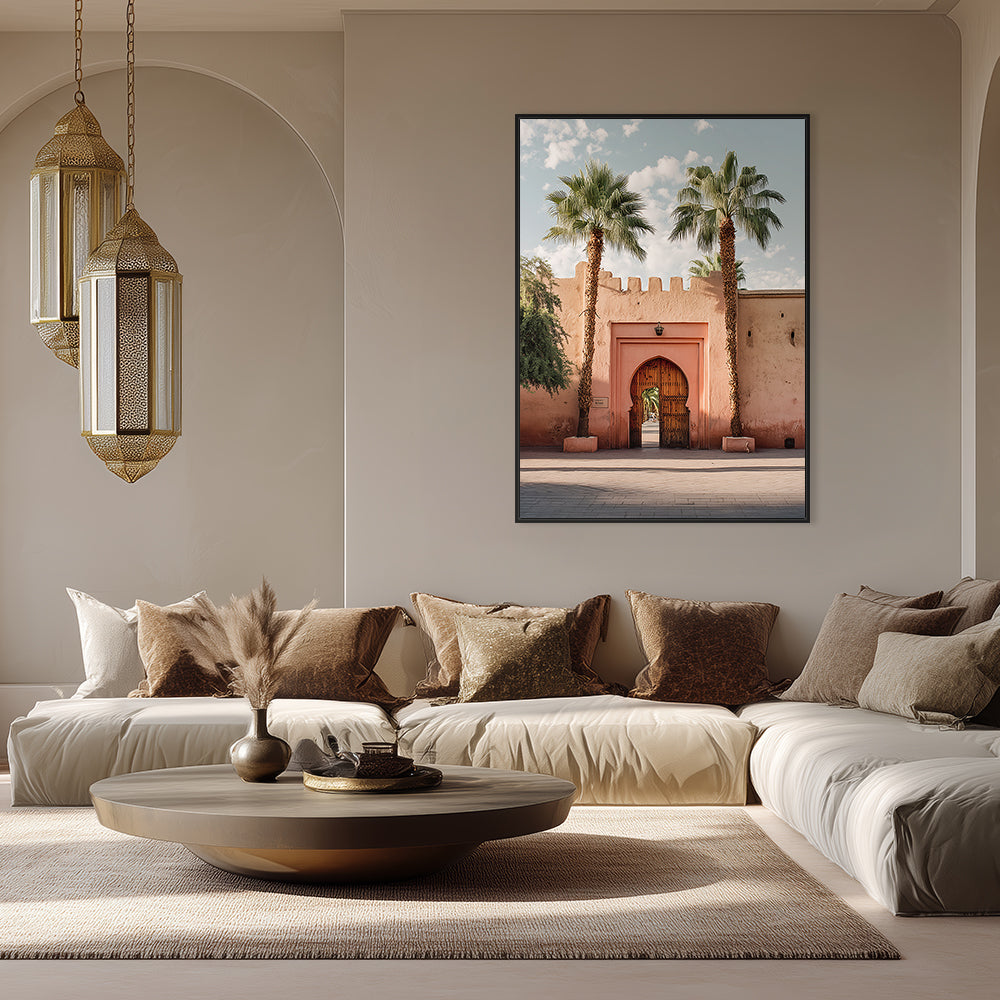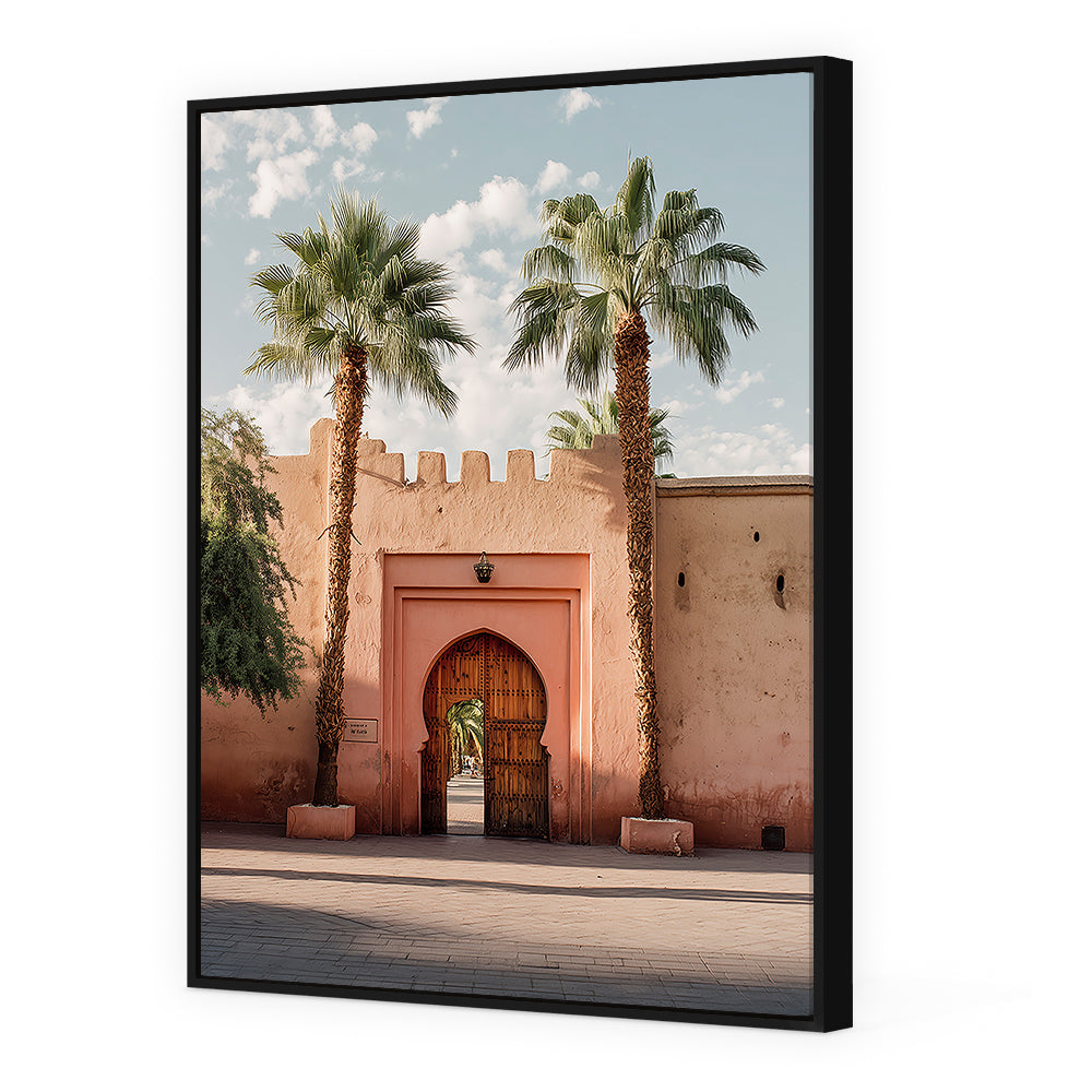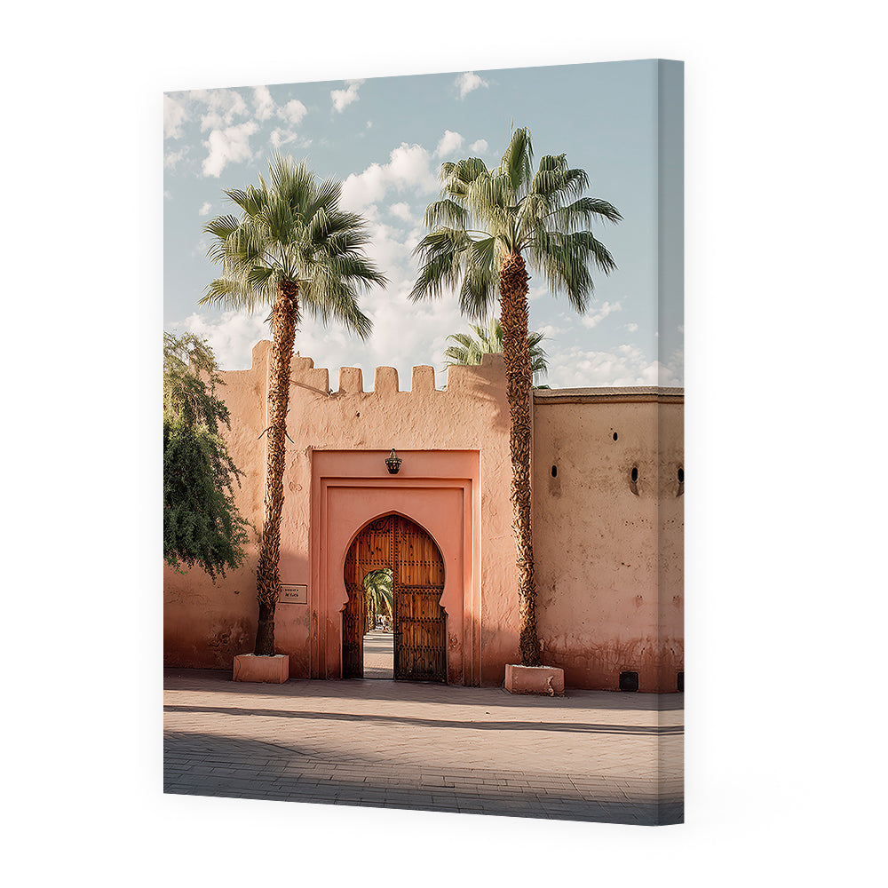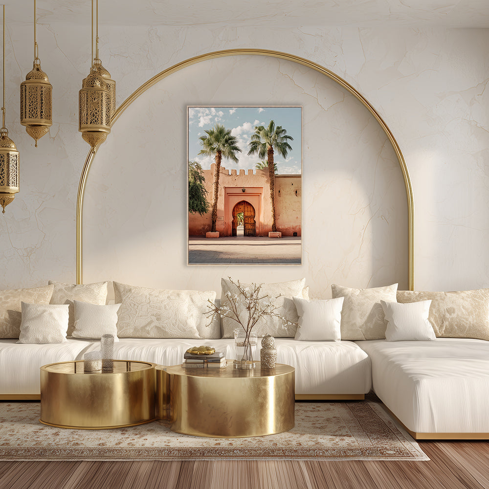 Portail majestueux encadré de palmiers sous un ciel bleu, évoquant l'architecture traditionnelle.