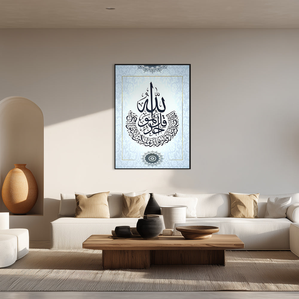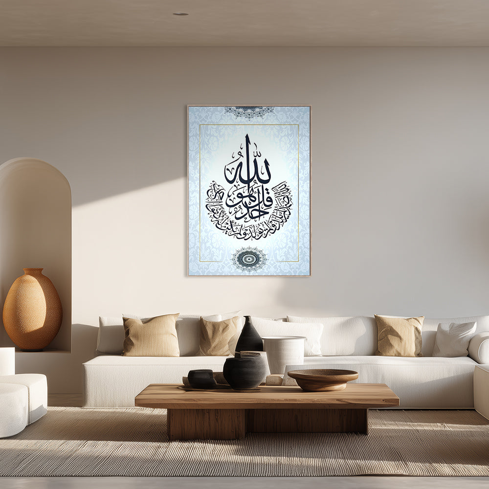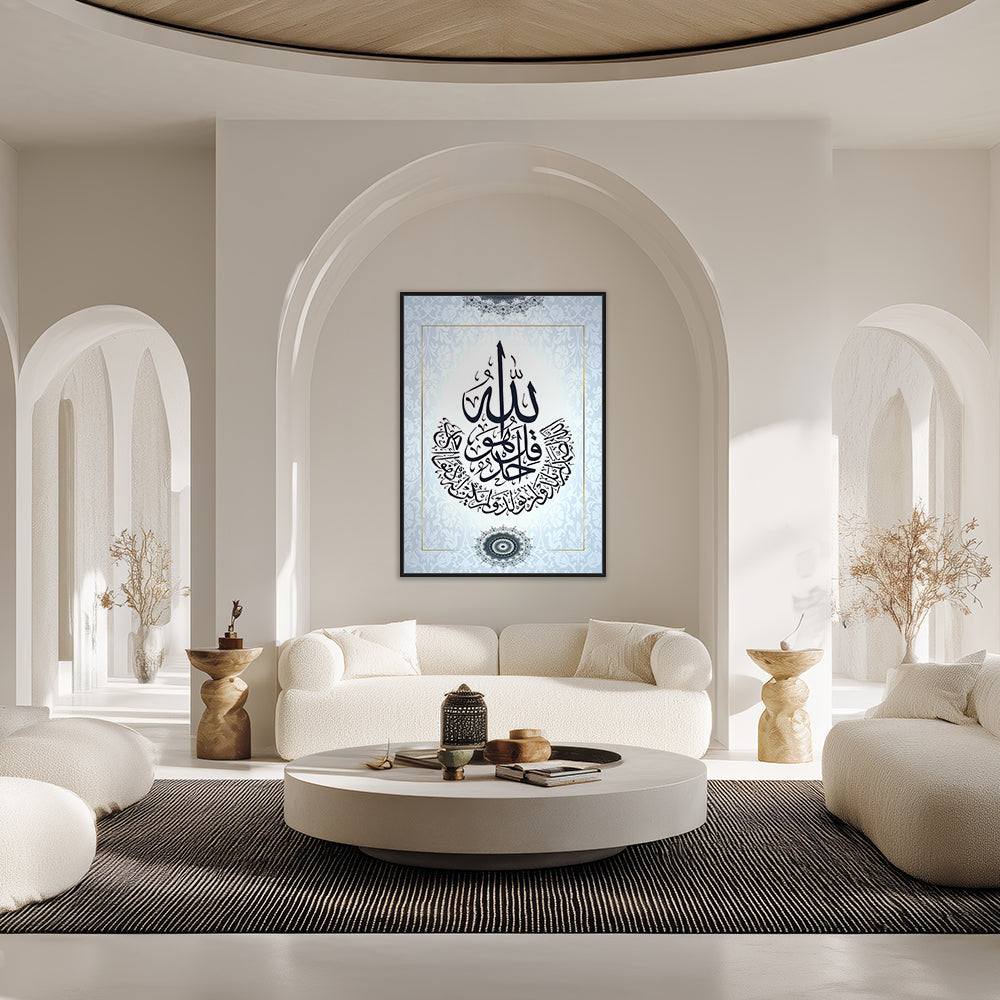 Calligraphie élégante sur fond bleu, évoquant spiritualité et tradition.