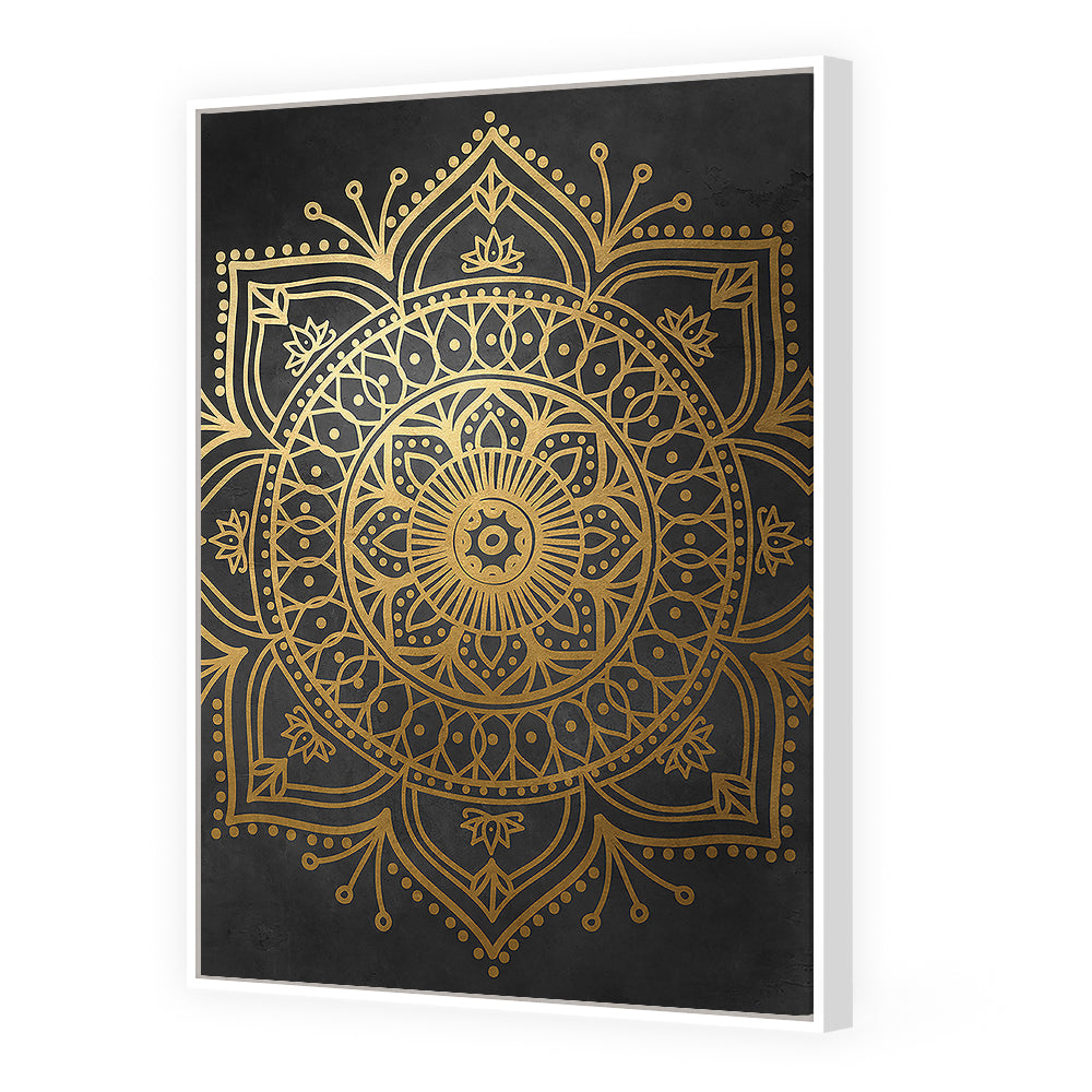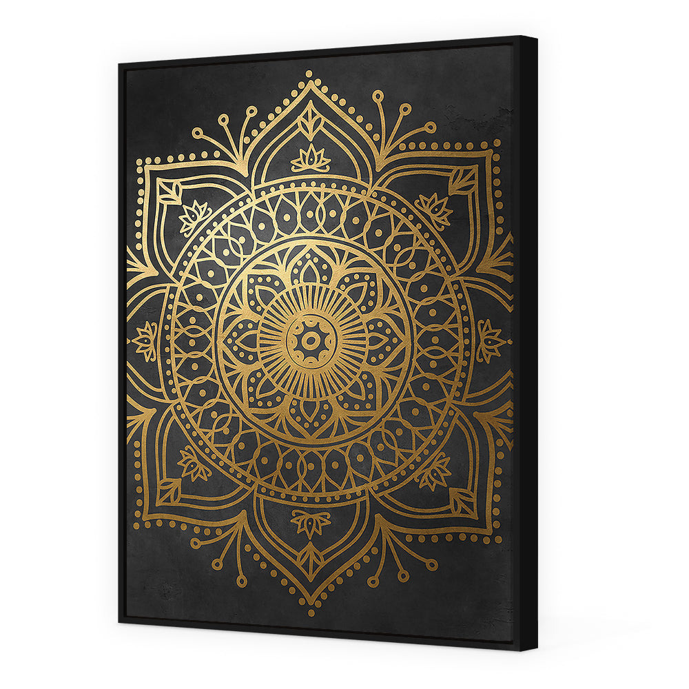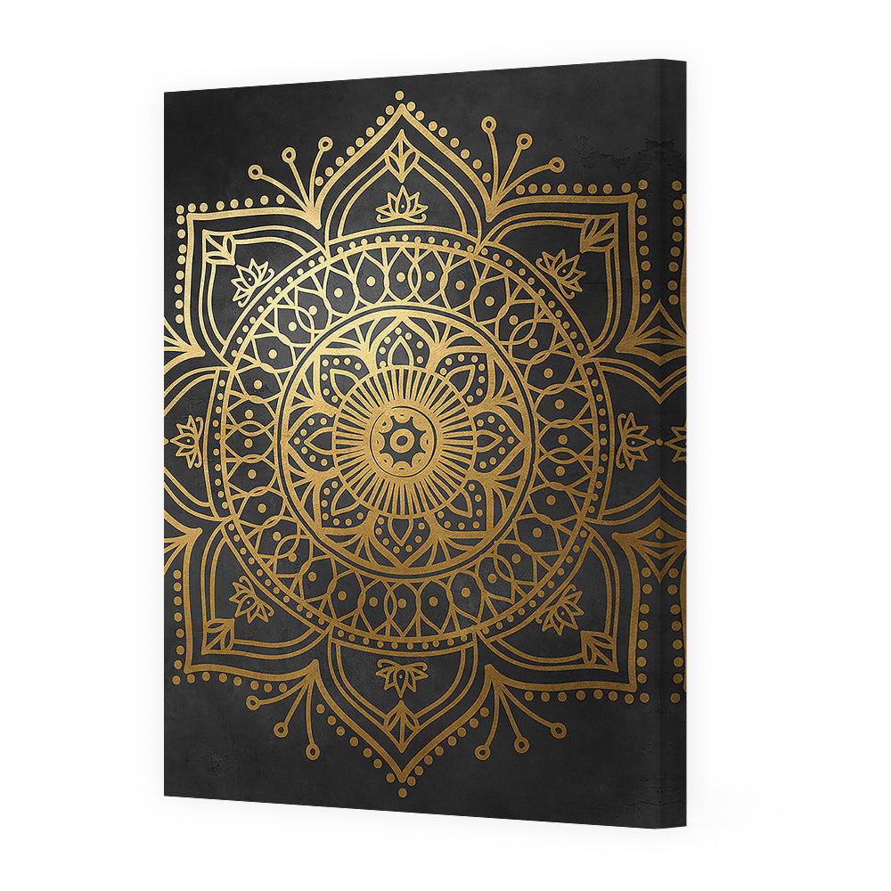 Mandala doré sur fond noir, évoquant mystère et élégance intemporelle.