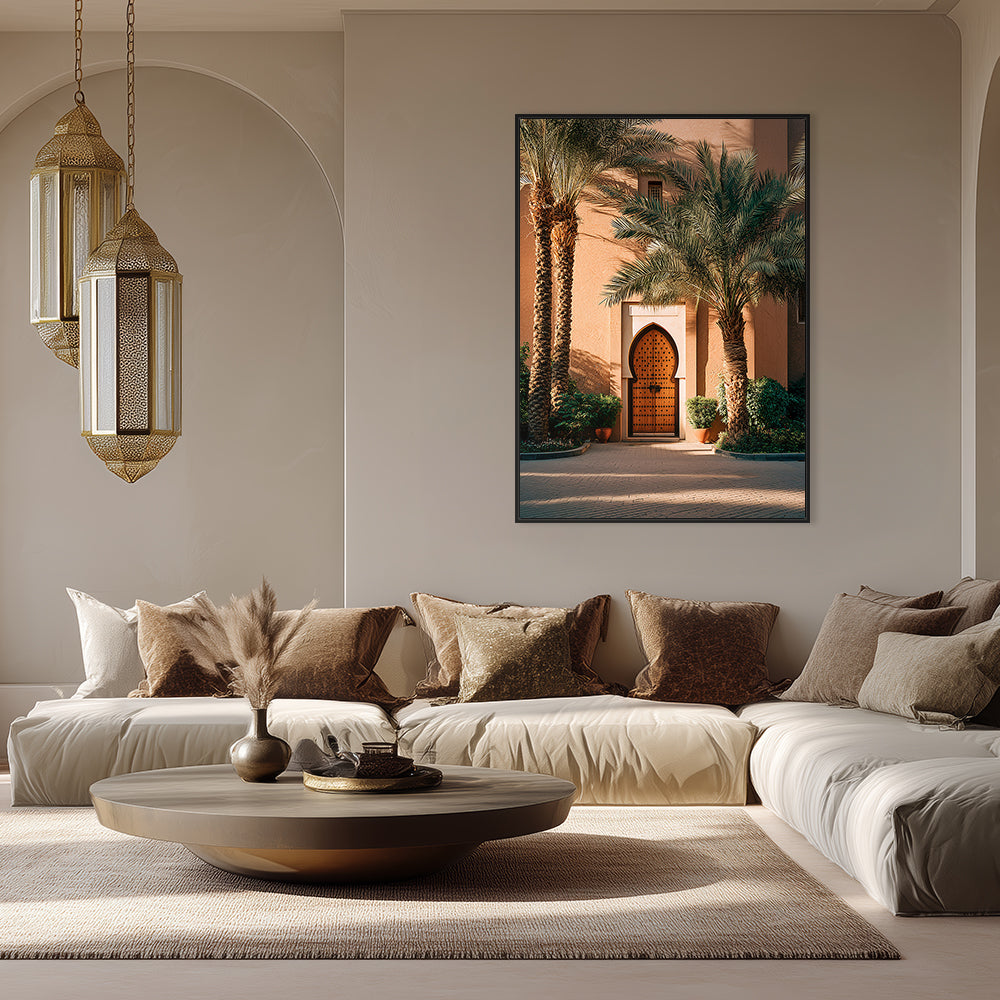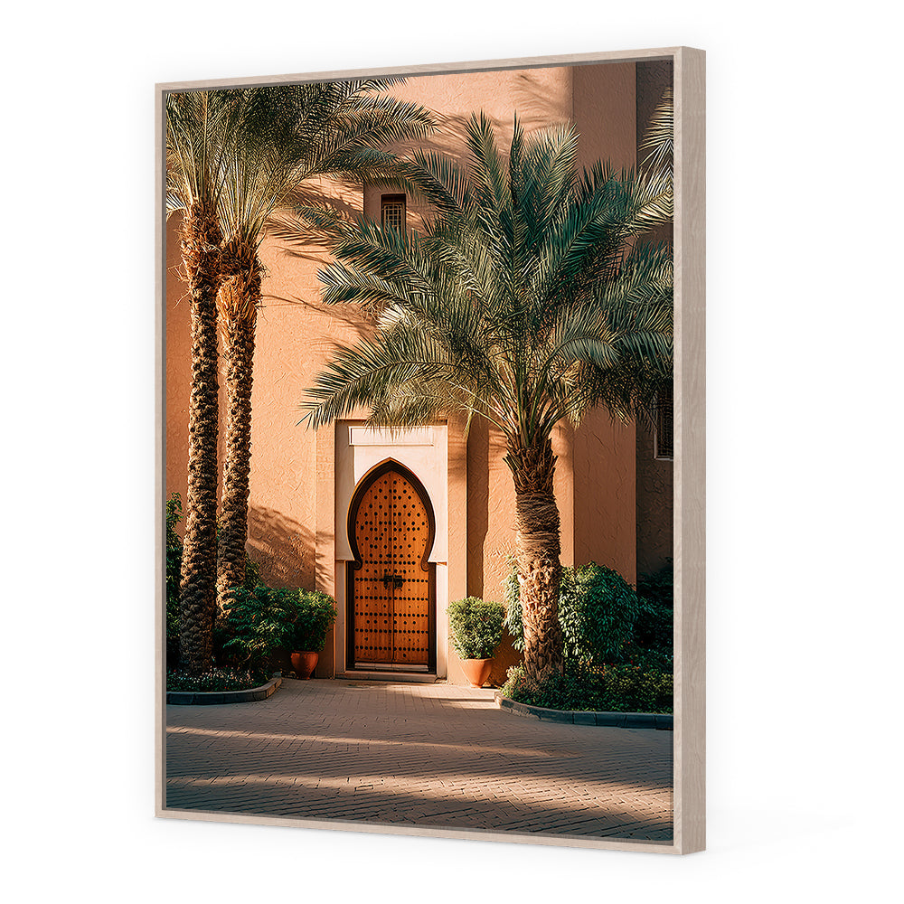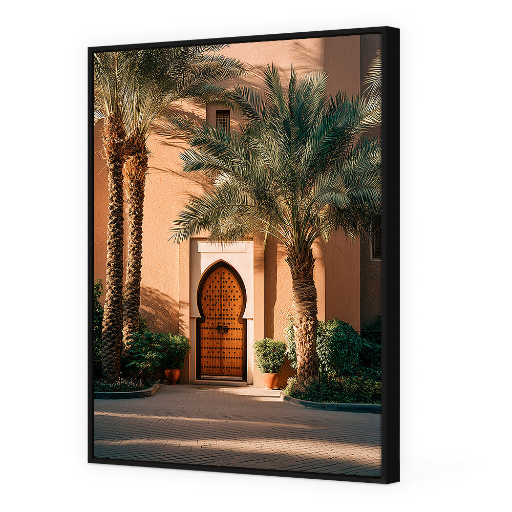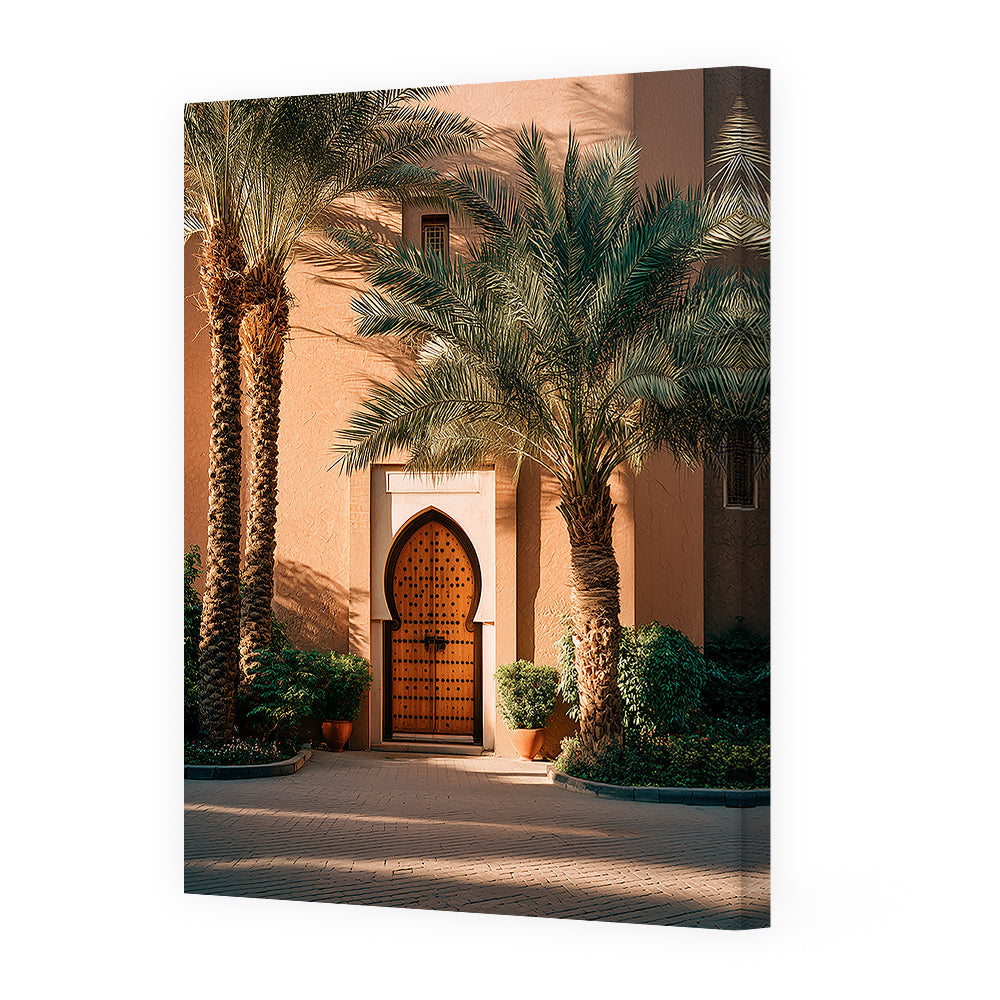 Élégant portail en bois entouré de palmiers, évoquant une ambiance orientale et chaleureuse.