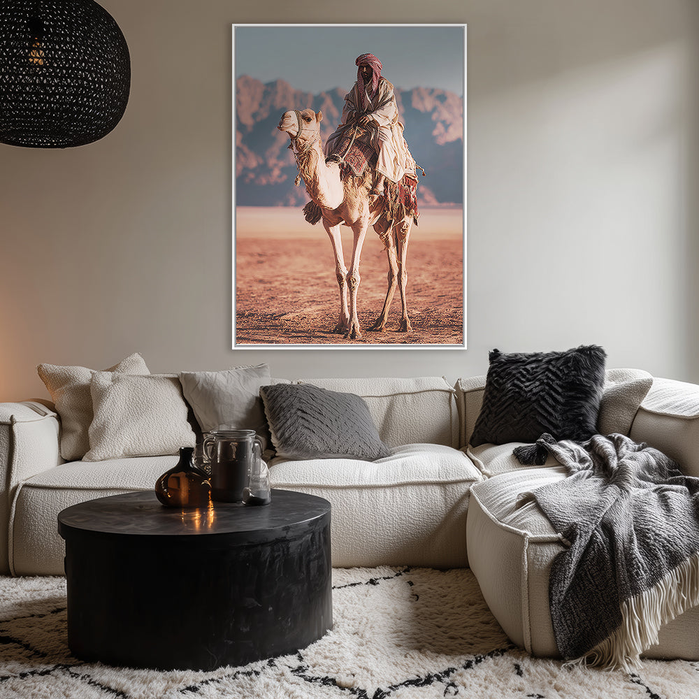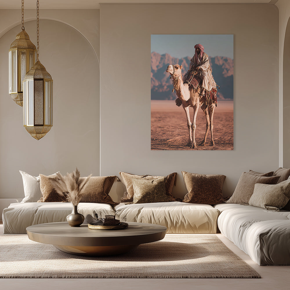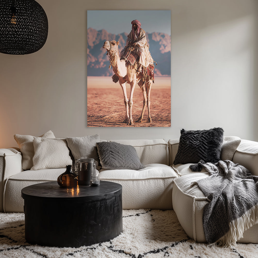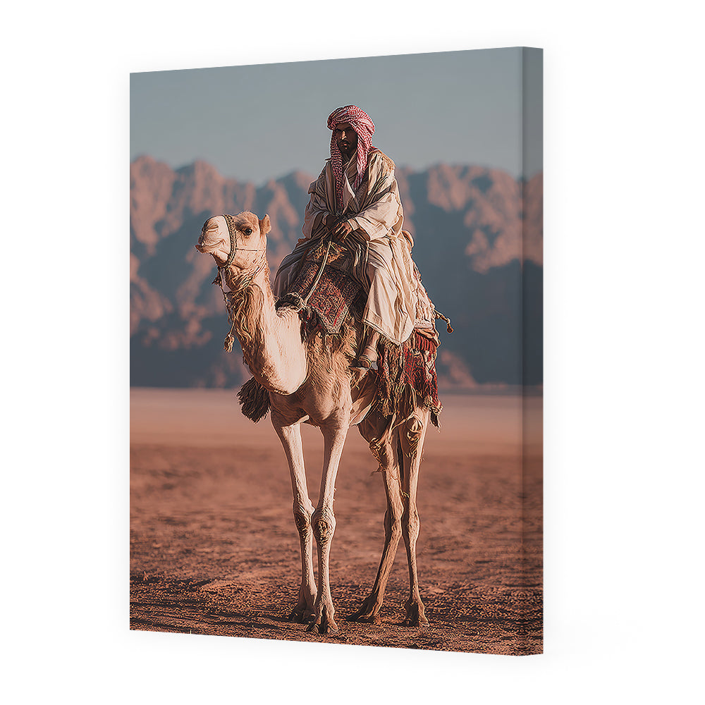 Explorez la majesté du désert avec un cavalier sur son chameau, évoquant tradition et mystère.