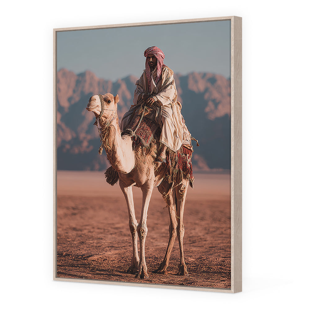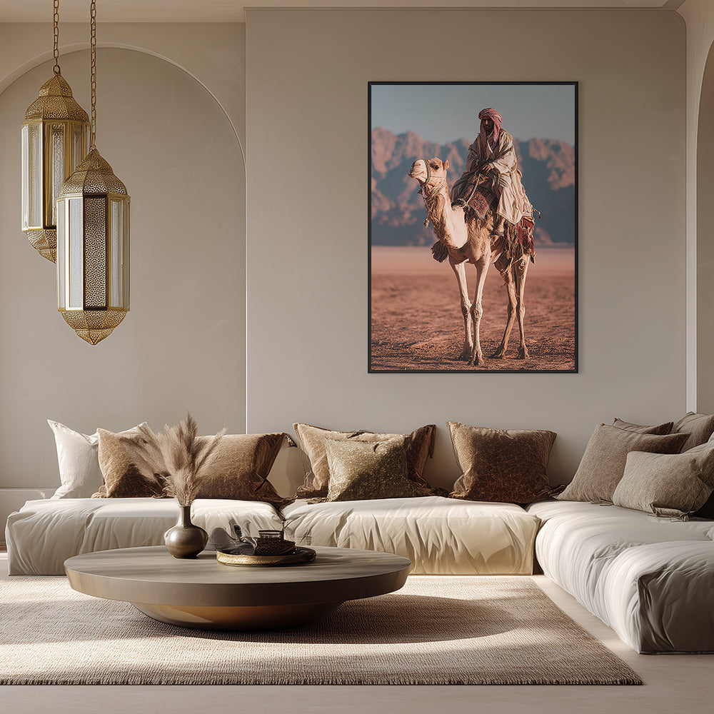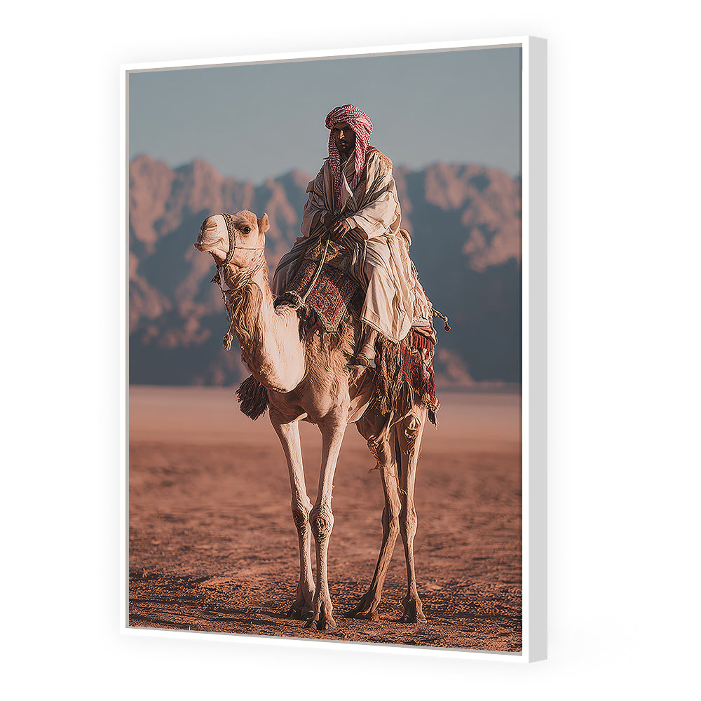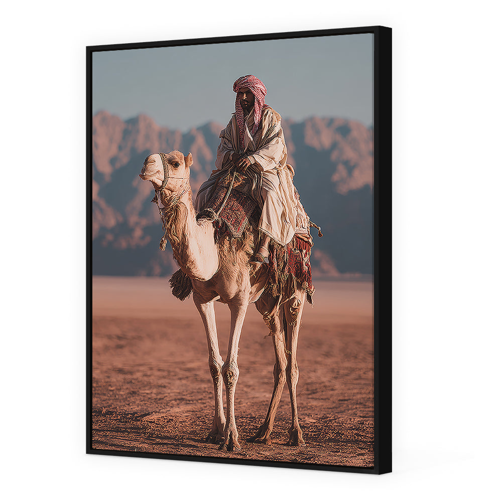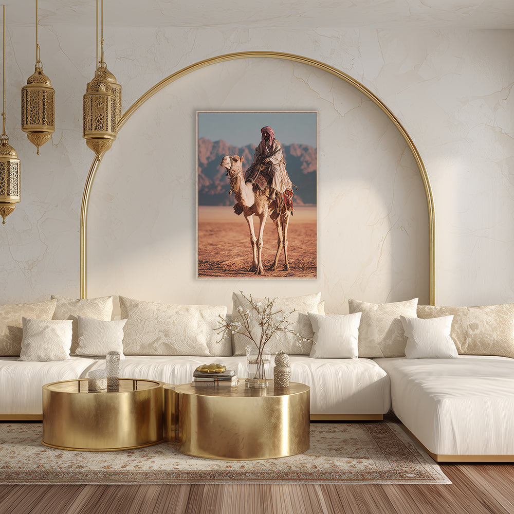 Explorez la majesté du désert avec un cavalier sur son chameau, évoquant tradition et mystère.