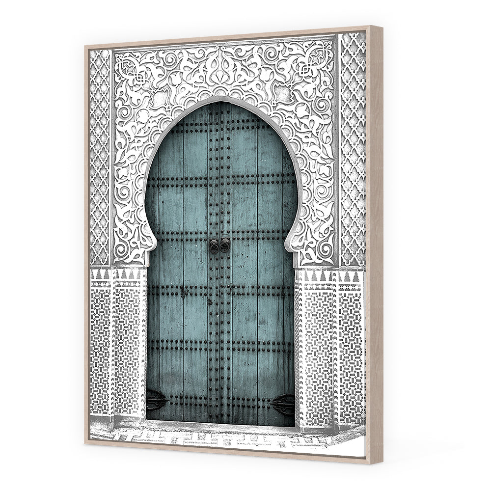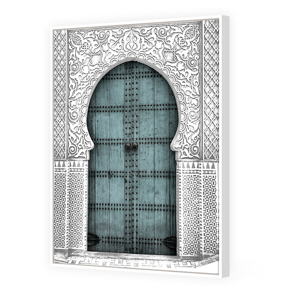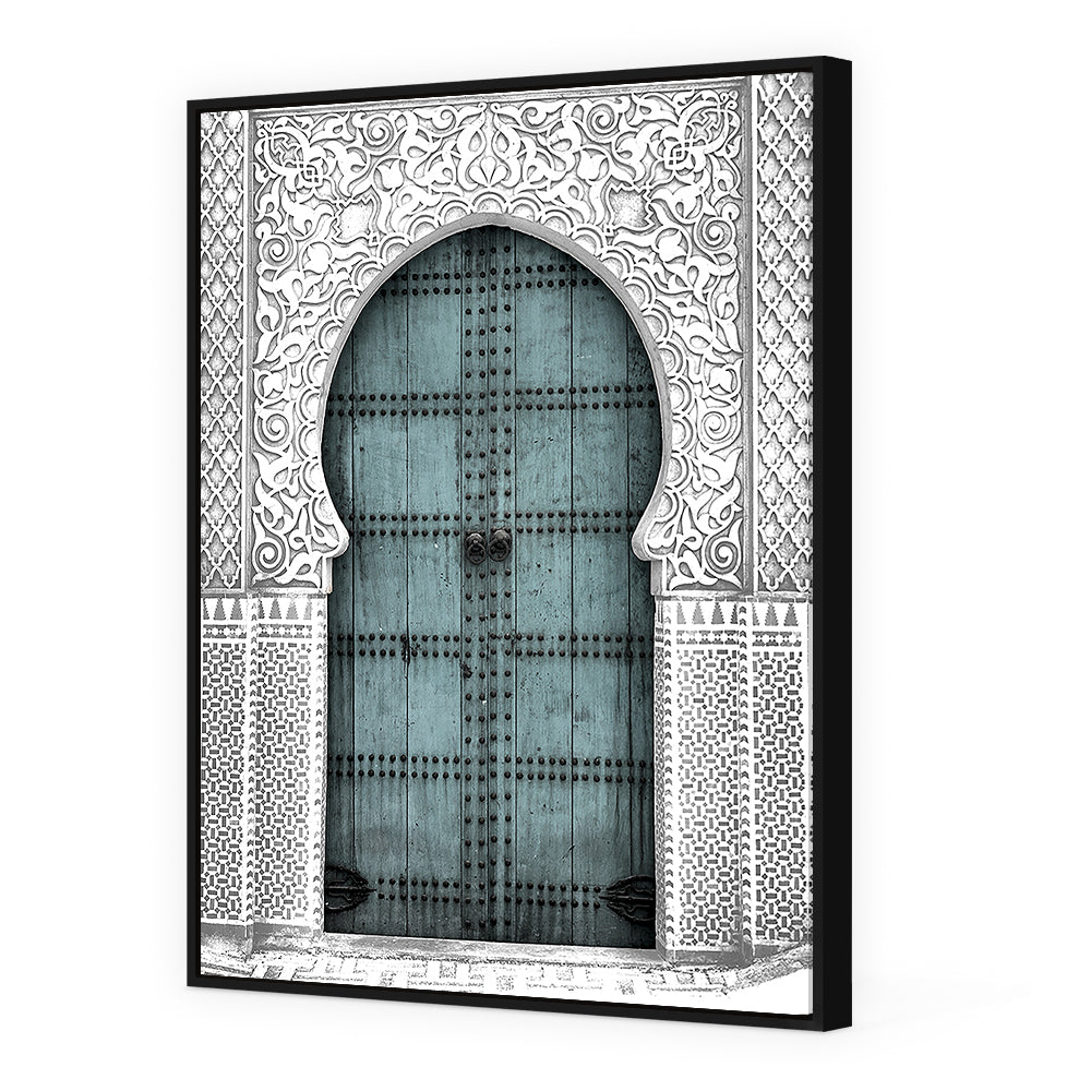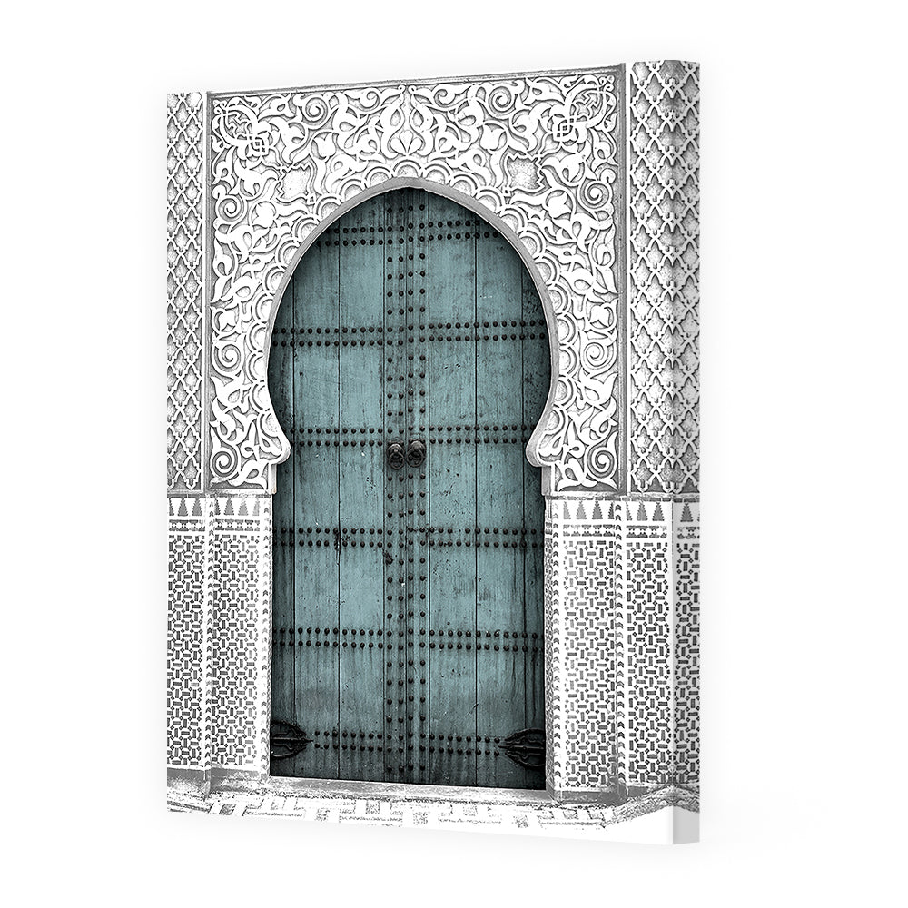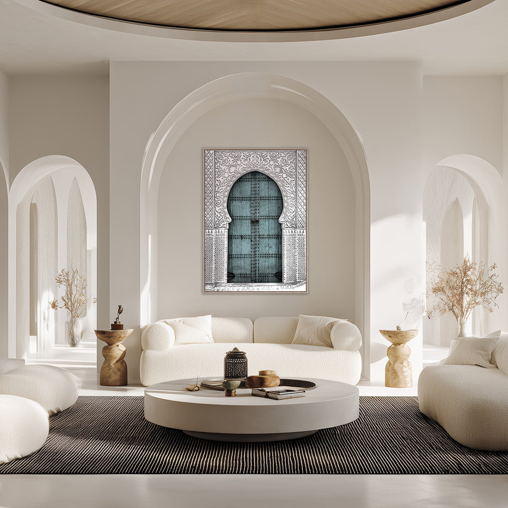 Élégante porte bleue ornée d'arabesques blanches, évoquant une ambiance traditionnelle et mystique.