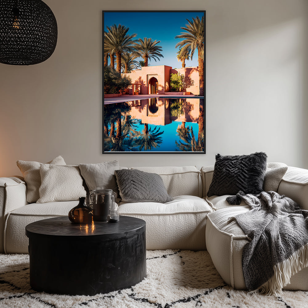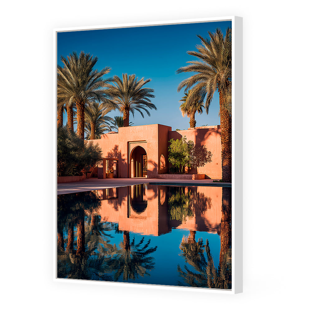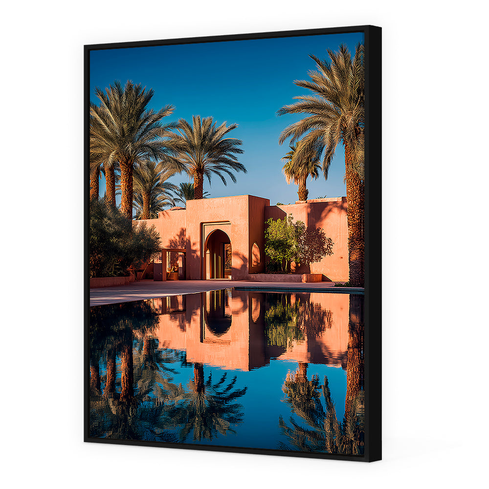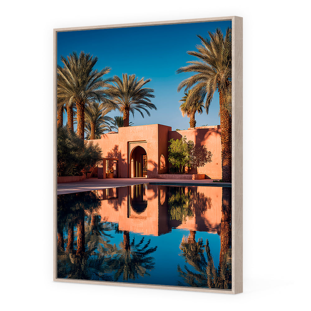 Oasis sereine avec palmiers et reflets captivants, évoquant la tranquillité du désert.