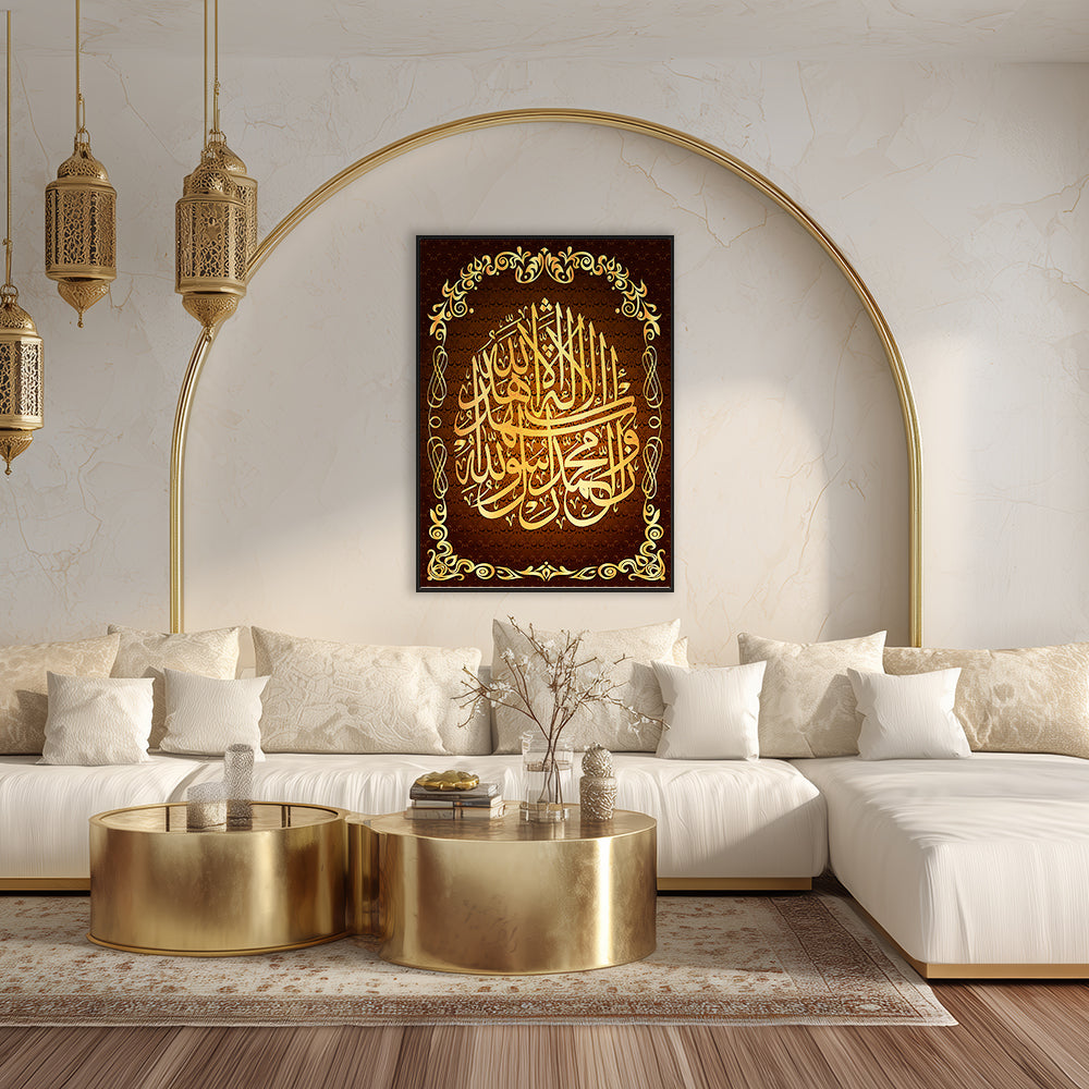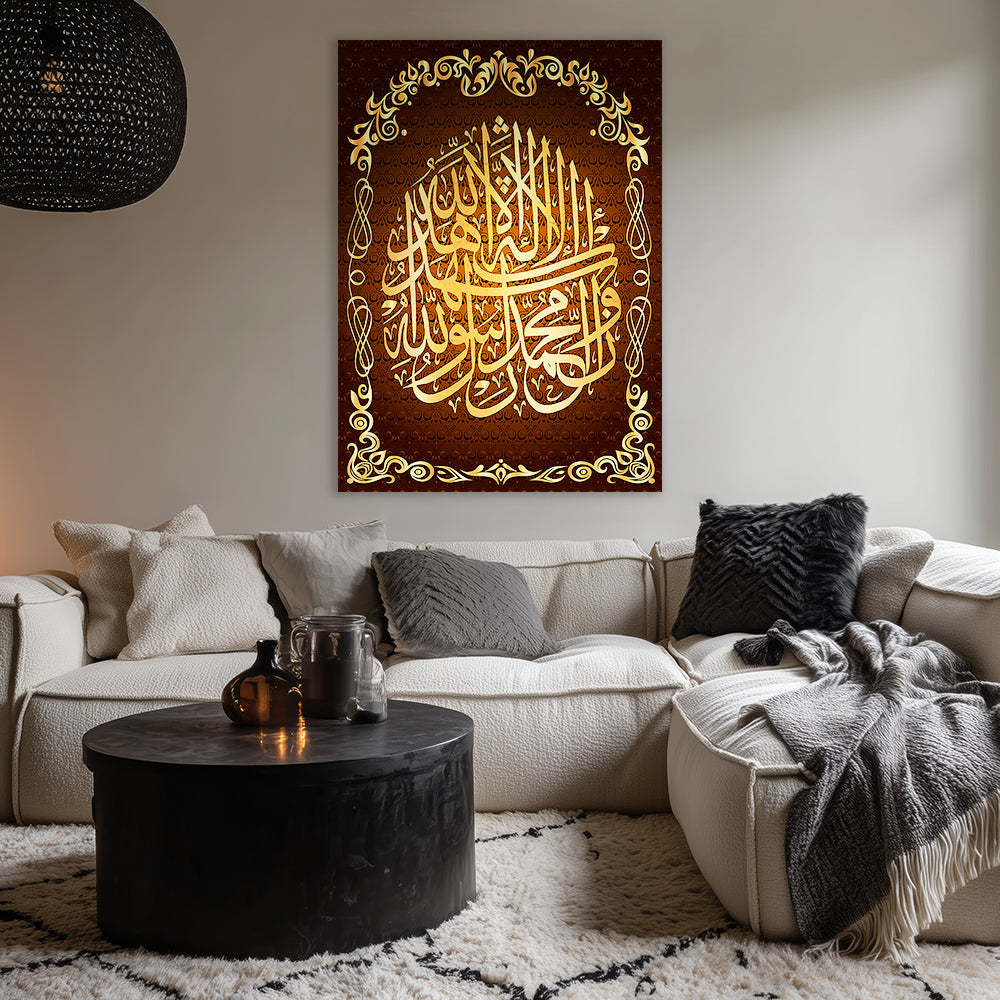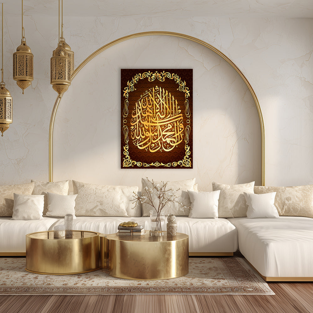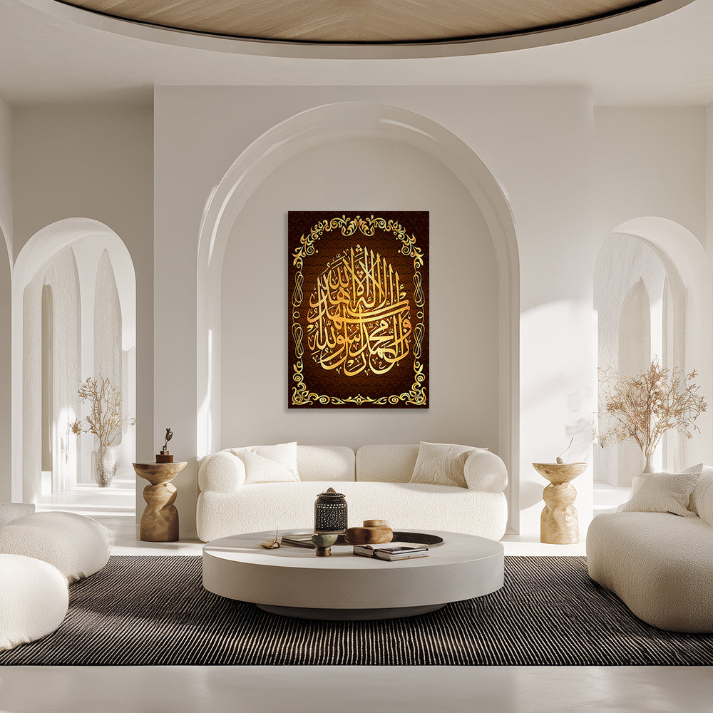 Calligraphie dorée sur fond marron, évoquant tradition et spiritualité.