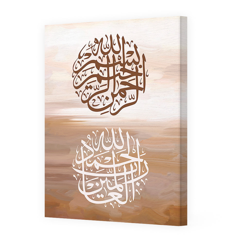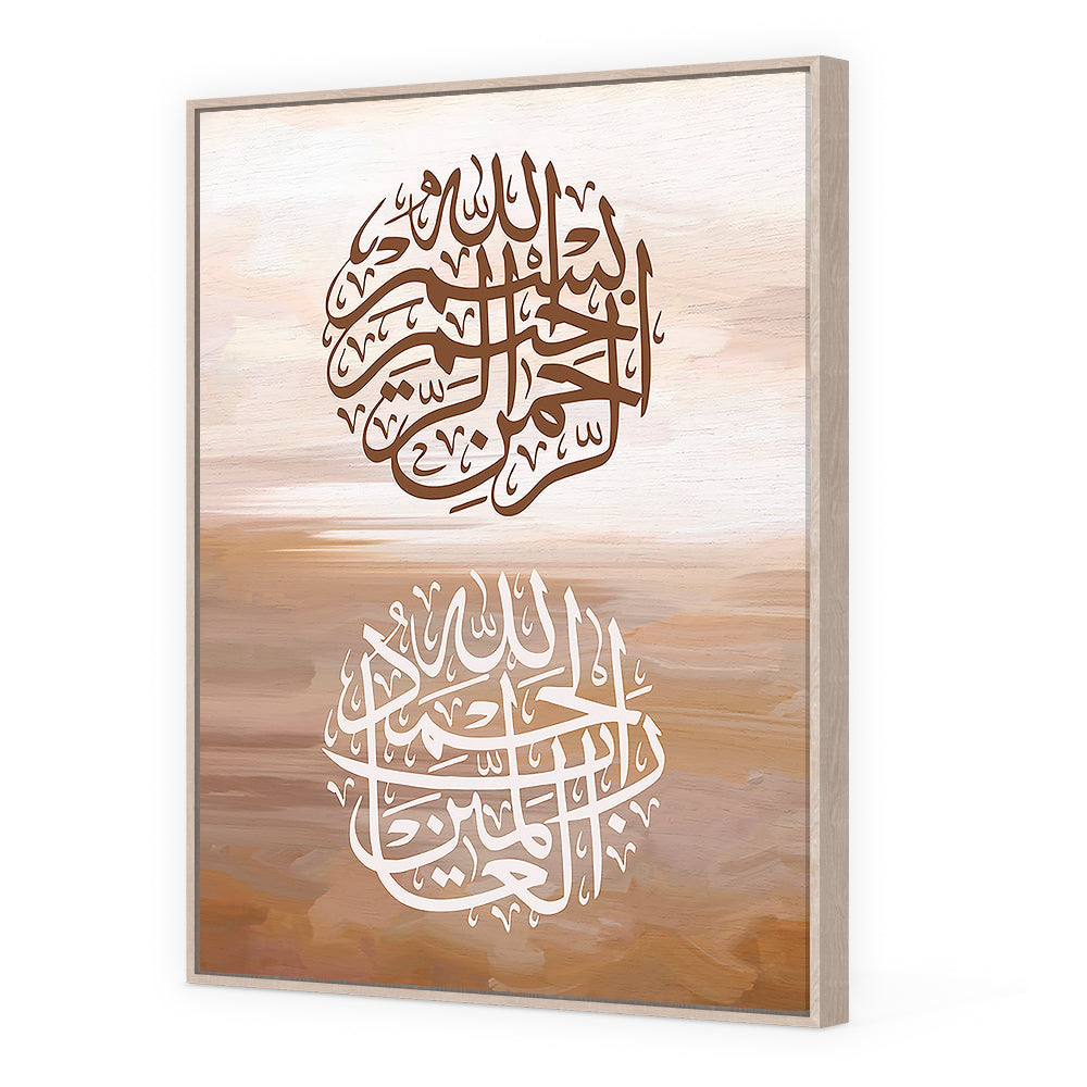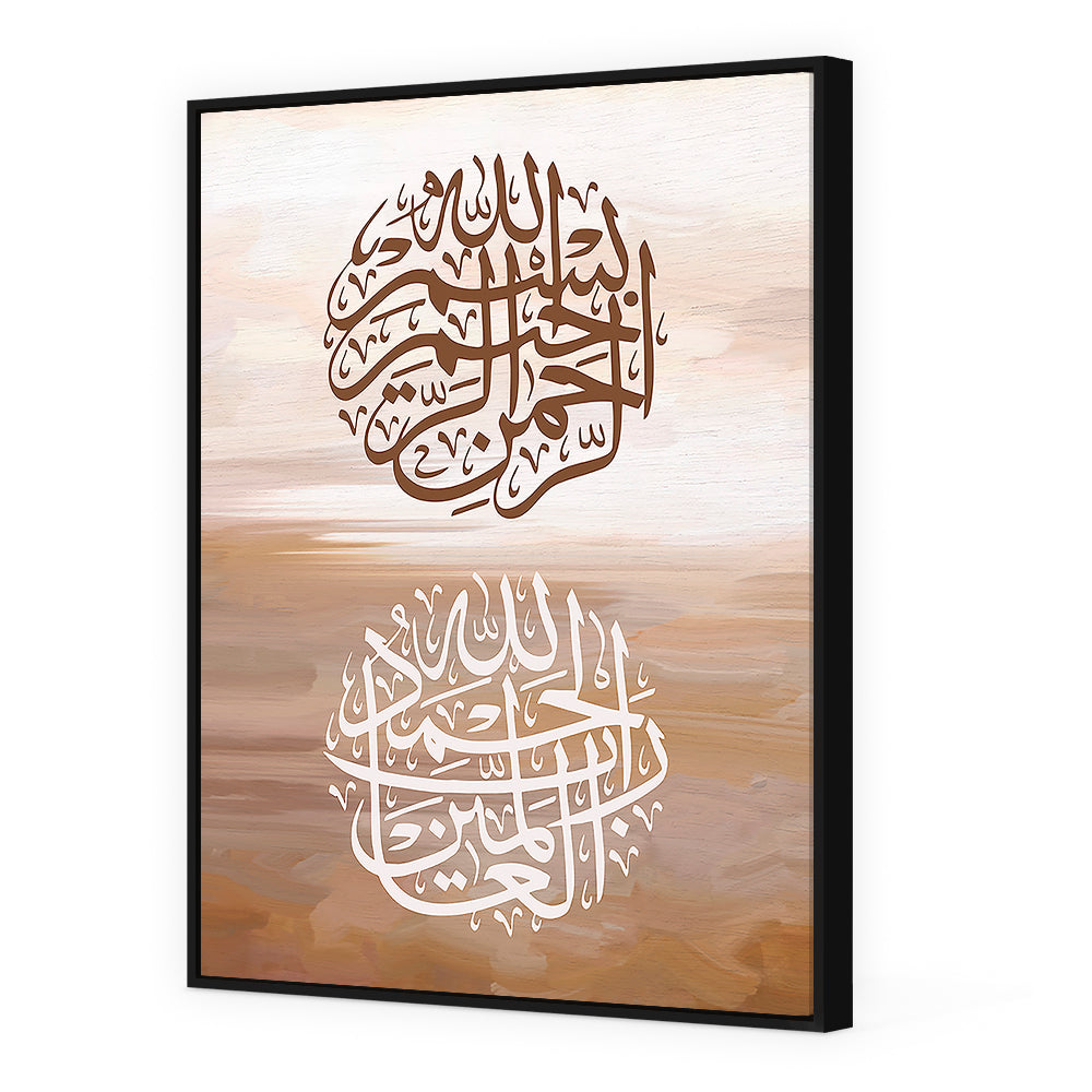 Élégante calligraphie arabe reflétée, créant une harmonie visuelle et spirituelle sur fond neutre.