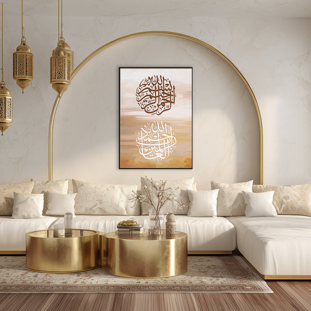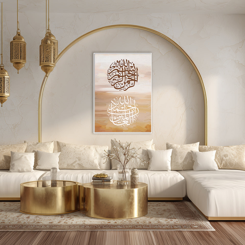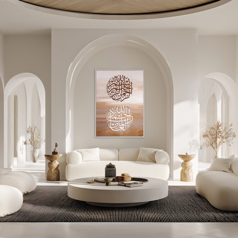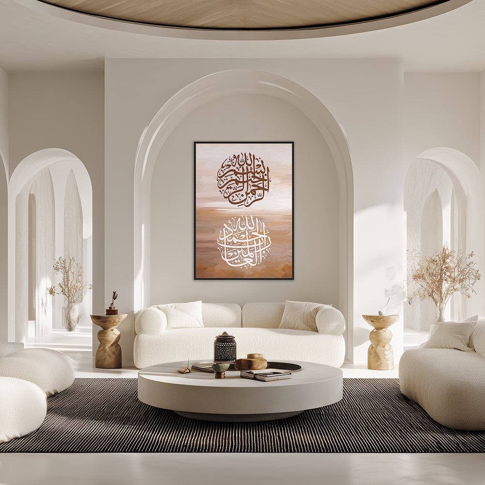 Élégante calligraphie arabe reflétée, créant une harmonie visuelle et spirituelle sur fond neutre.
