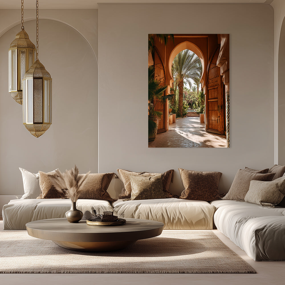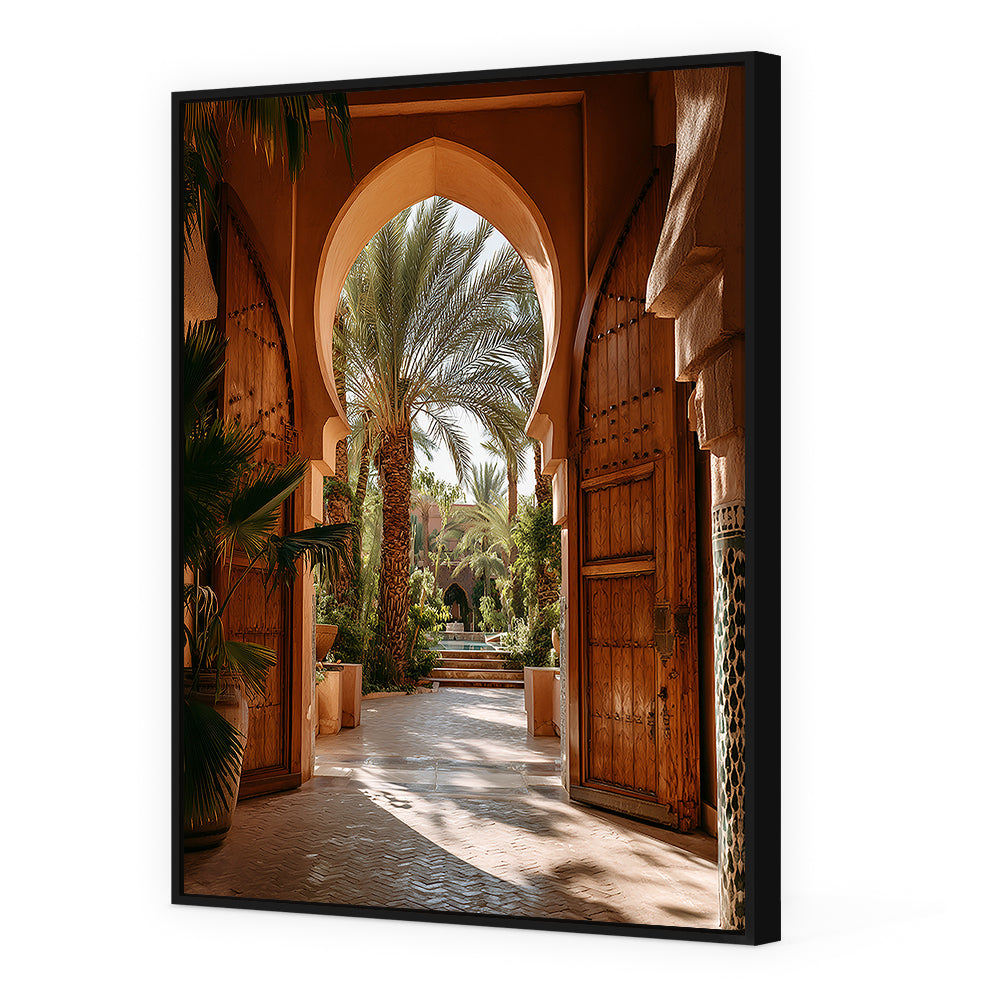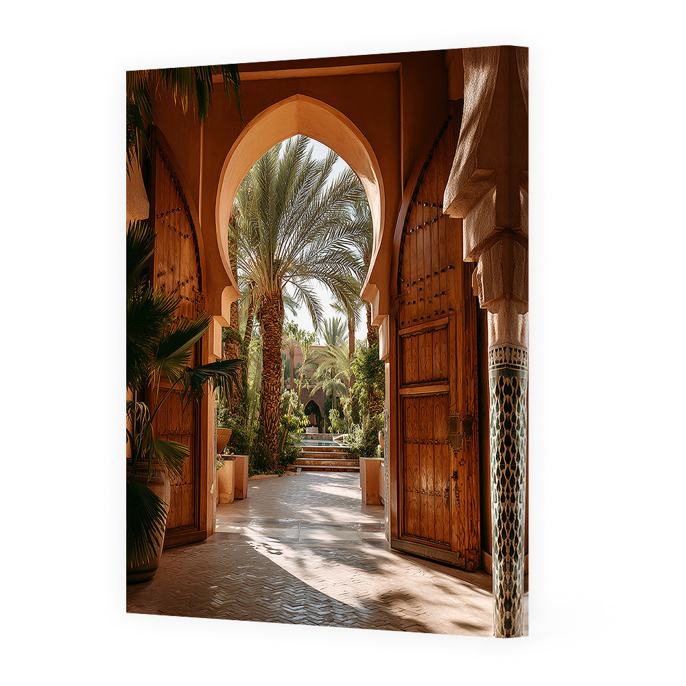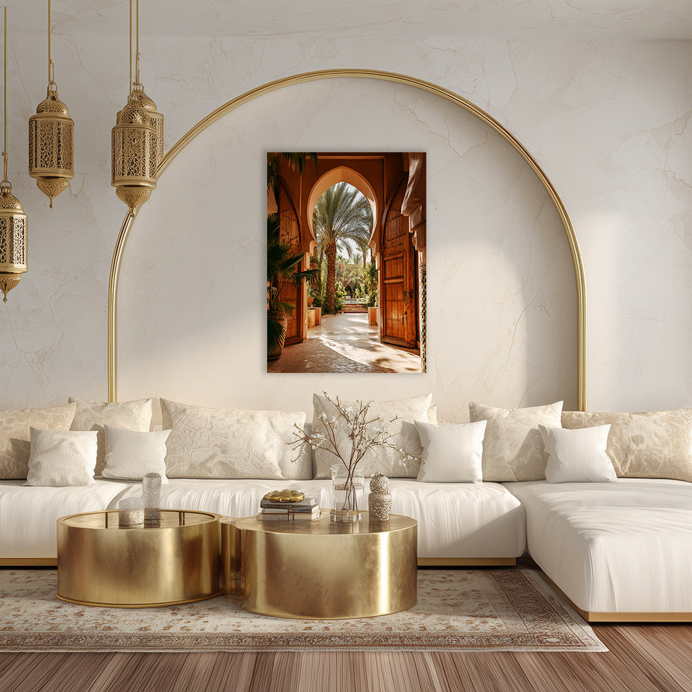 Explorez un jardin exotique à travers une arche majestueuse, baignée de lumière naturelle.