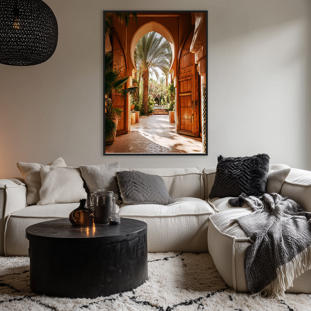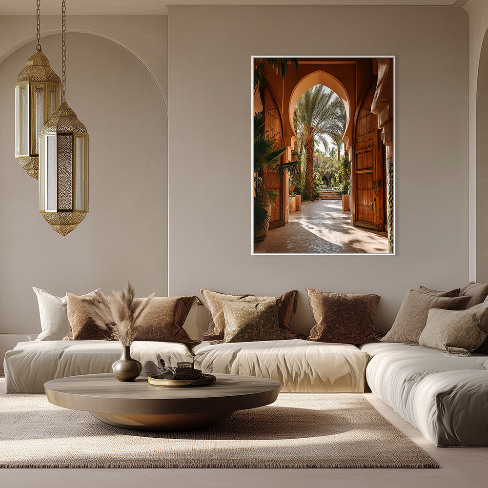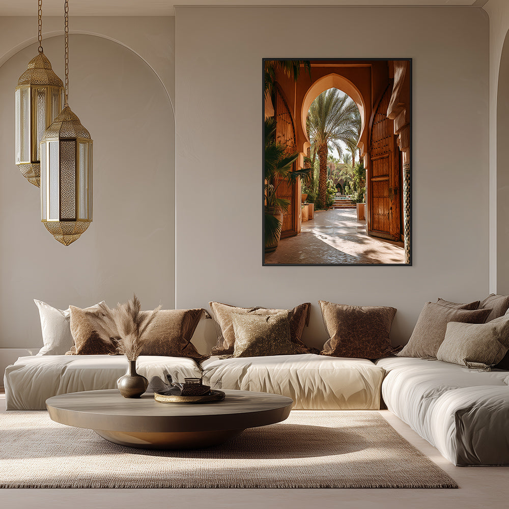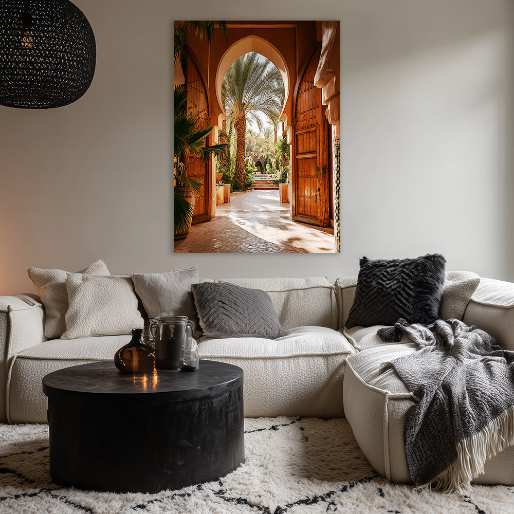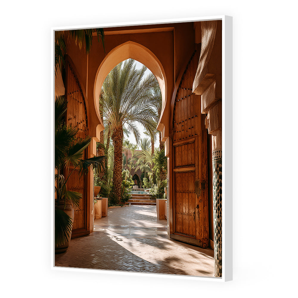 Explorez un jardin exotique à travers une arche majestueuse, baignée de lumière naturelle.