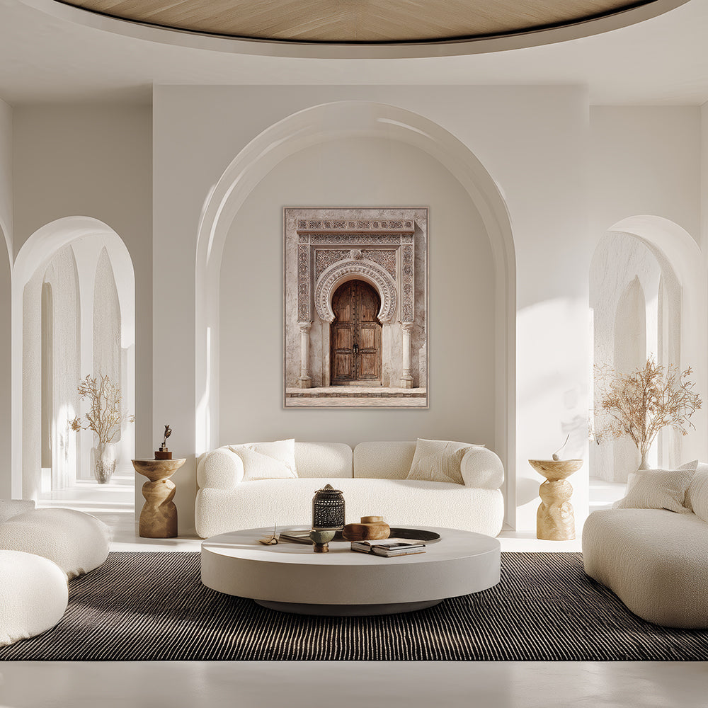 Porte ornée de motifs arabesques, évoquant une ambiance traditionnelle et spirituelle.