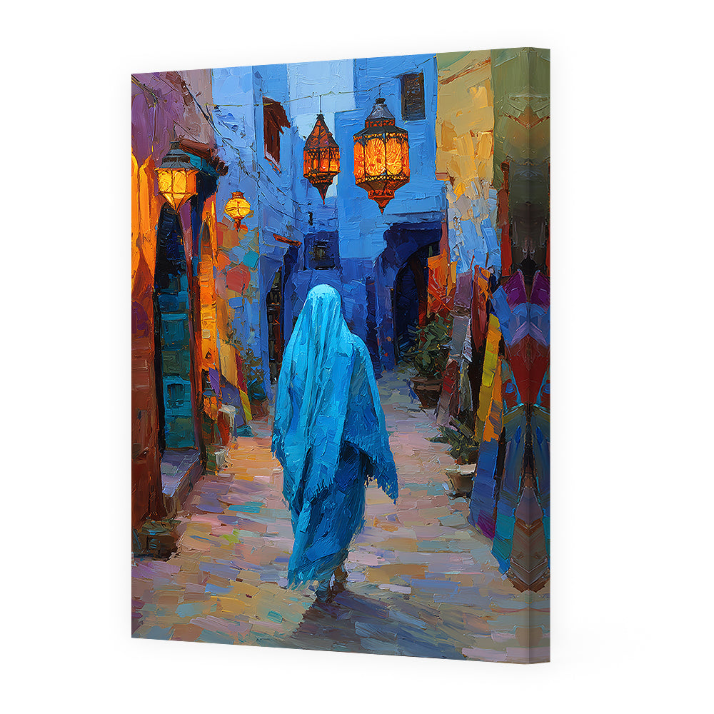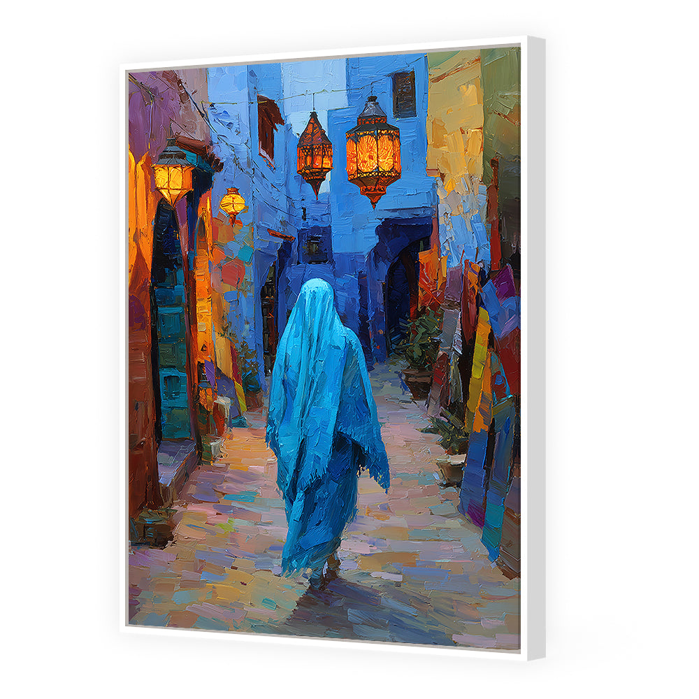 Une scène vibrante d'une ruelle illuminée, capturant l'essence d'une promenade mystique.