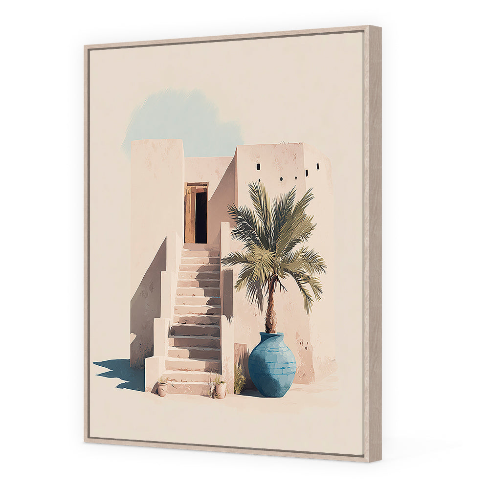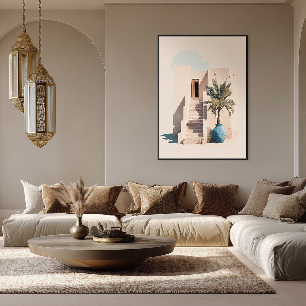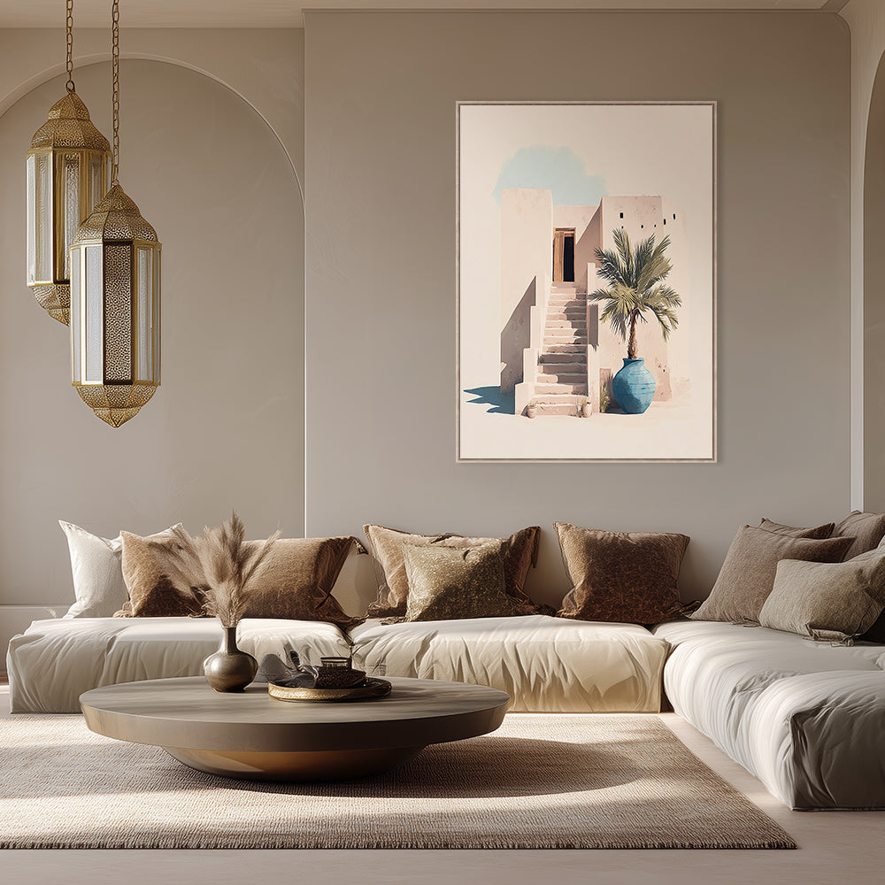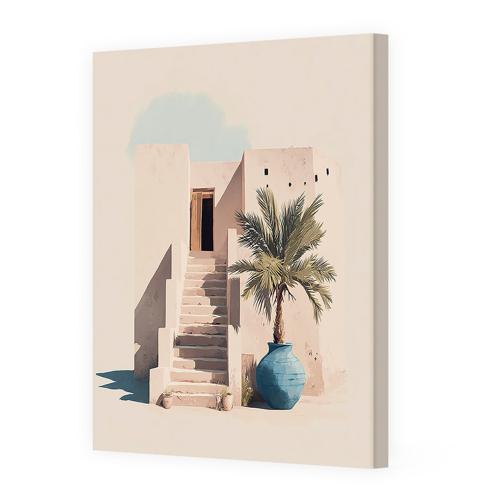 Un escalier ensoleillé mène à une porte mystérieuse, entouré de palmiers et de poteries.